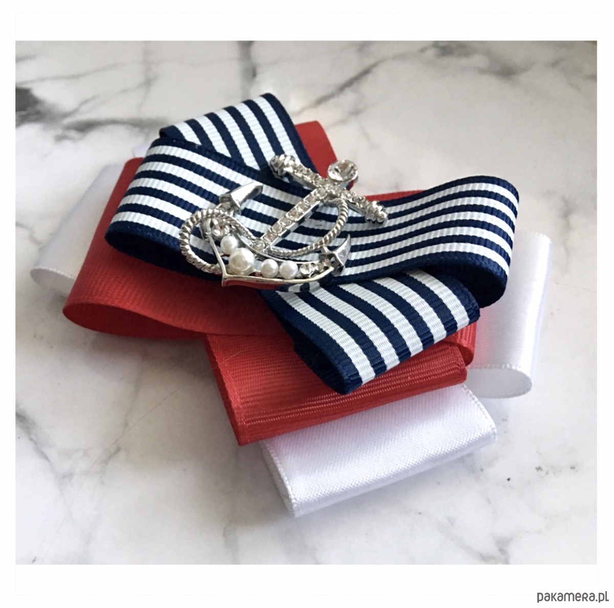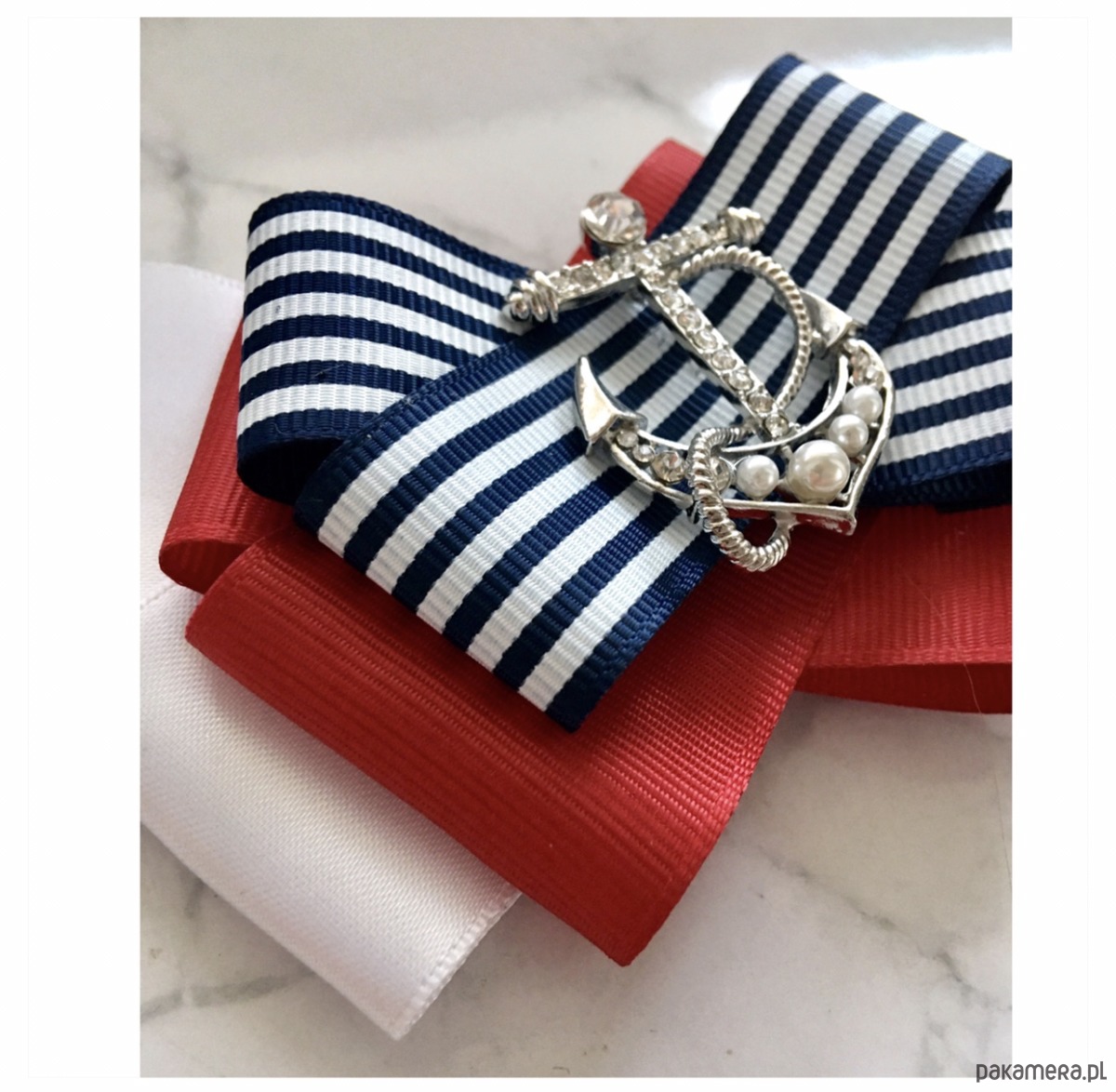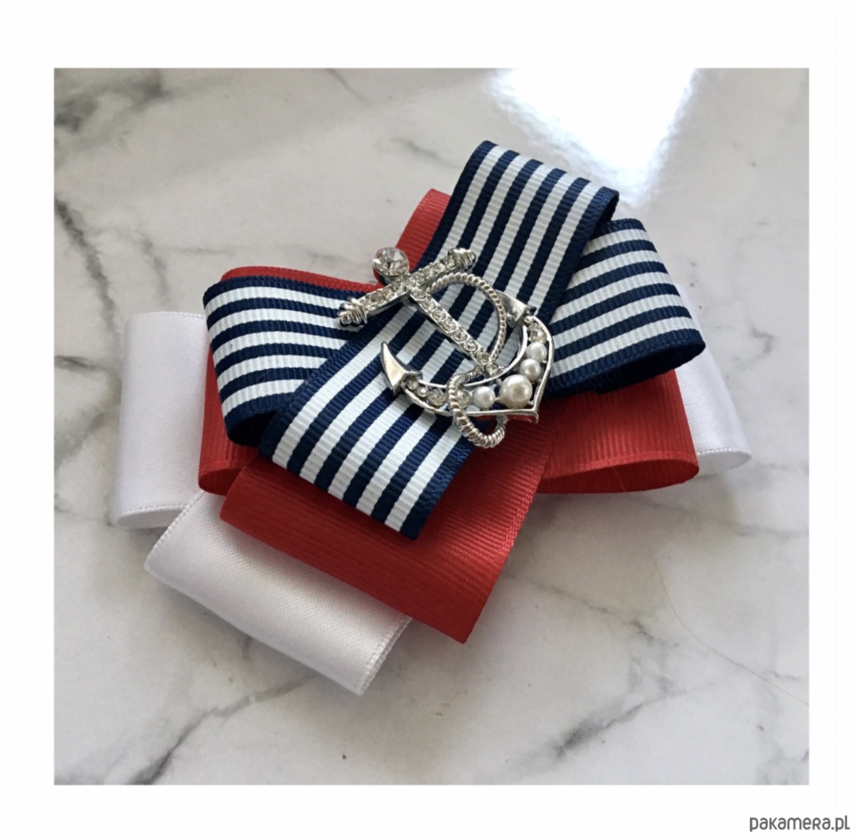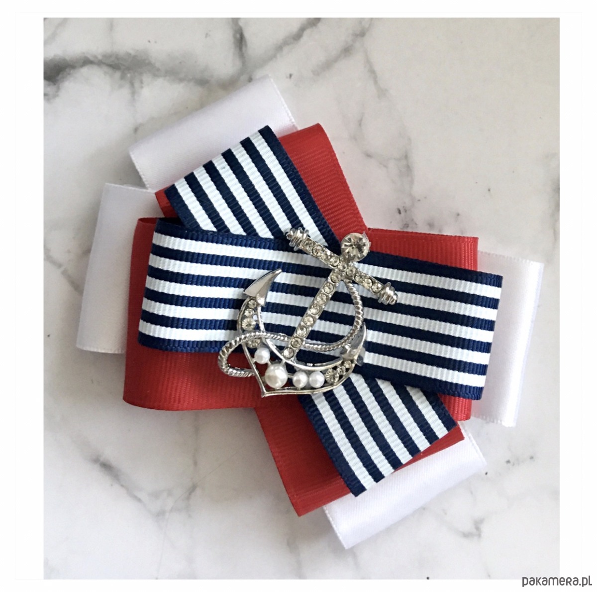 Broszka wykonana z wysokiej jakości taśm i dodatków. Broszka w klimacie marynarskim. W kolorach związanych z morzem, wakacjami i cudownym wakacyjnym klimacie. Granaty, biel i czerwień trio doskonale.