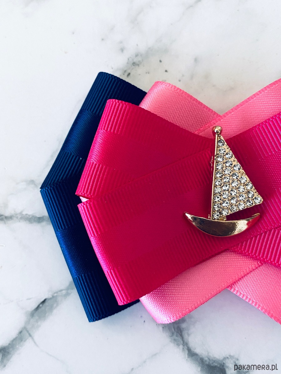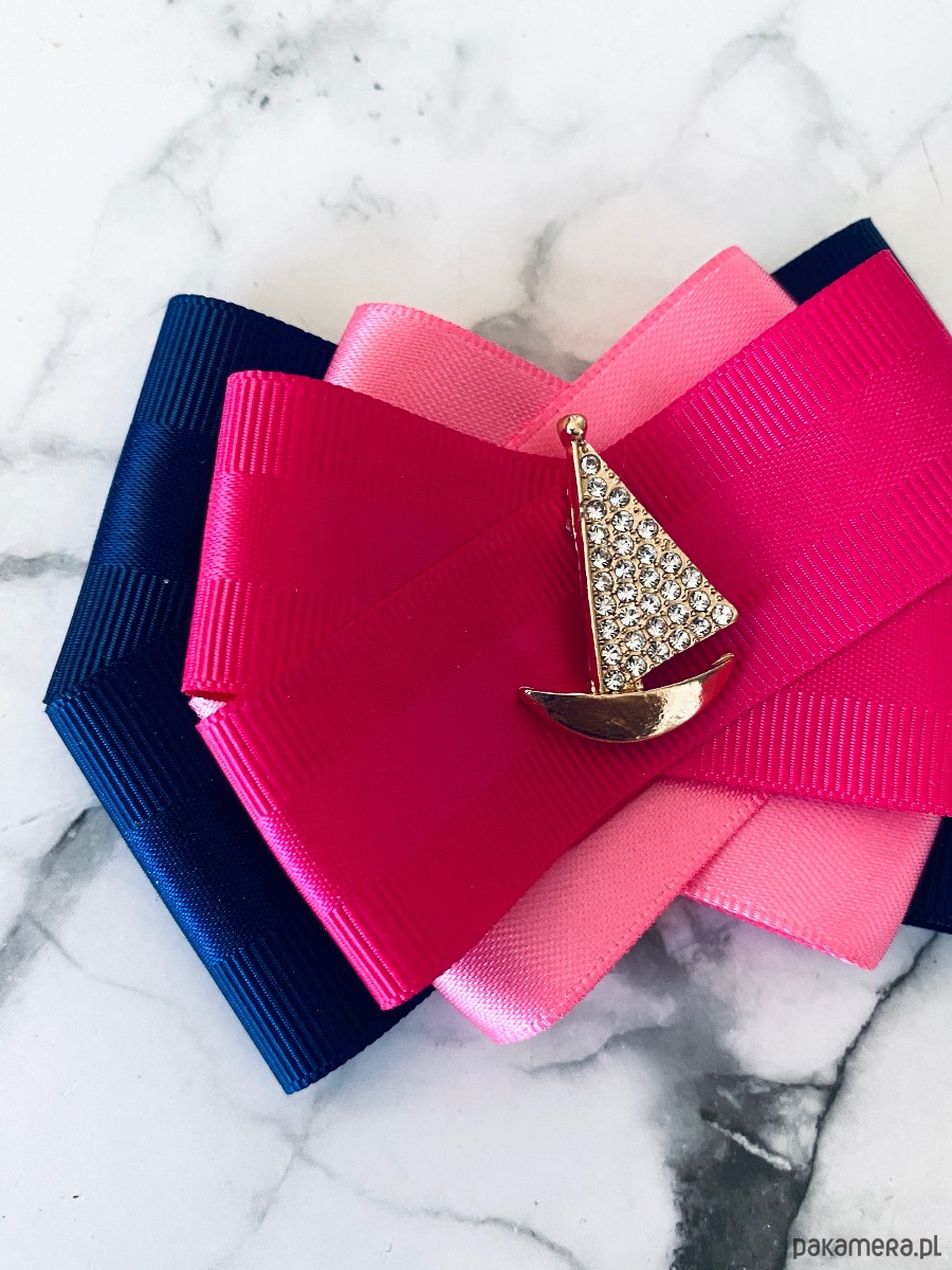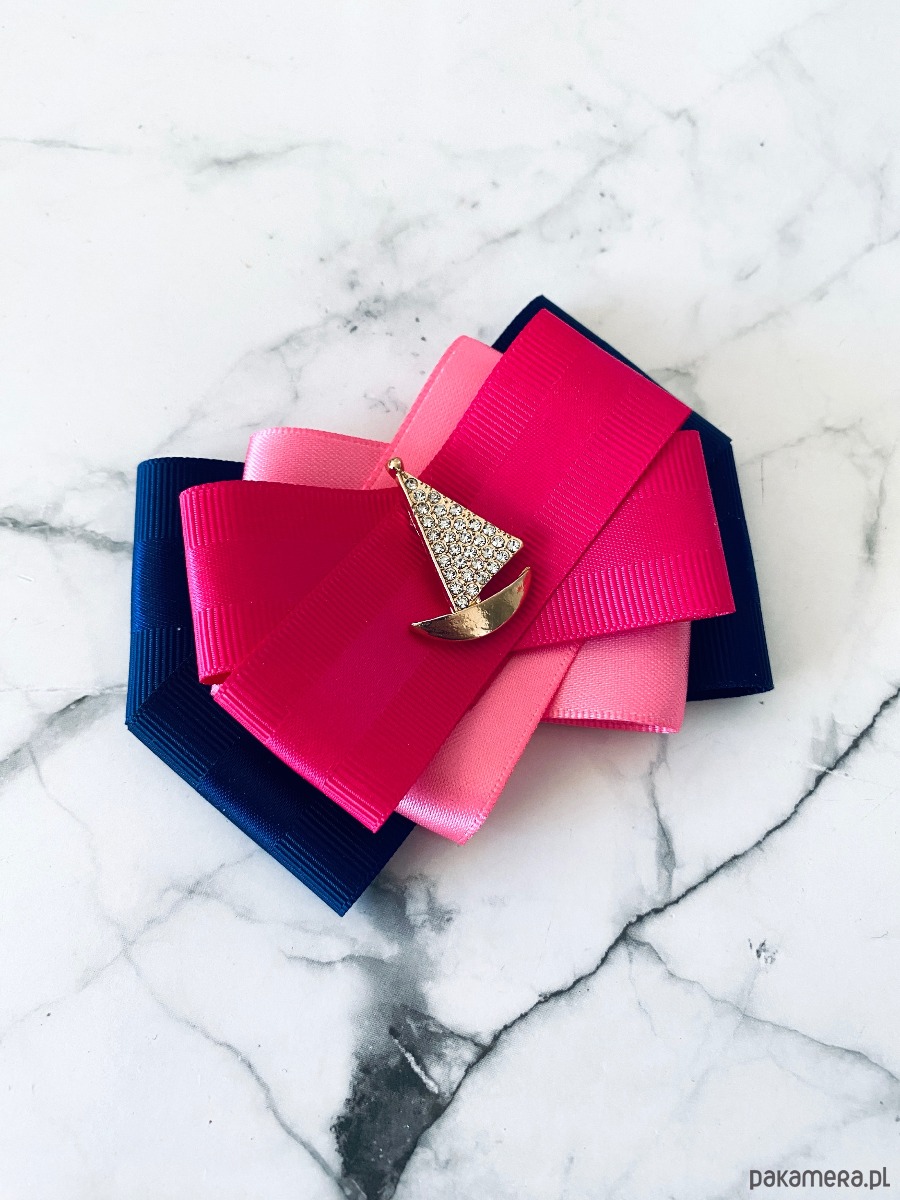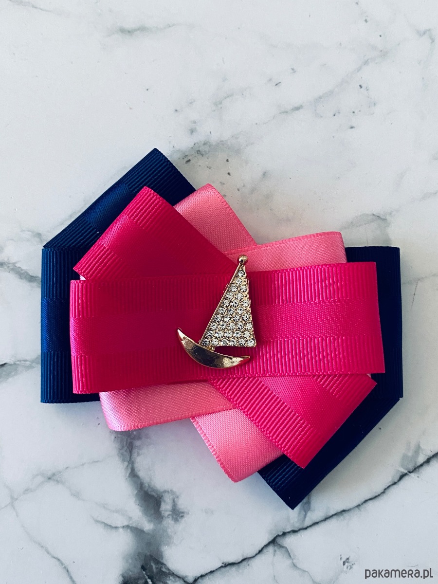 To wyjątkowo delikatna Brosza z minimalistyczną ozdobą w klimacie morskim. Mały subtelny statek w kolorze złota wysadzany drobnymi kryształkami na wstążkach w kolorach marynarskim.