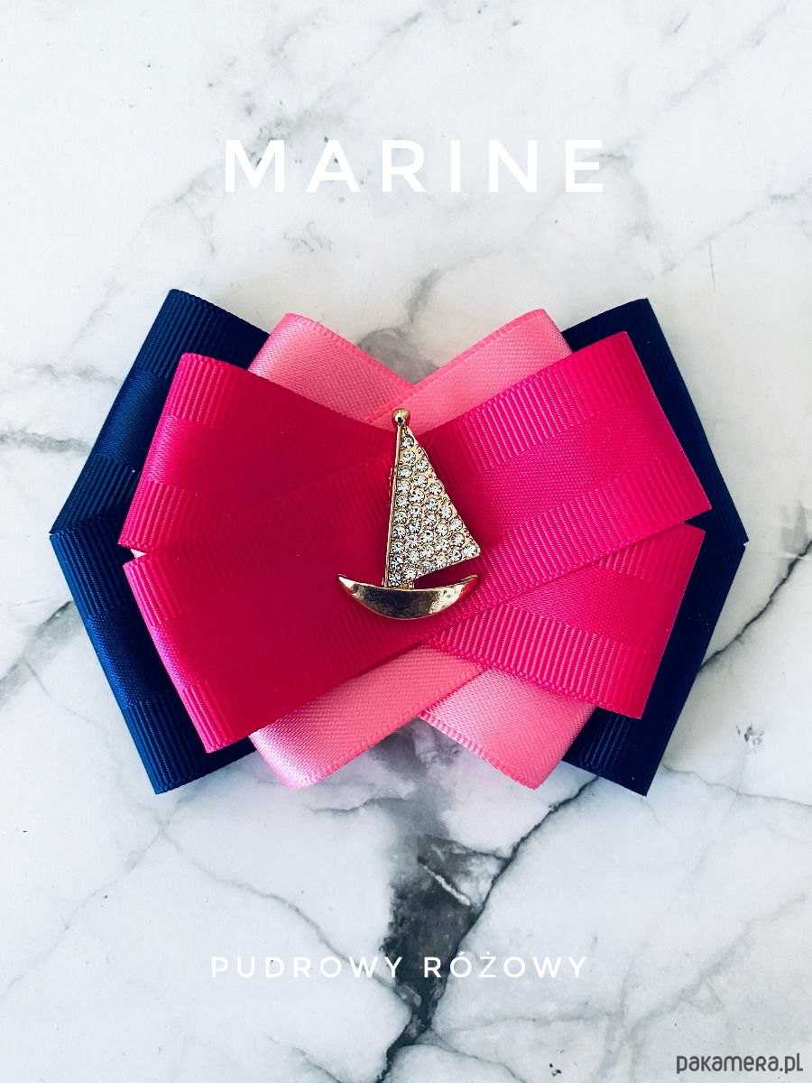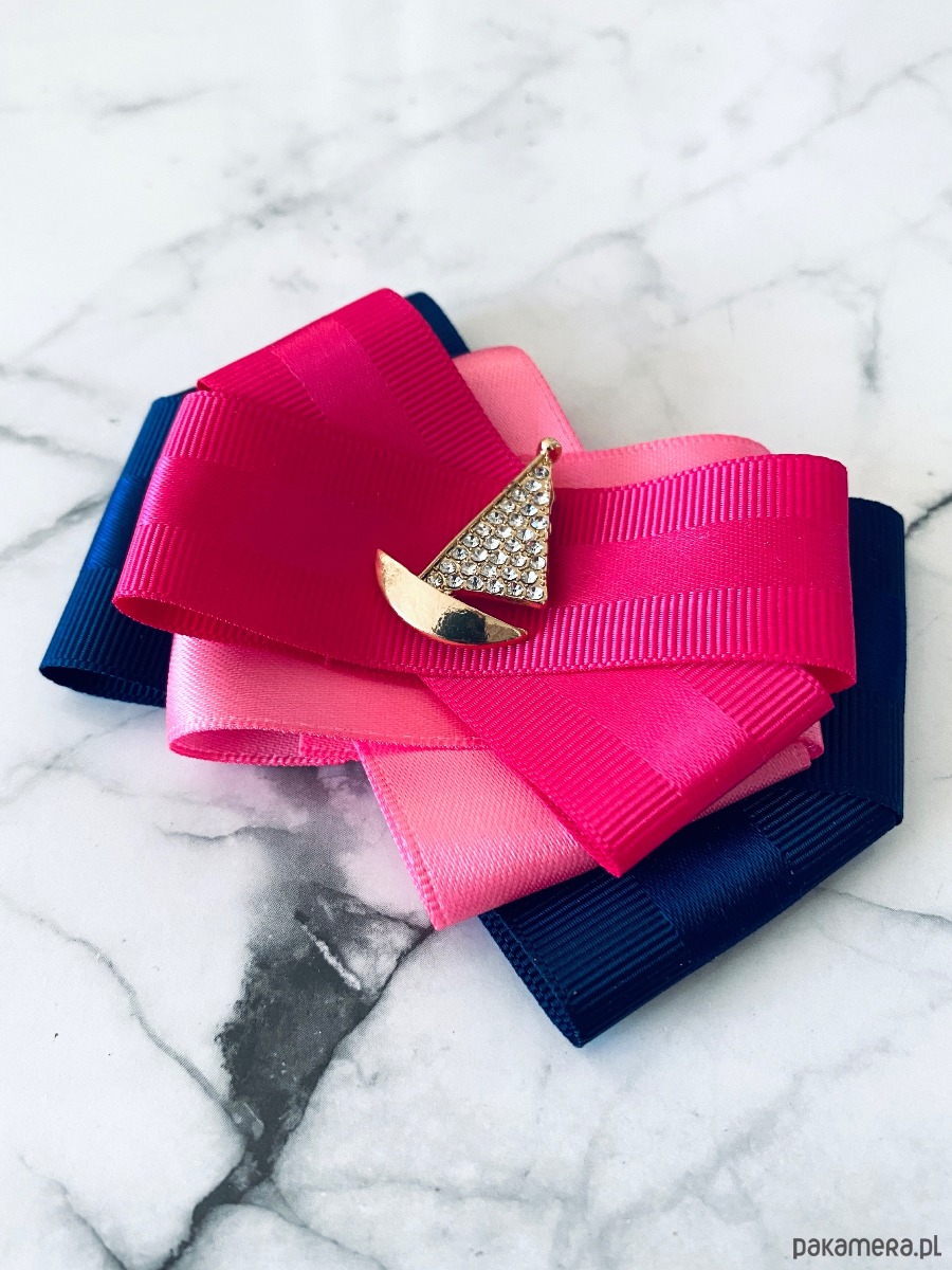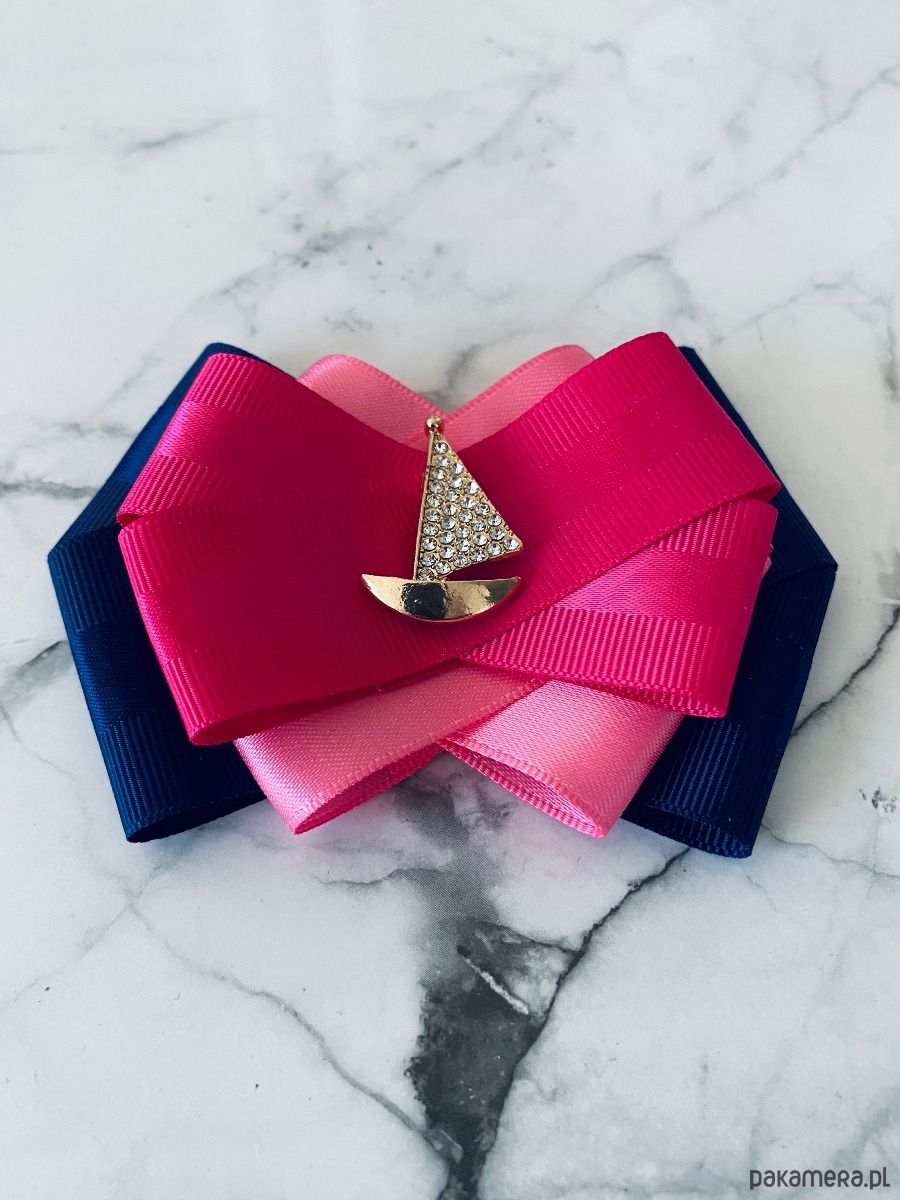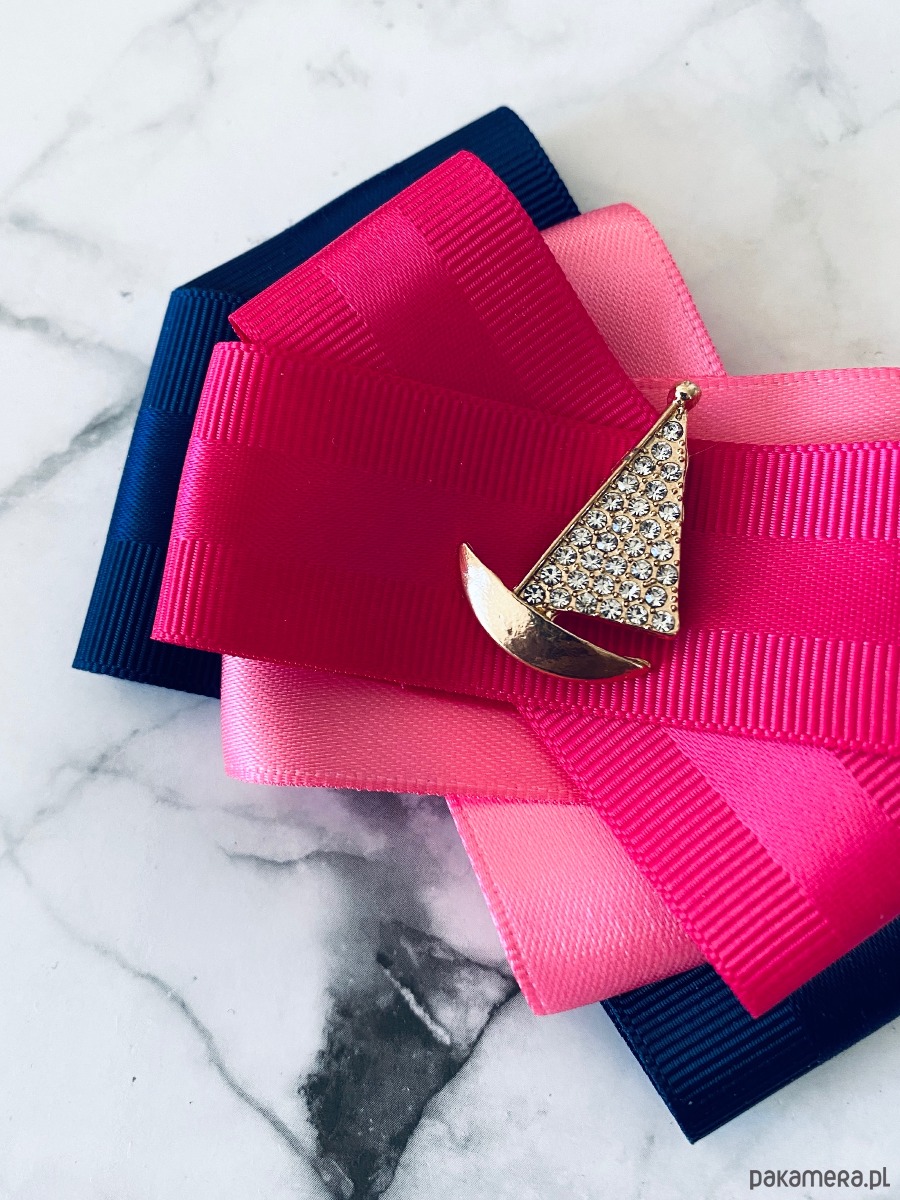 To wyjątkowo delikatna Brosza z minimalistyczną ozdobą w klimacie morskim. Mały subtelny statek w kolorze złota wysadzany drobnymi kryształkami na wstążkach w kolorach marynarskim.
