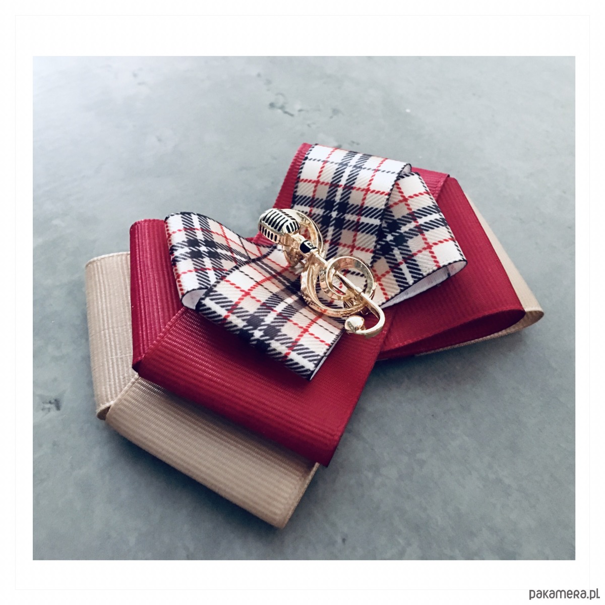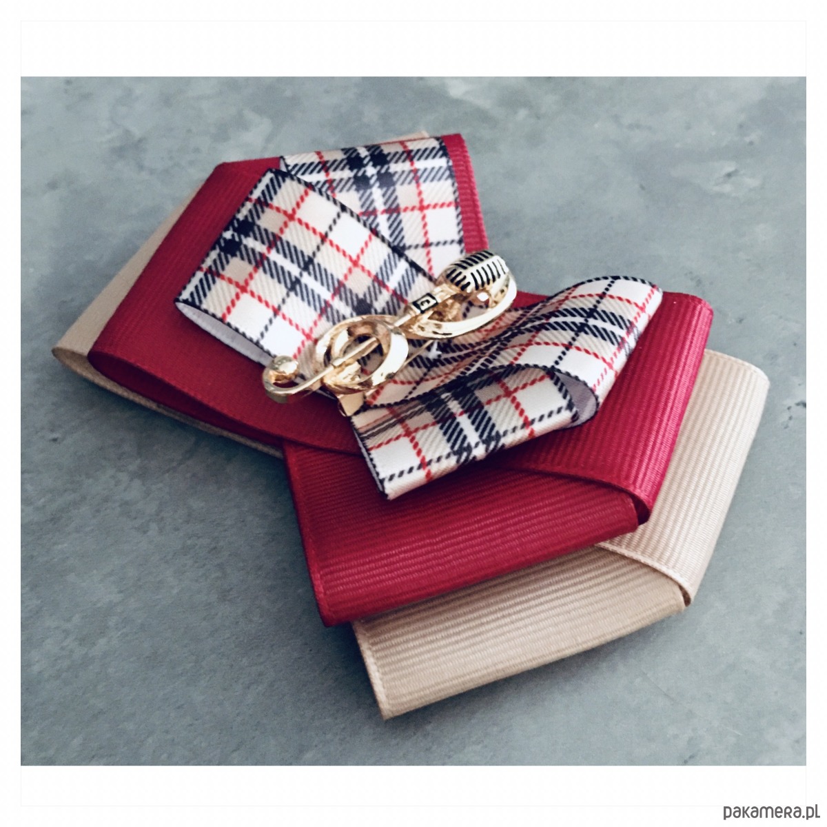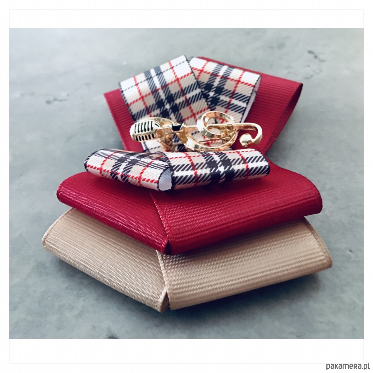 Broszka w kolorach beżu, czerwieni i cudnej kraty.