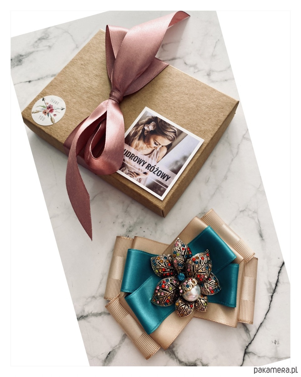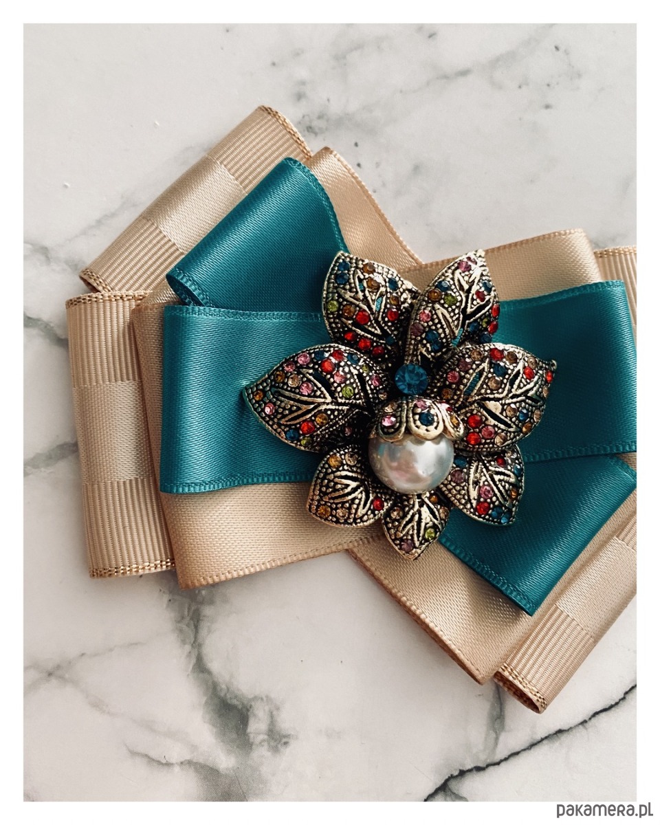 Broszka wykonana z wysokiej jakości taśm i dodatków.