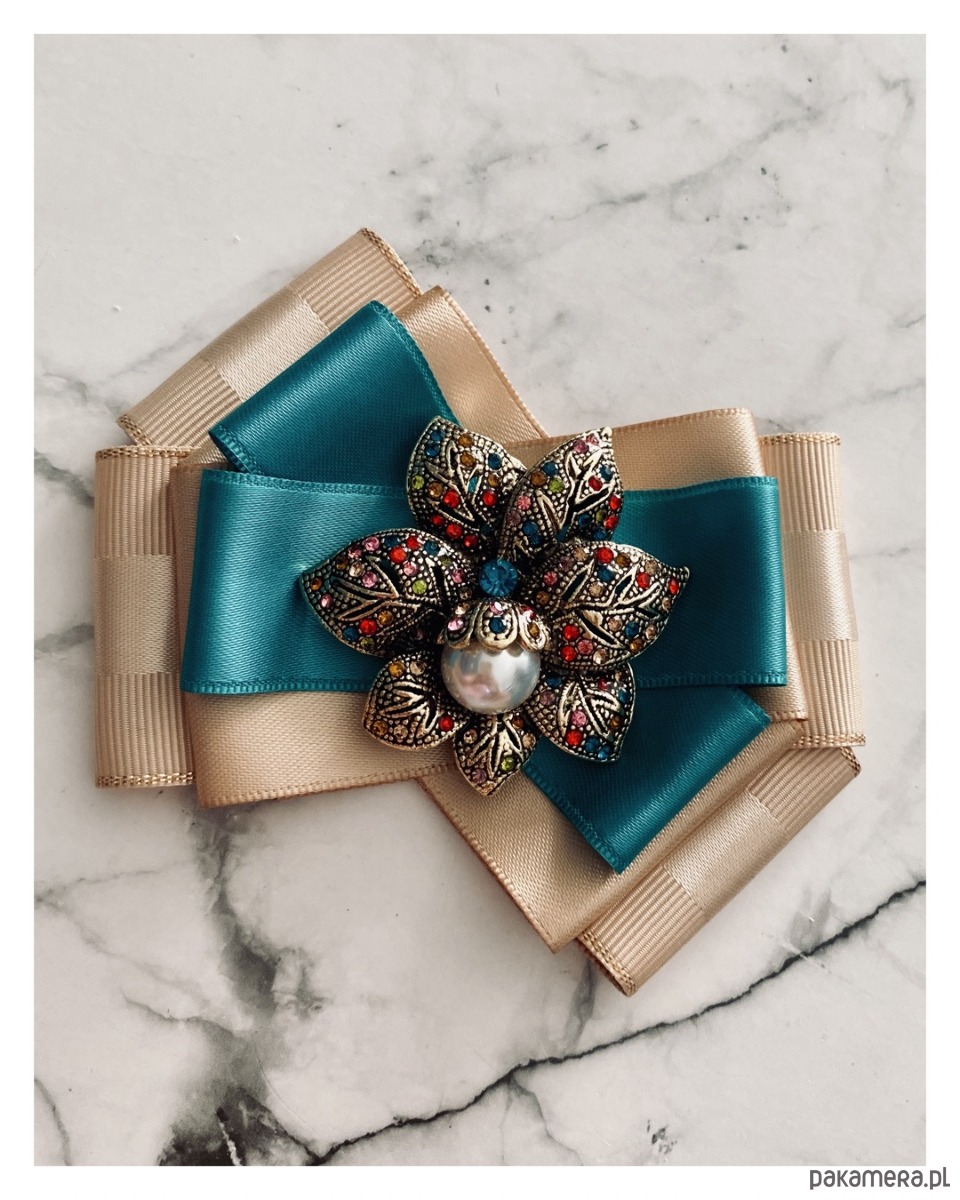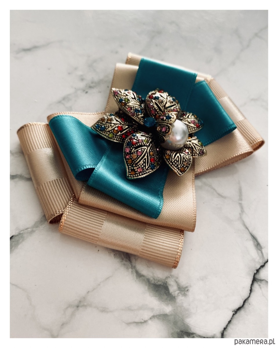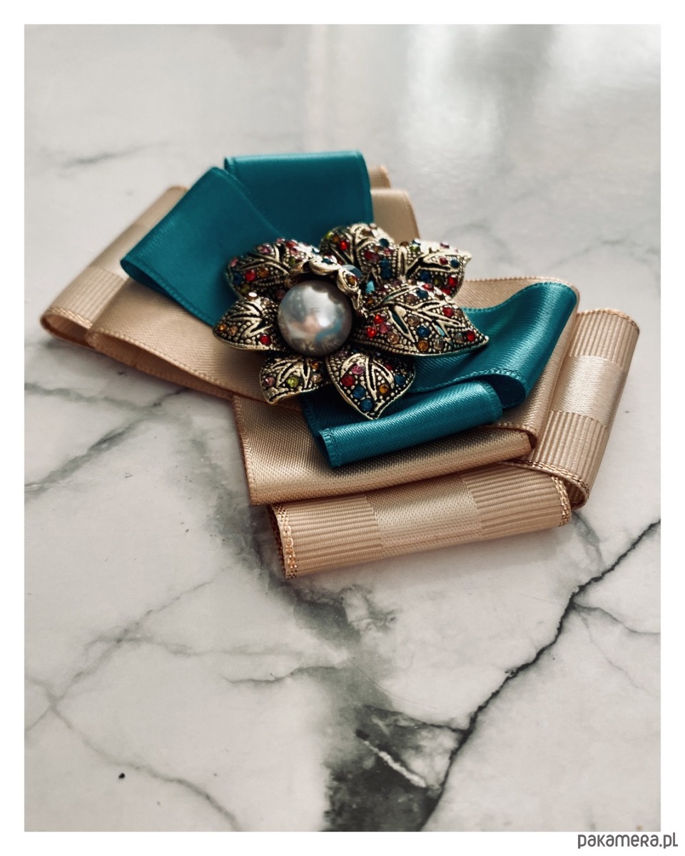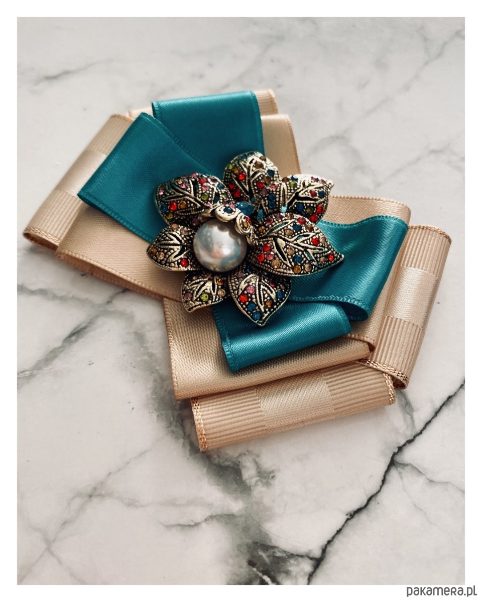 Brosza w kolorze szlachetnego beżu i turkusu.