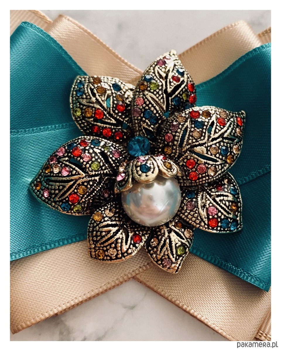 Na środku piękny kwiat w kolorze antycznego złota z dodatkiem delikatnych kolorowych kryształków i dużej perły.