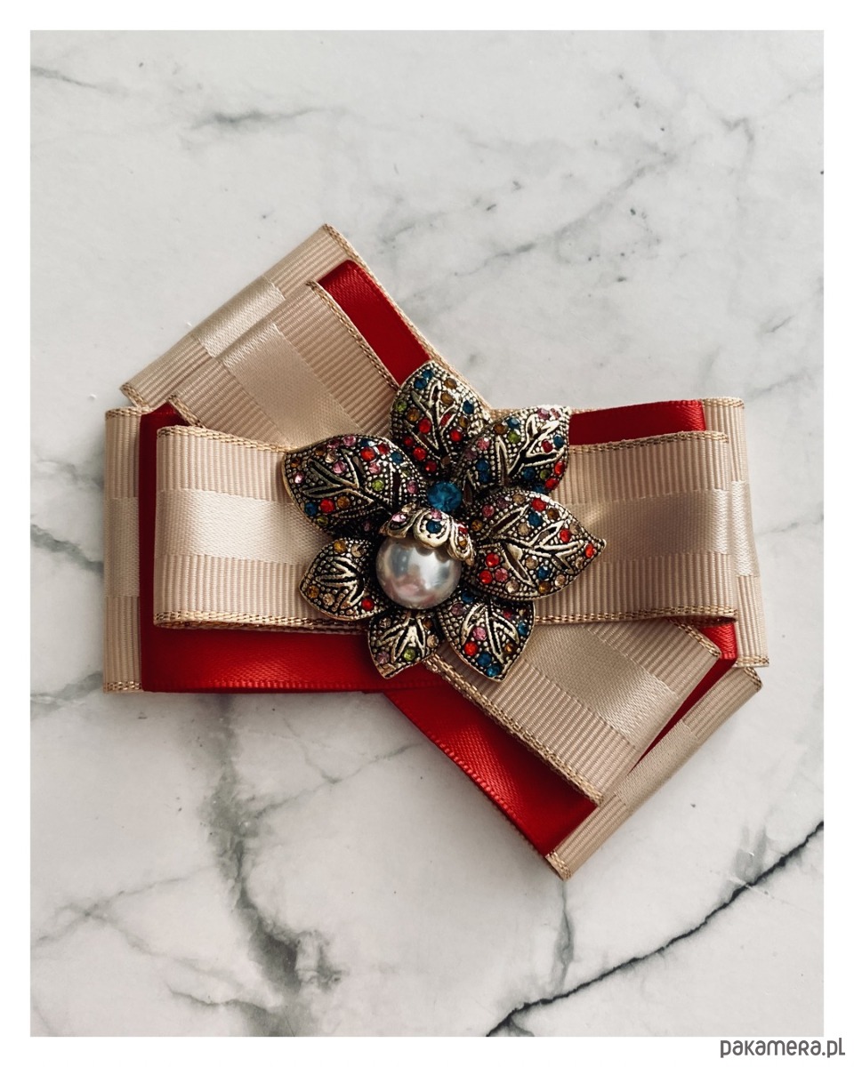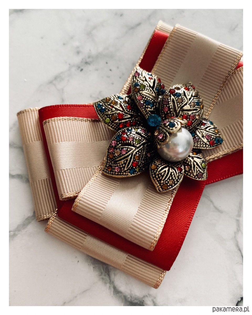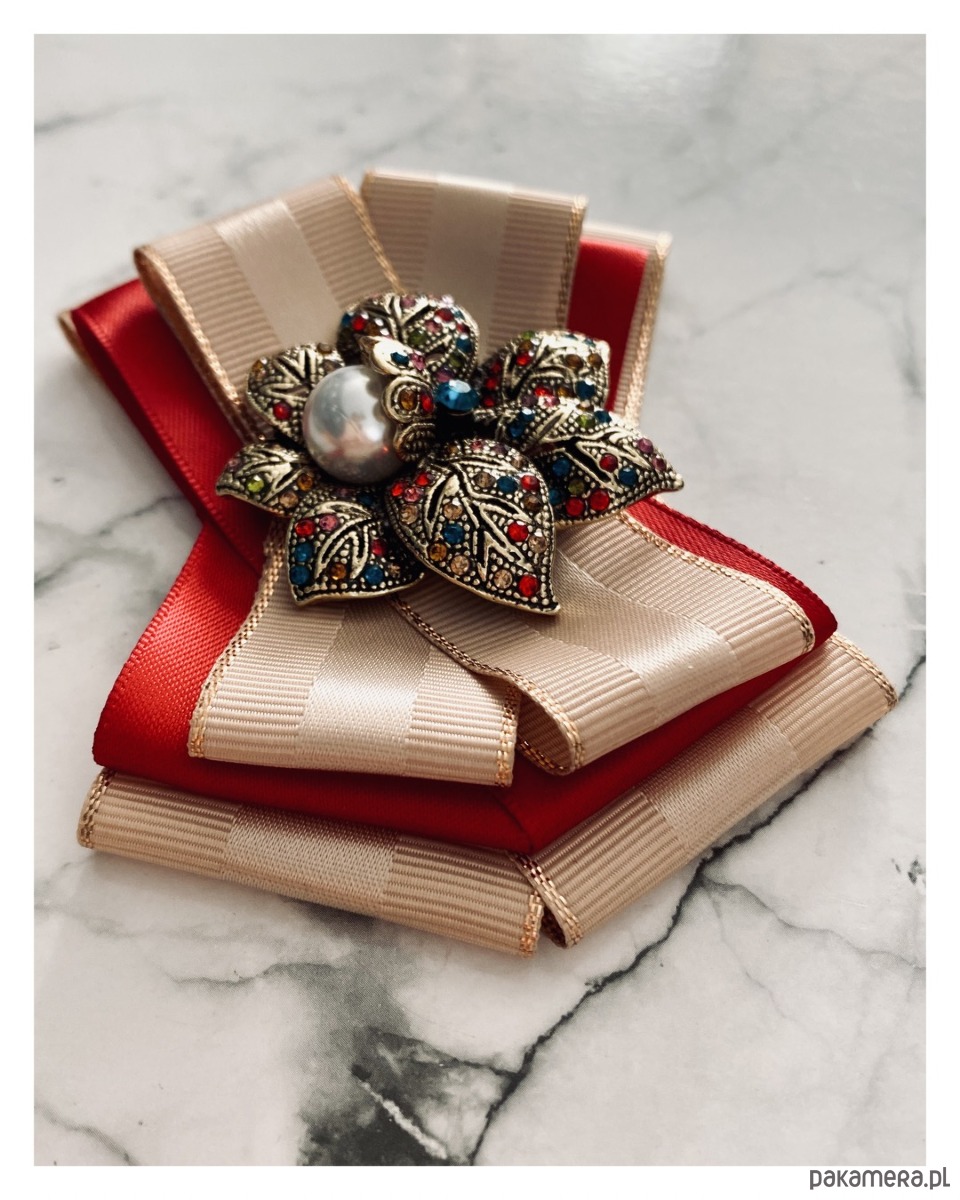 Brosza w kolorze szlachetnego beżu i czerwieni.