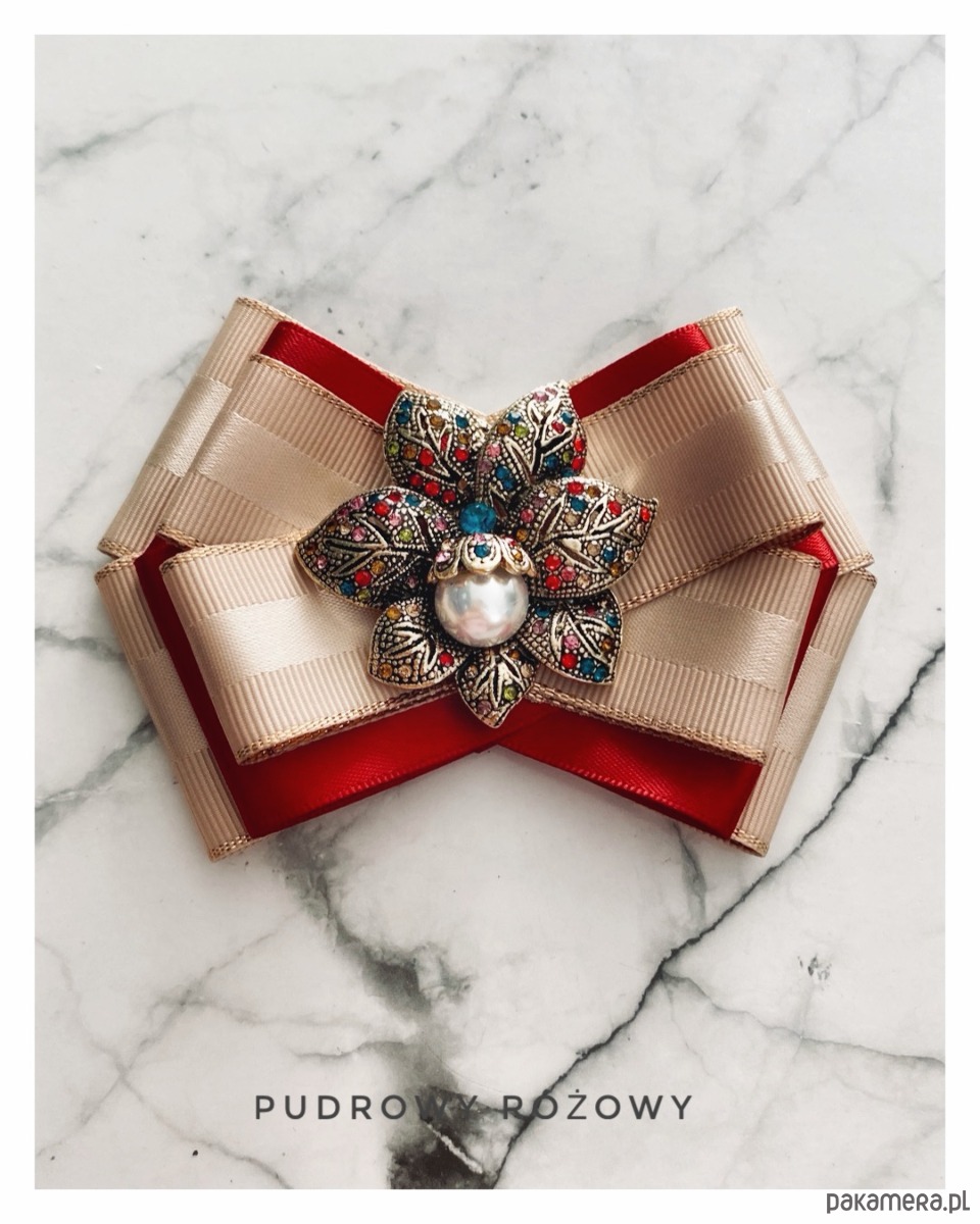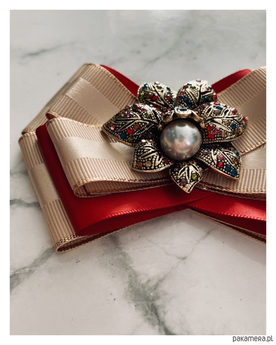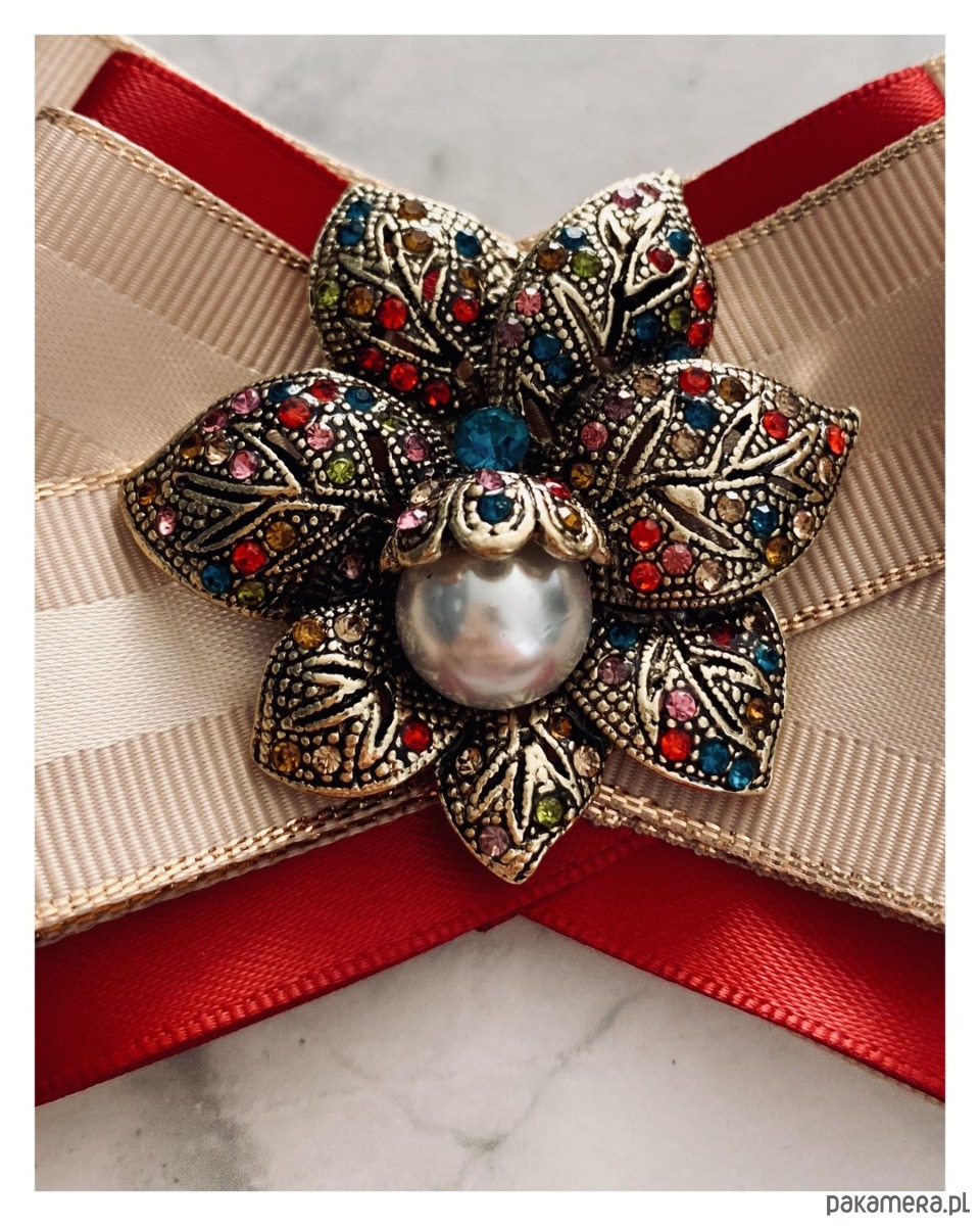 Brosza w kolorze szlachetnego beżu i czerwieni.
