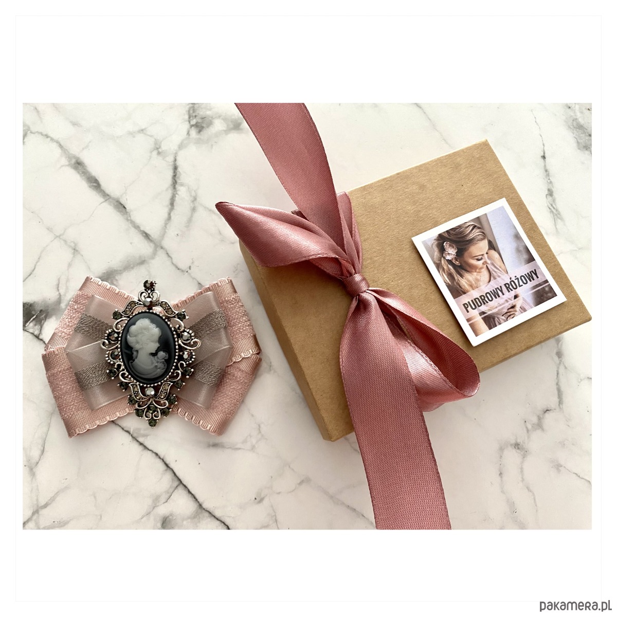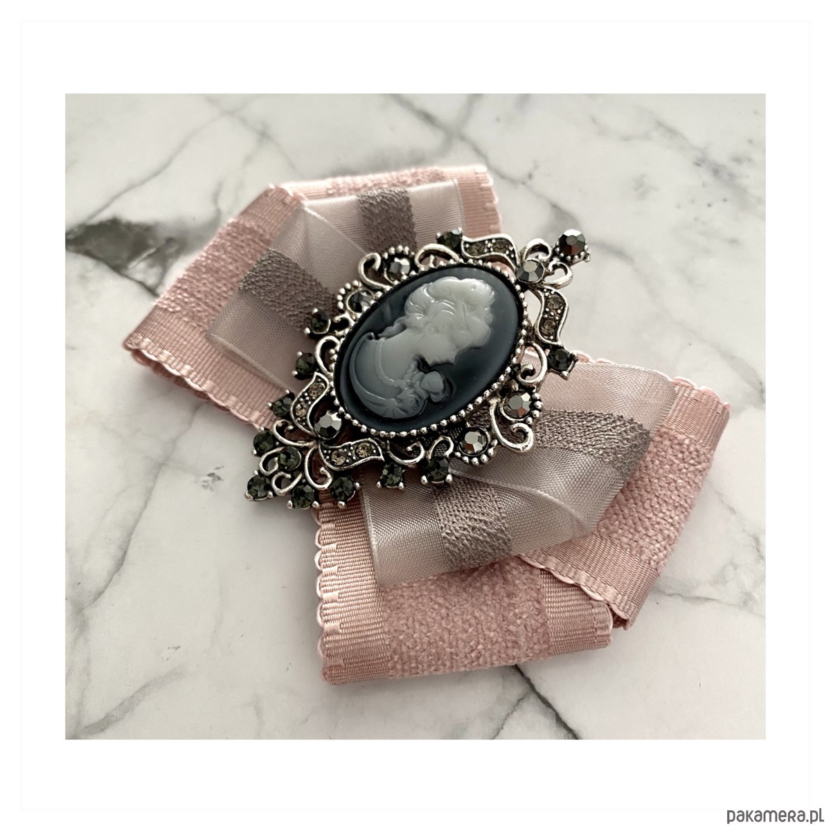 Broszka W kolorach pudrowego różu z dodatkiem tiulowej wstążki w kolorze delikatnej szarości.