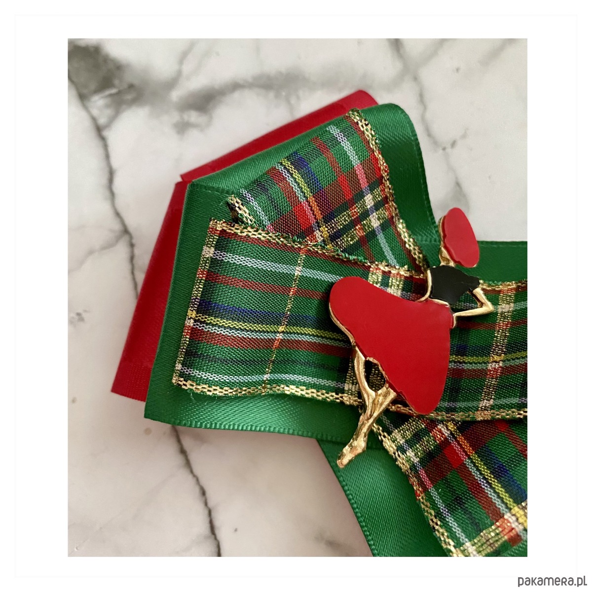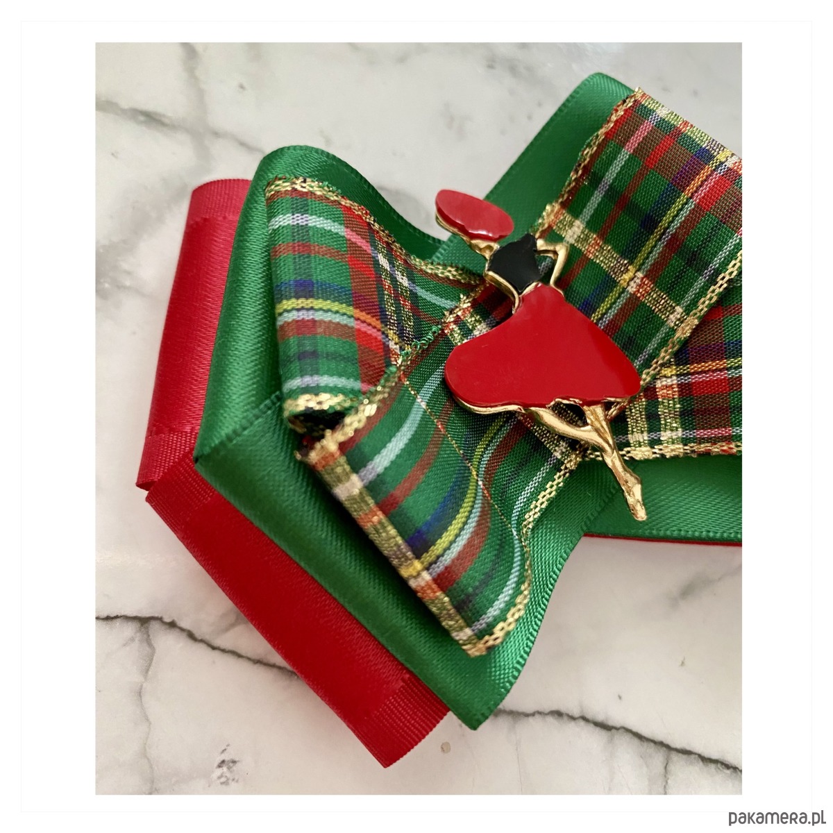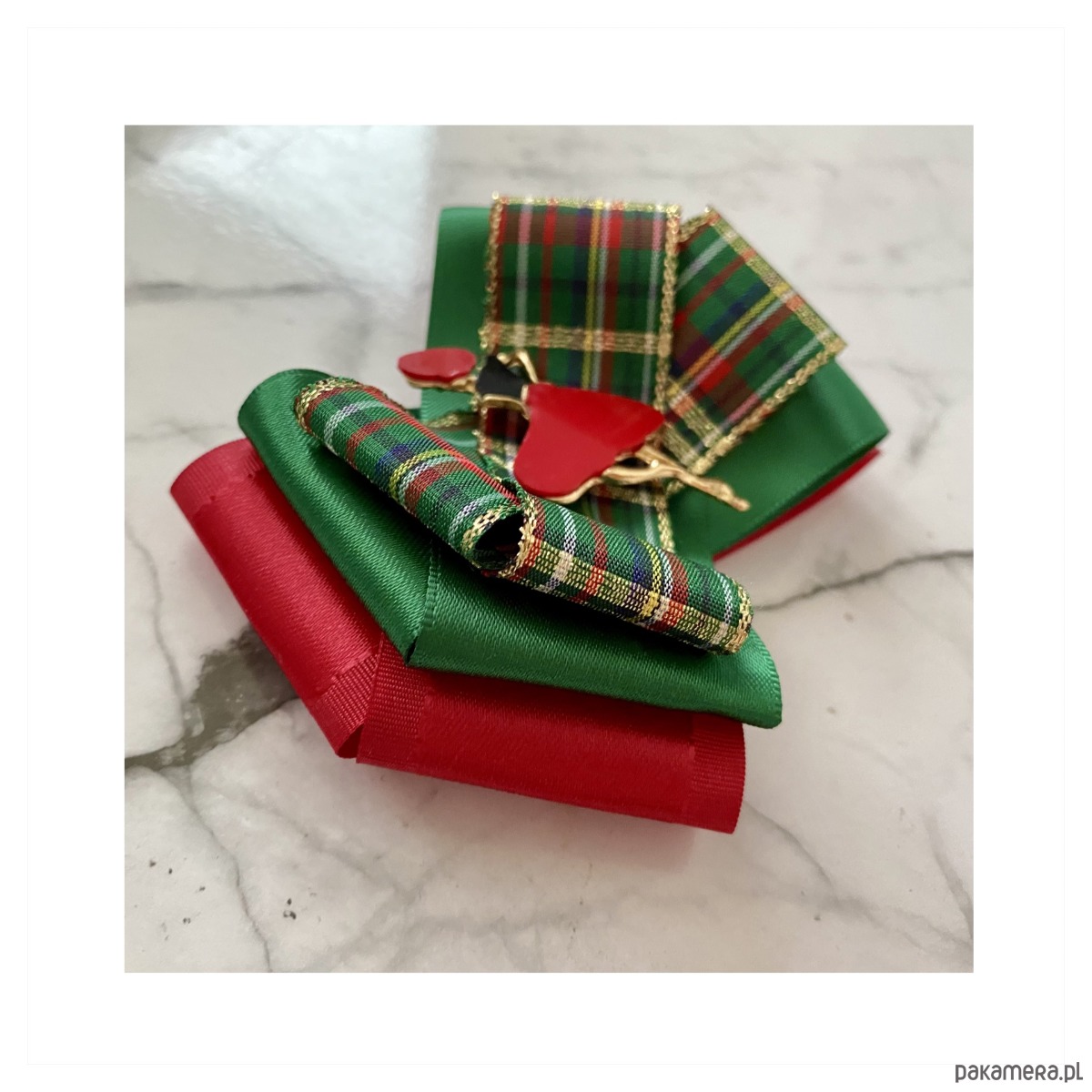 Broszka wykonana z wysokiej jakości taśm i dodatków.