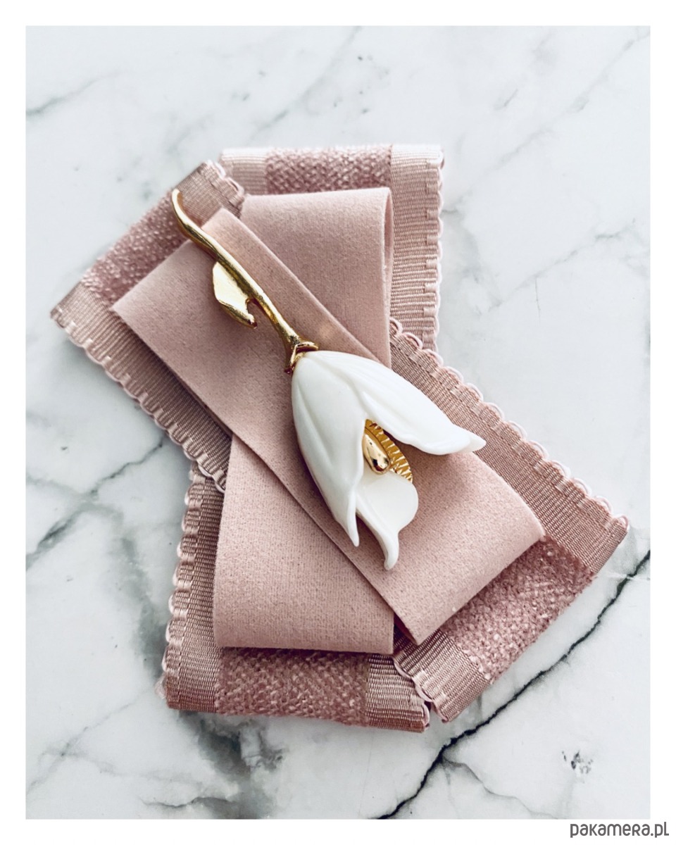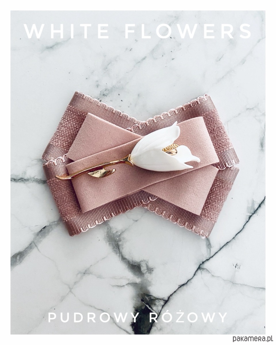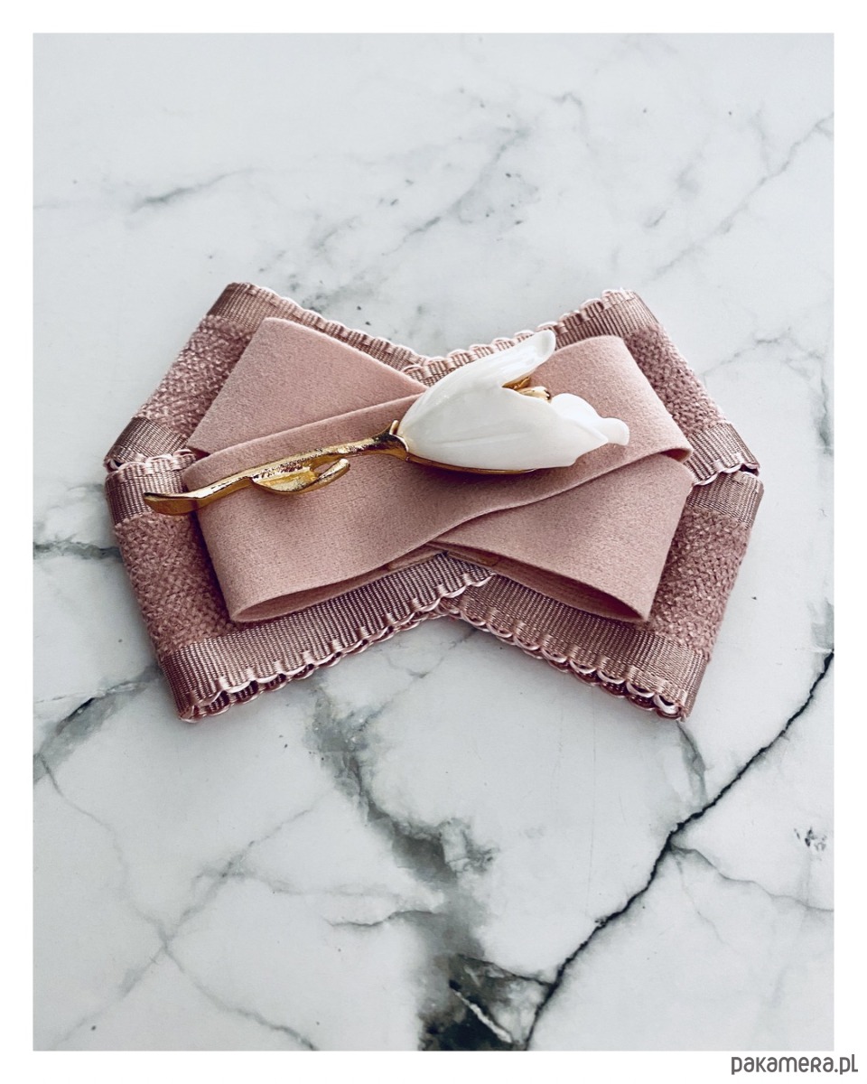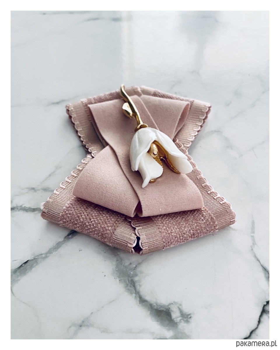 Broszka wykonana z wysokiej jakości taśm i dodatków. Brosza w kolorze pudrowego różu. Wstążki z cudownej mięciutkiej tkaniny przypominającej aksamit i zamszu.