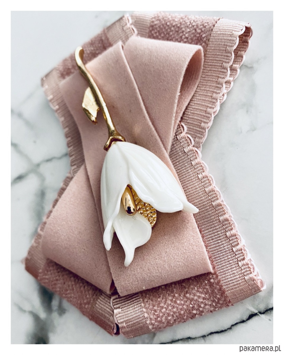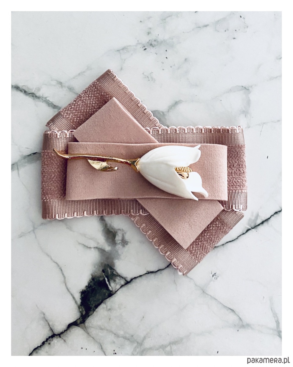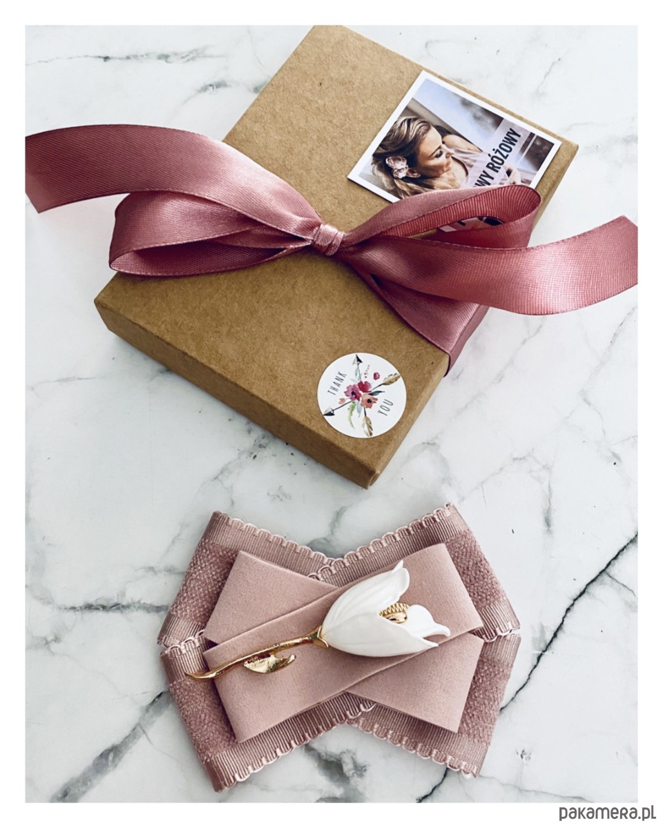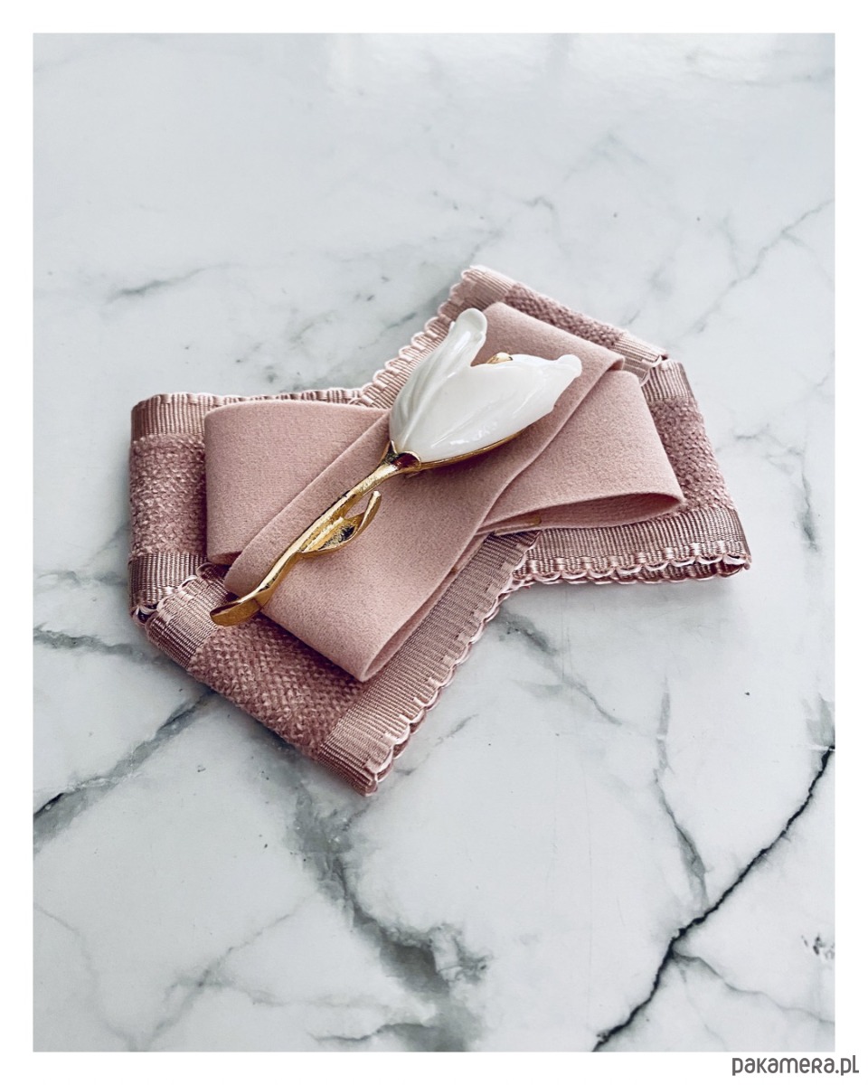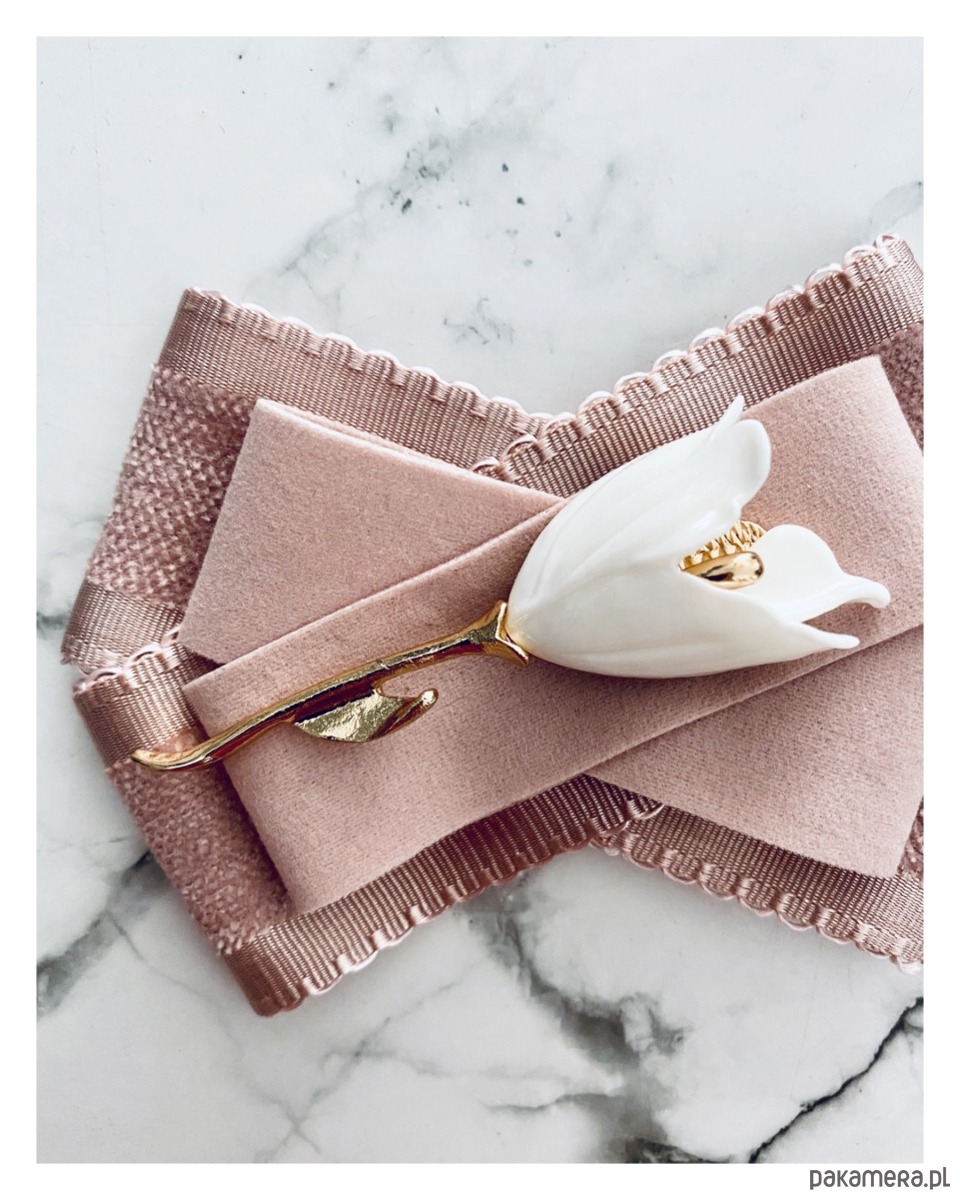 Broszka wykonana z wysokiej jakości taśm i dodatków. Brosza w kolorze pudrowego różu. Wstążki z cudownej mięciutkiej tkaniny przypominającej aksamit i zamszu.