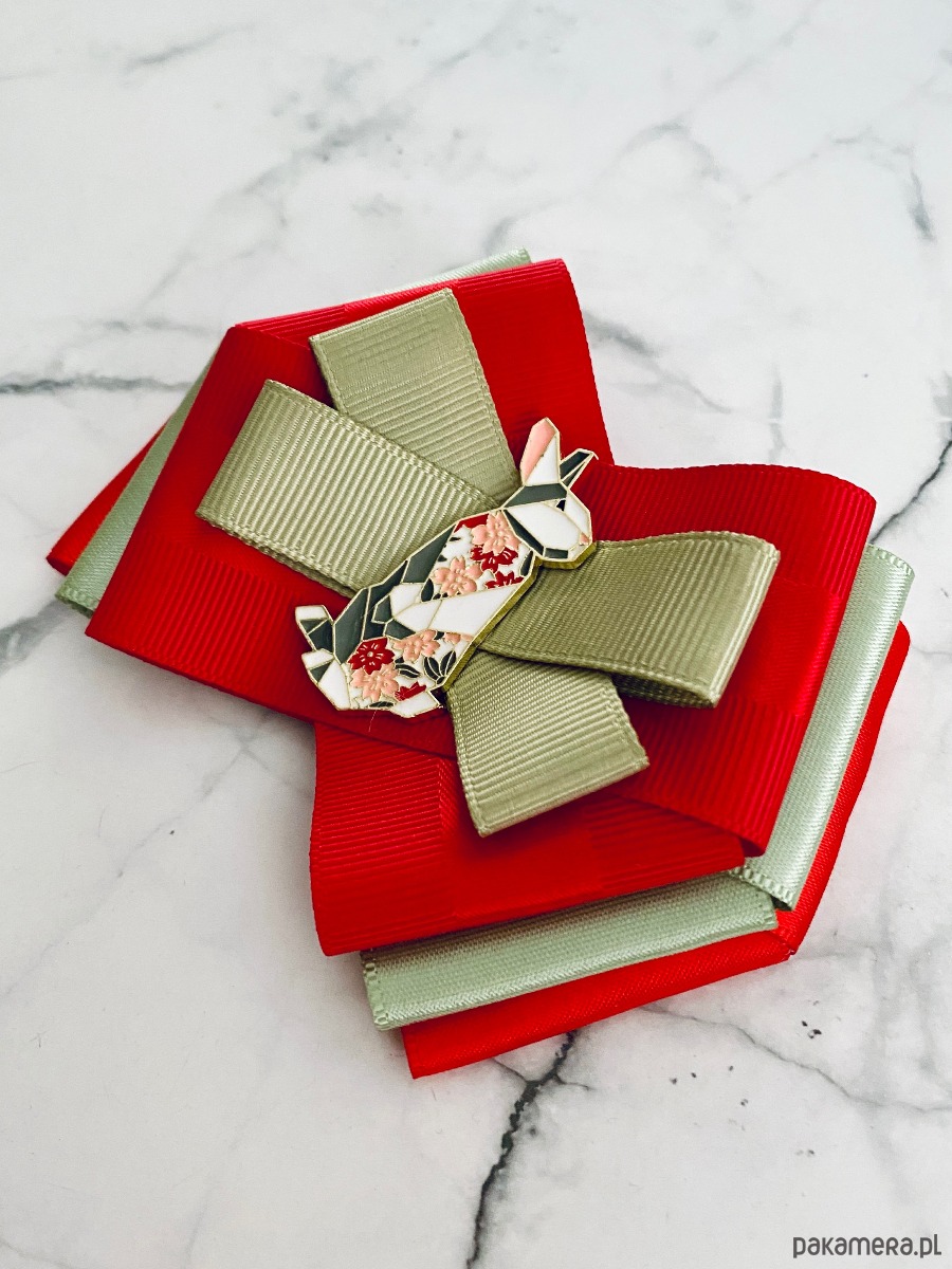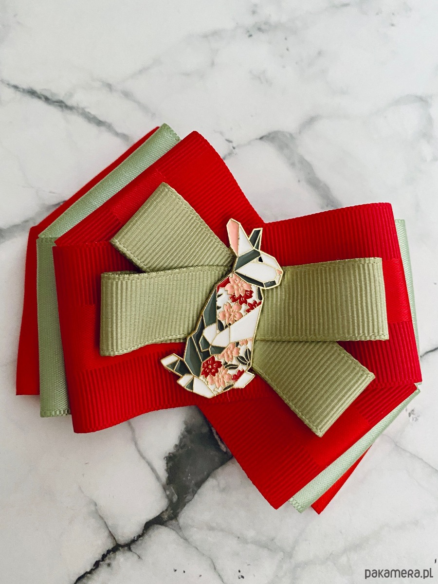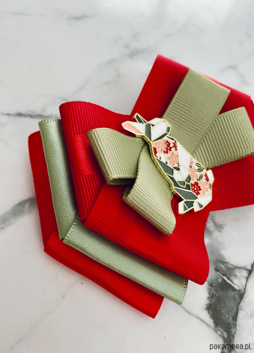Broszka wykonana z wysokiej jakości taśm i dodatków.
