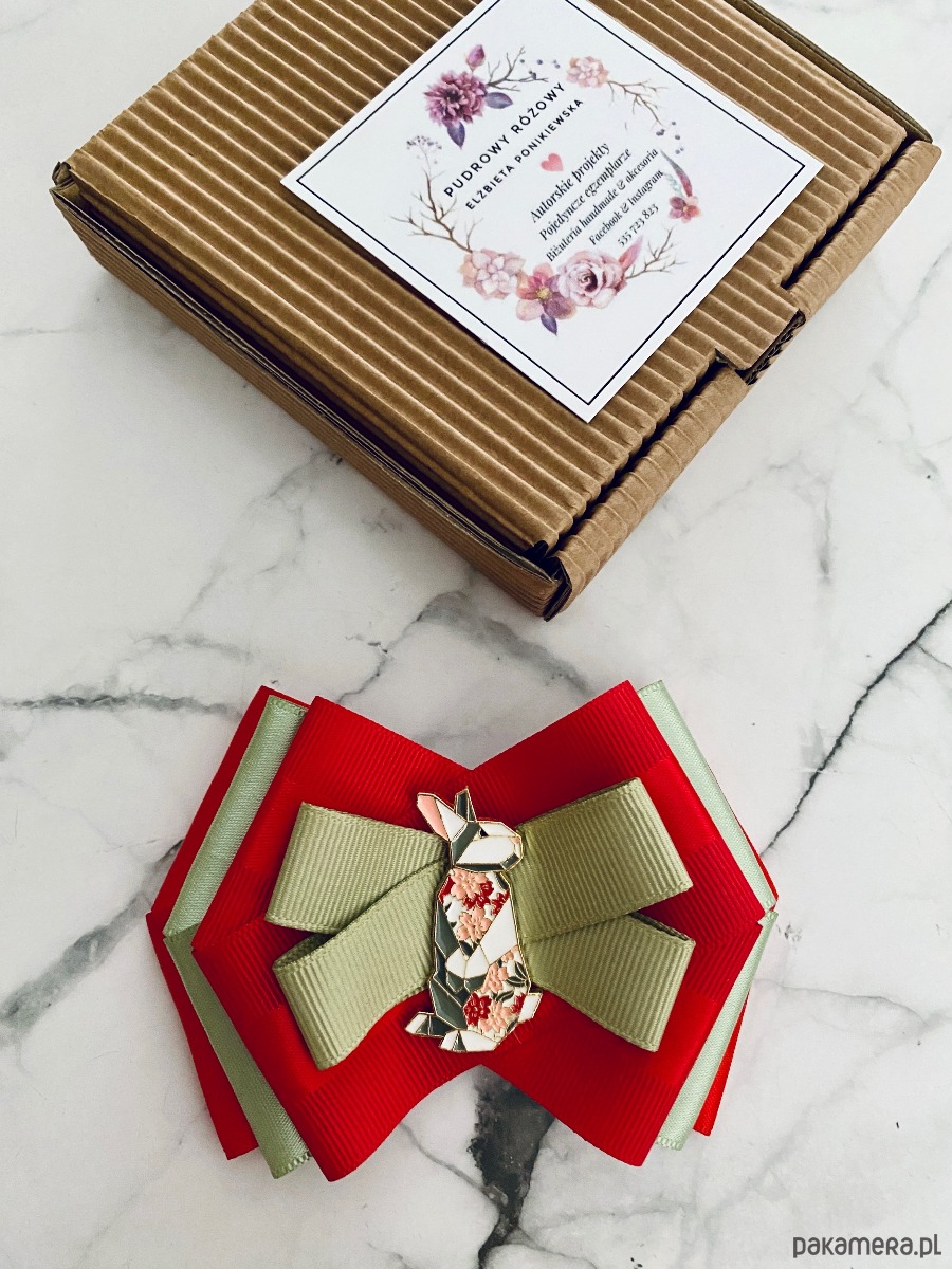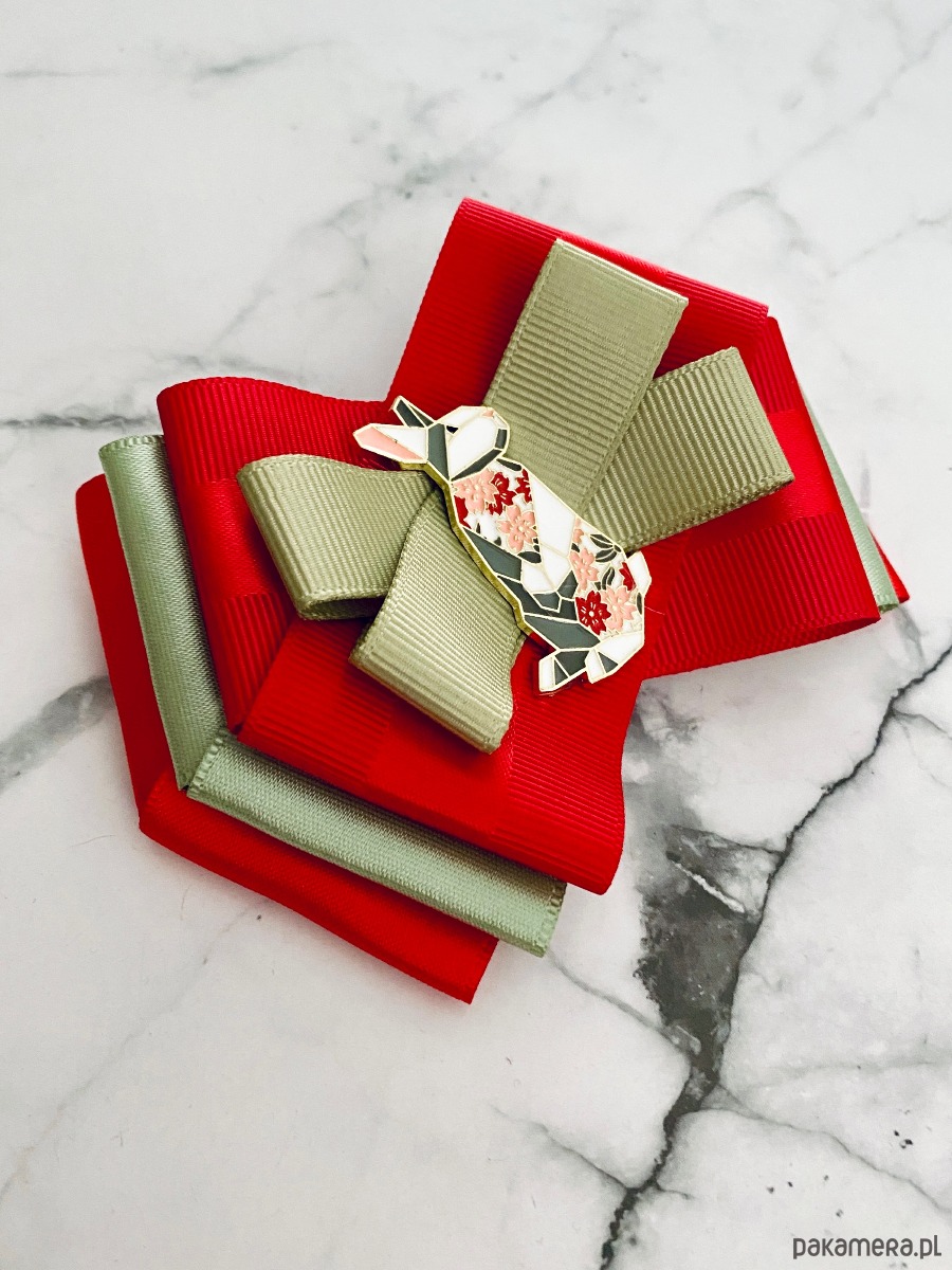 Broszka wykonana z wysokiej jakości taśm i dodatków.