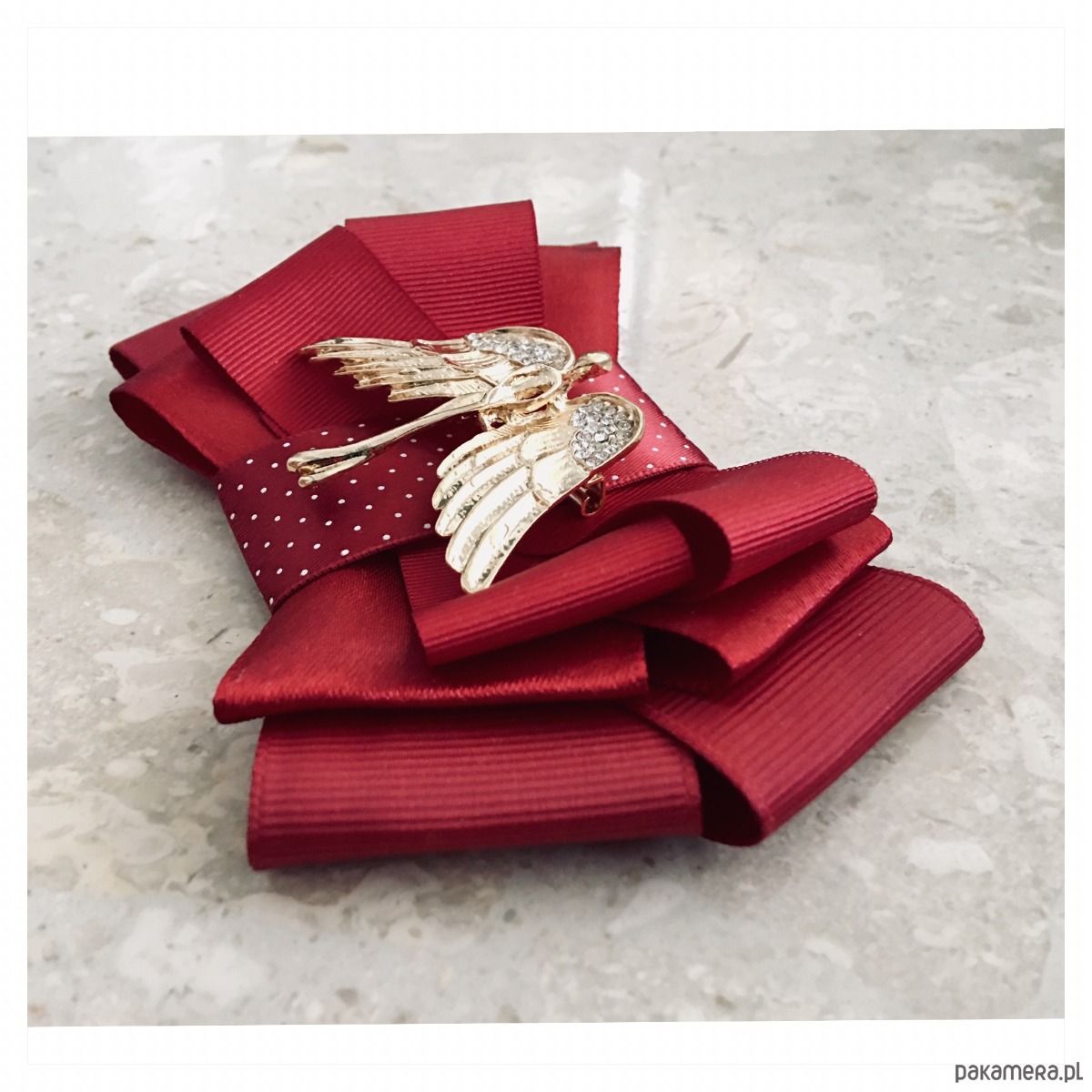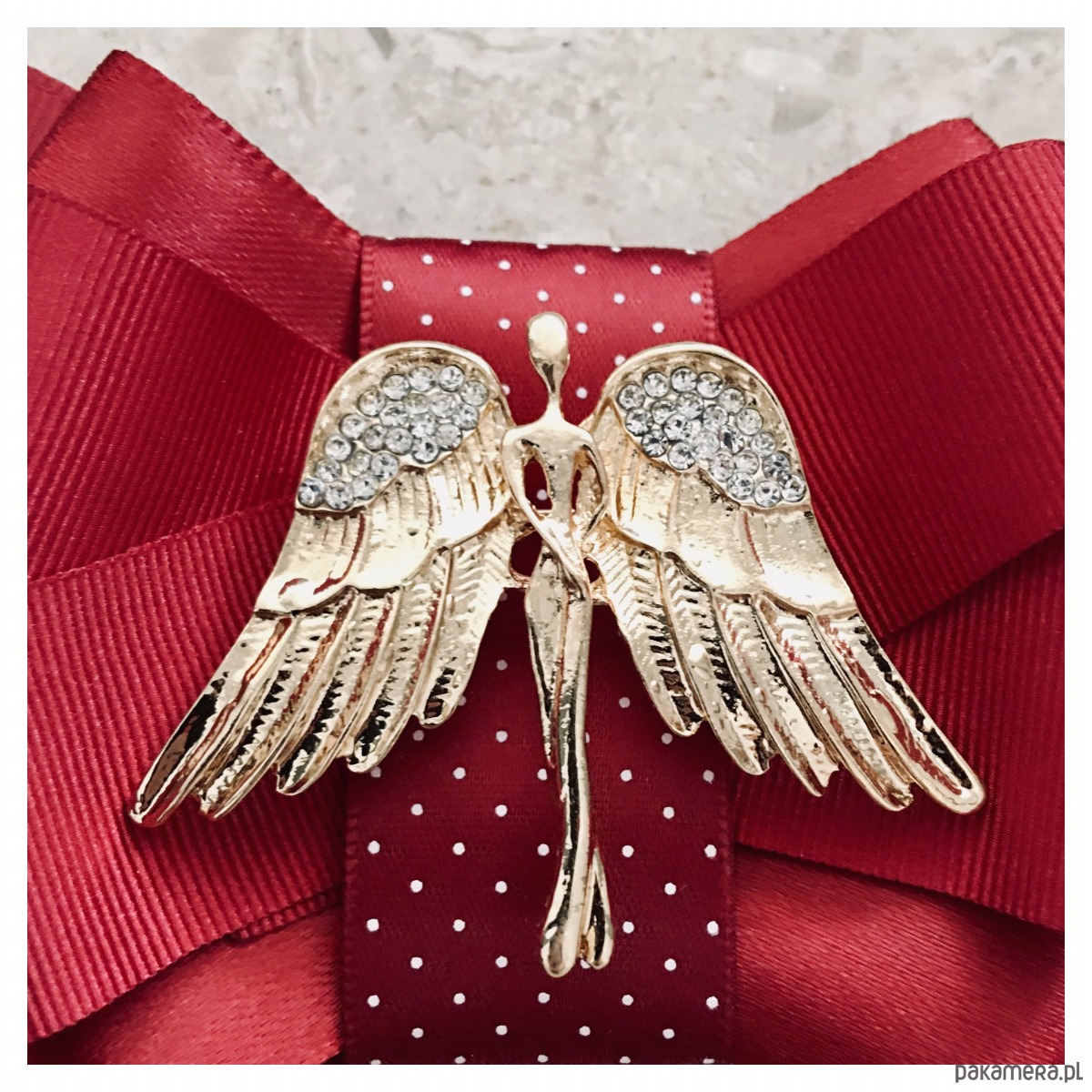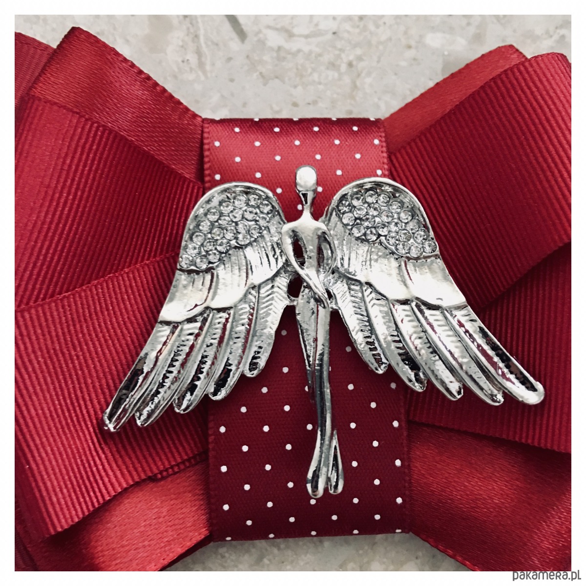Broszka wykonana z wysokiej jakości taśm i dodatków. Brosza w najmodniejszych kolorach tego sezonu. Na środku naszyta dekoracyjna ozdoba biżuteryjna Anioł z kryształkami w kolorze delikatnego złota lub srebra. Będzie idealnie pasować zarówno do koszul, bluzek, swetrów, sukienek, żakietów oraz do płaszczy, kurtek, szali i chust. Idealna do każdej stylizacji, zarówno do sportowej jak również do eleganckich stylizacji.