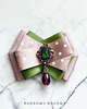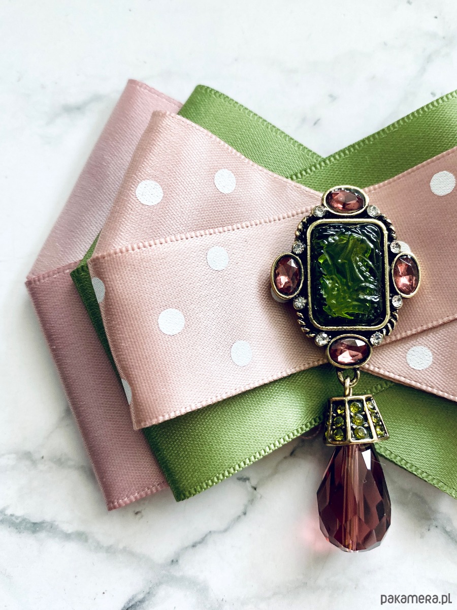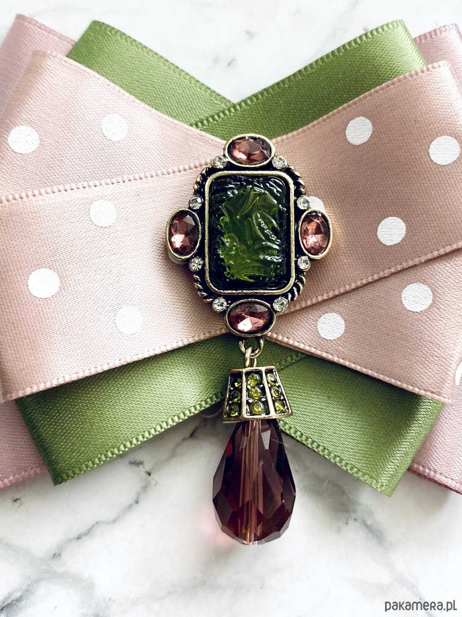 Brosza w wiosennych kolorach, delikatnej zieleni i pudrowego różu. Piękna ozdoba biżuteryjna zielone artystyczne szkiełko zatopione w złotej oprawie z dodatkiem kryształków w kolorze herbacianego różu.