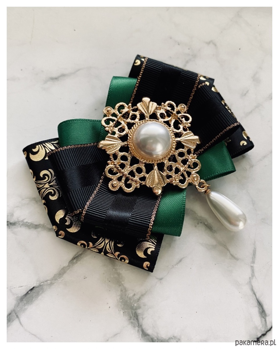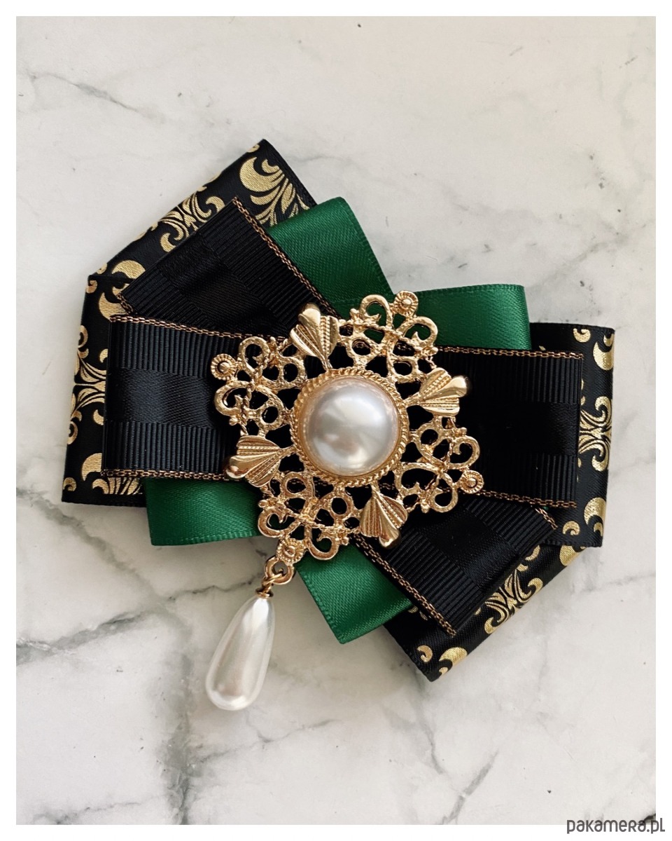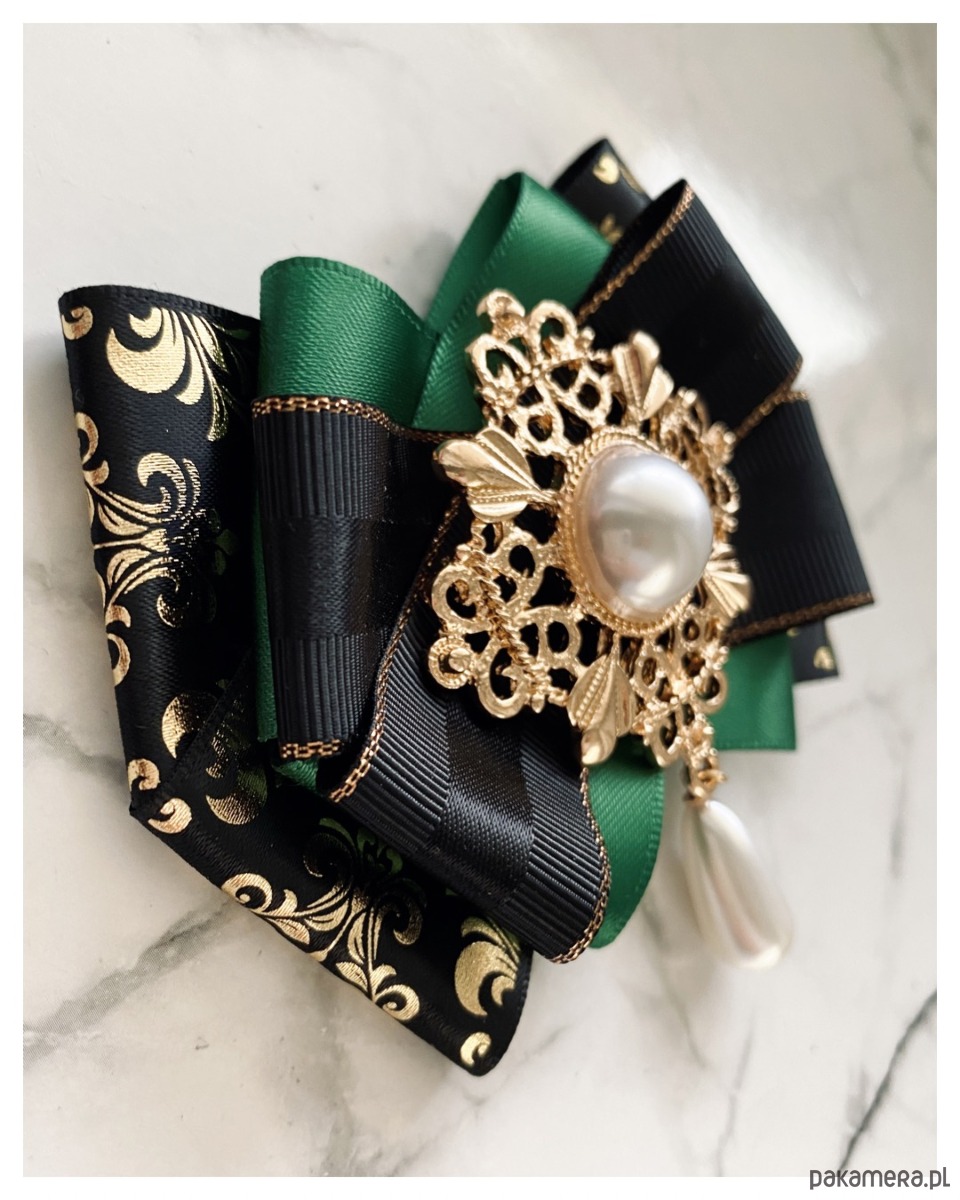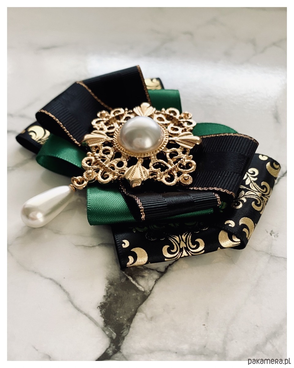 Brosza w kolorze szlachetnego zielonego, czerni i złota.