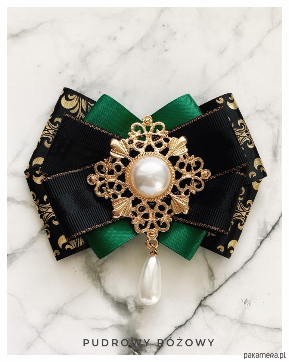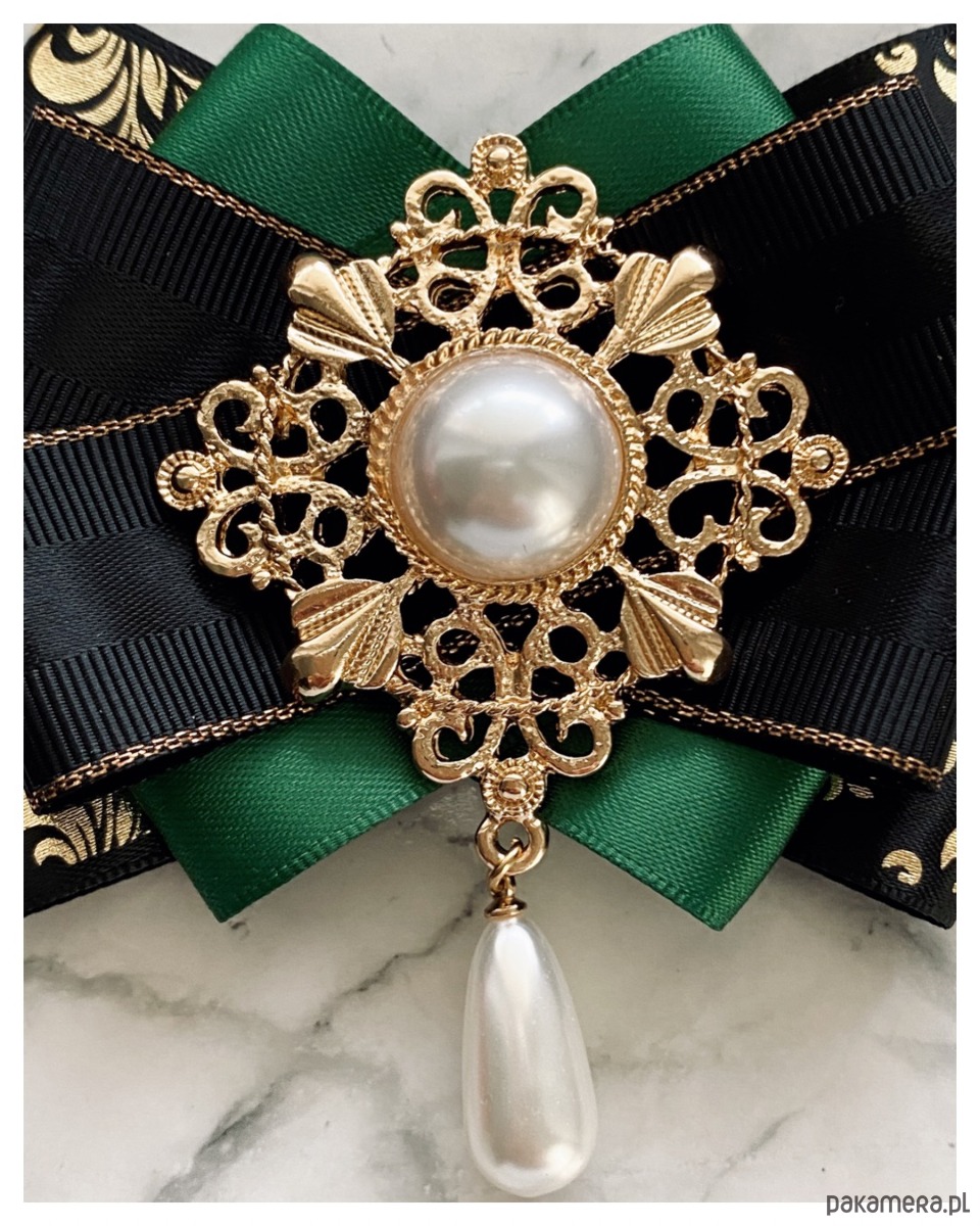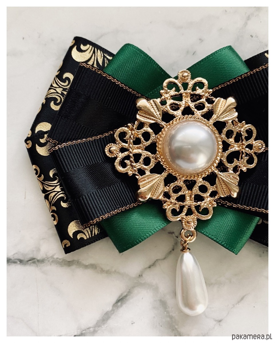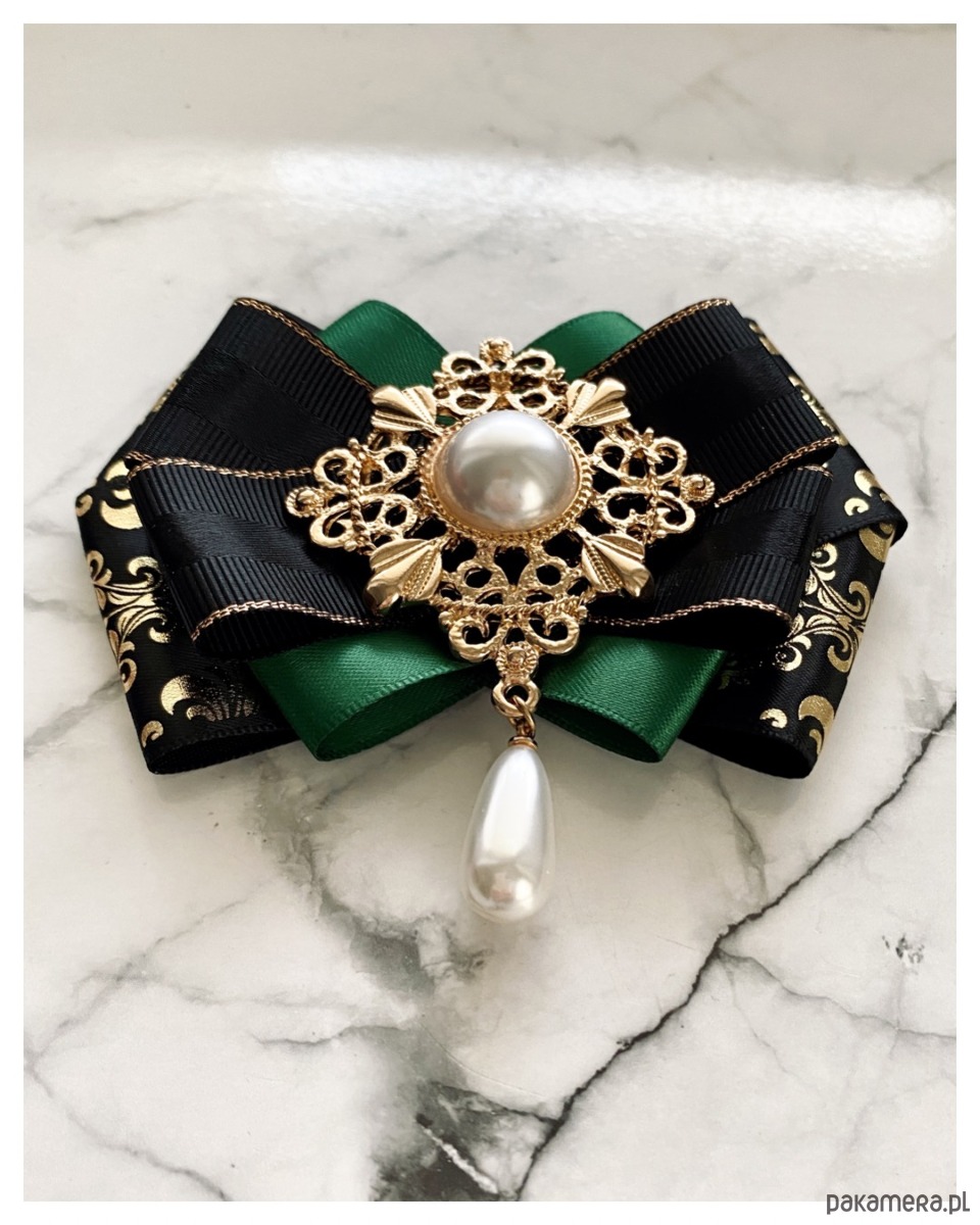 Brosza w kolorze szlachetnego zielonego, czerni i złota.