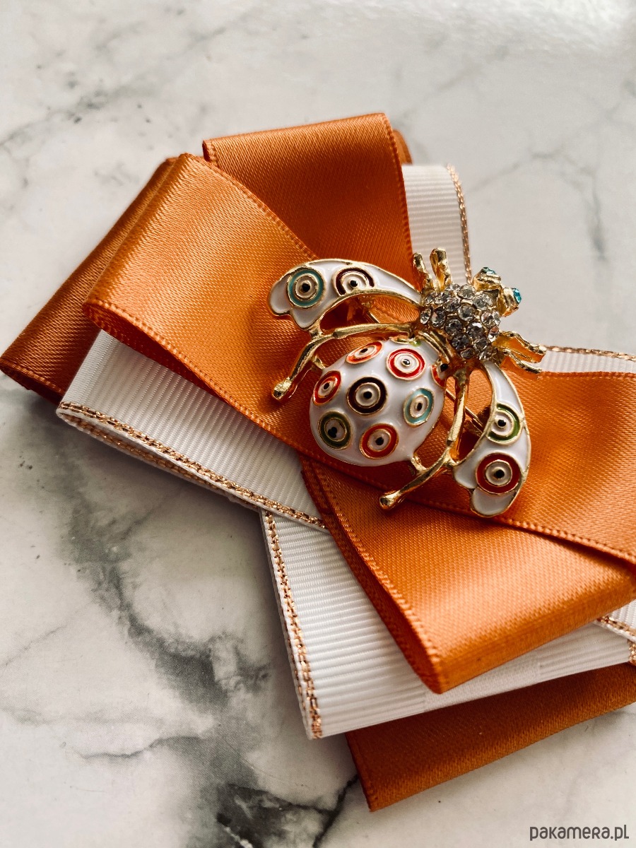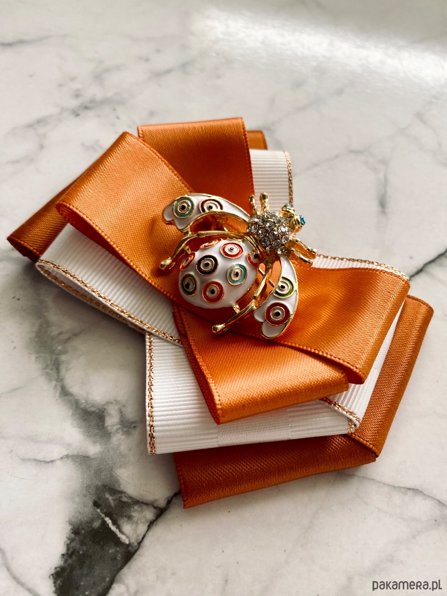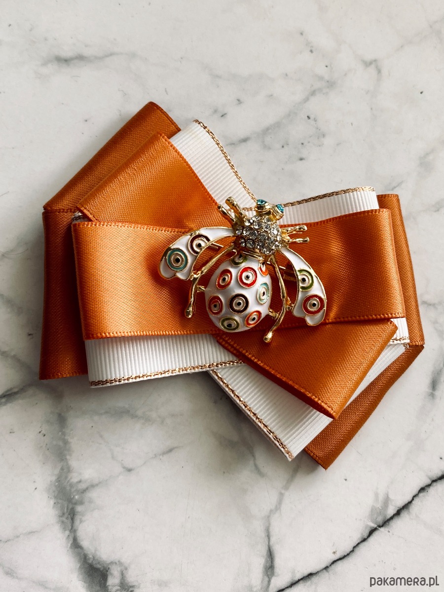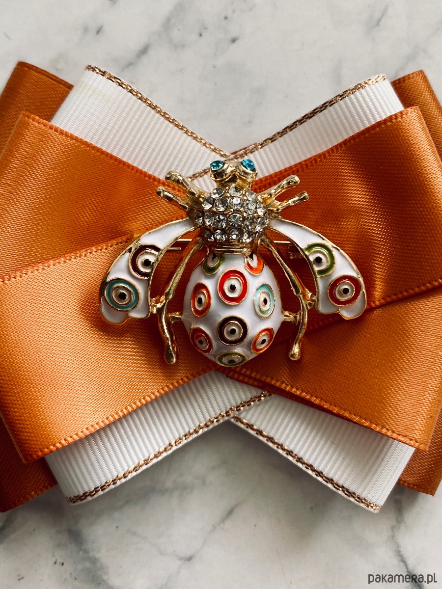 Broszka wykonana z wysokiej jakości taśm i dodatków.