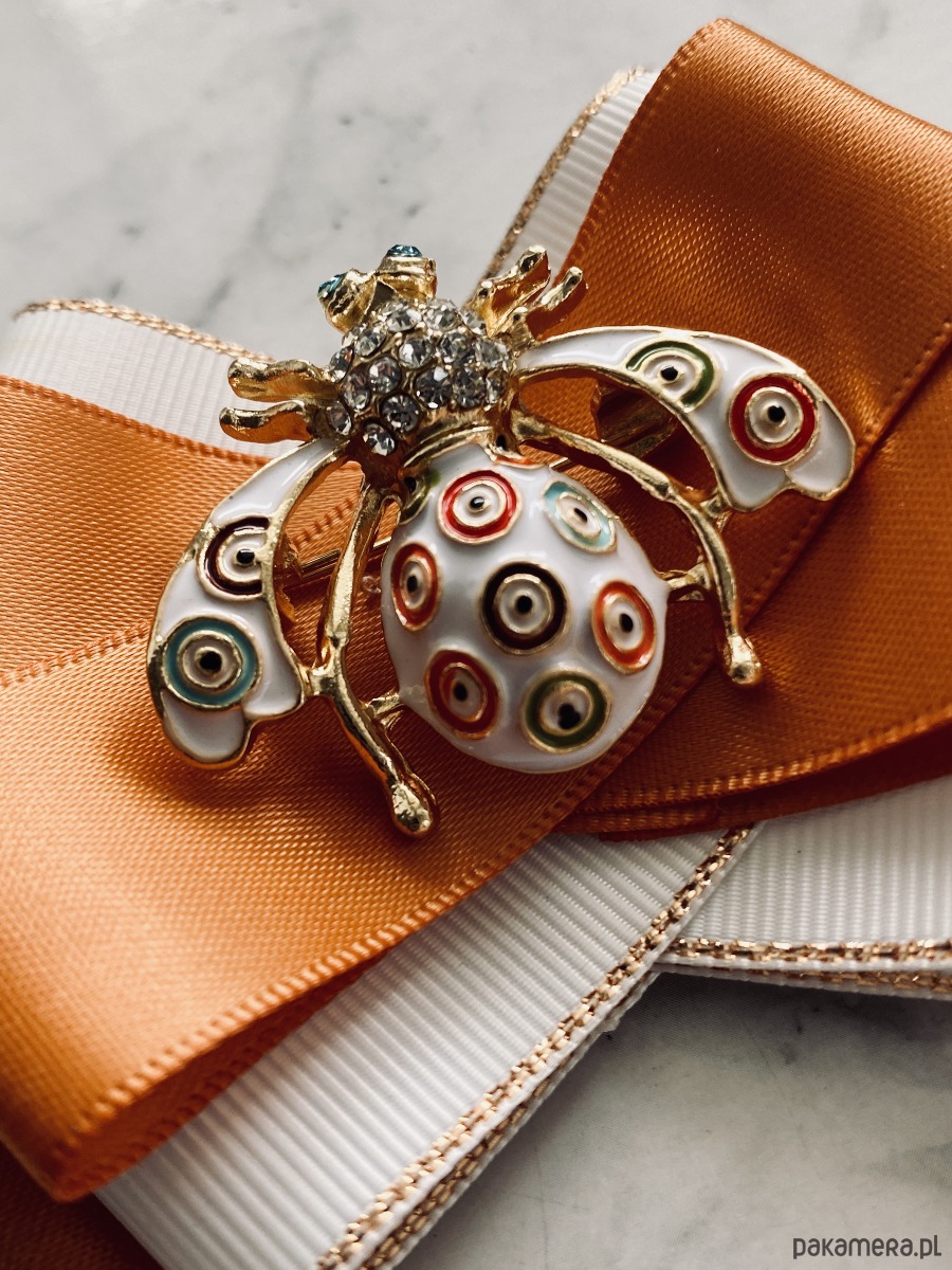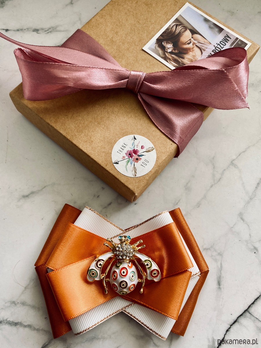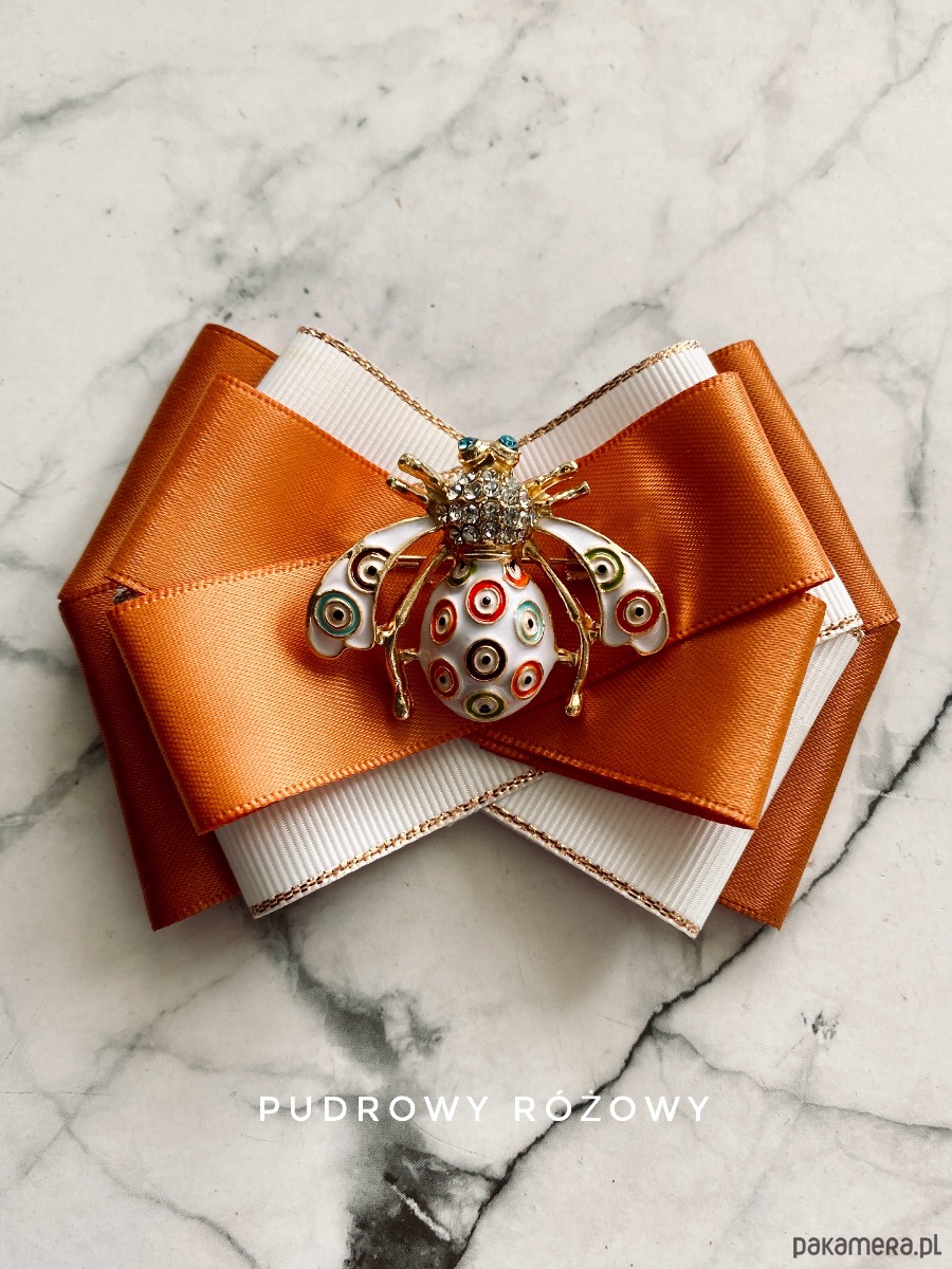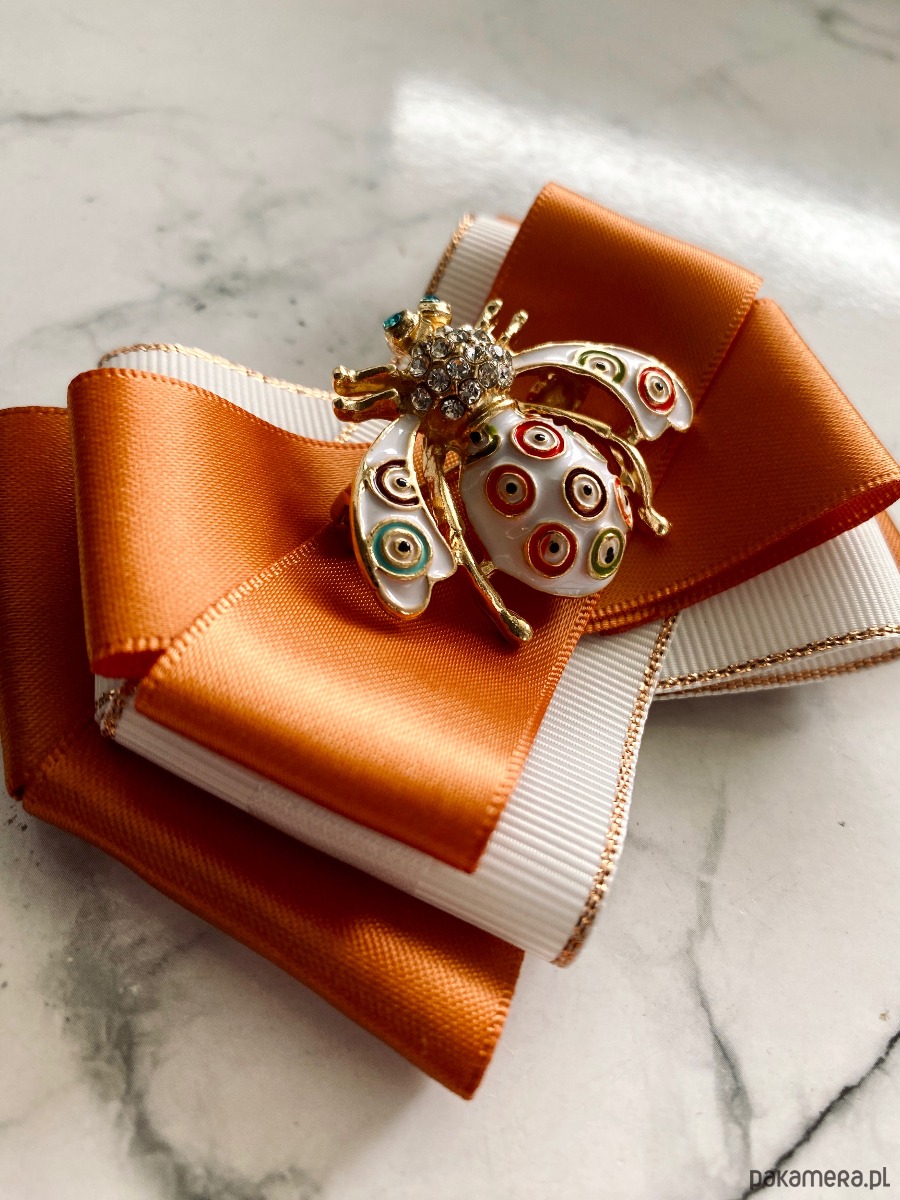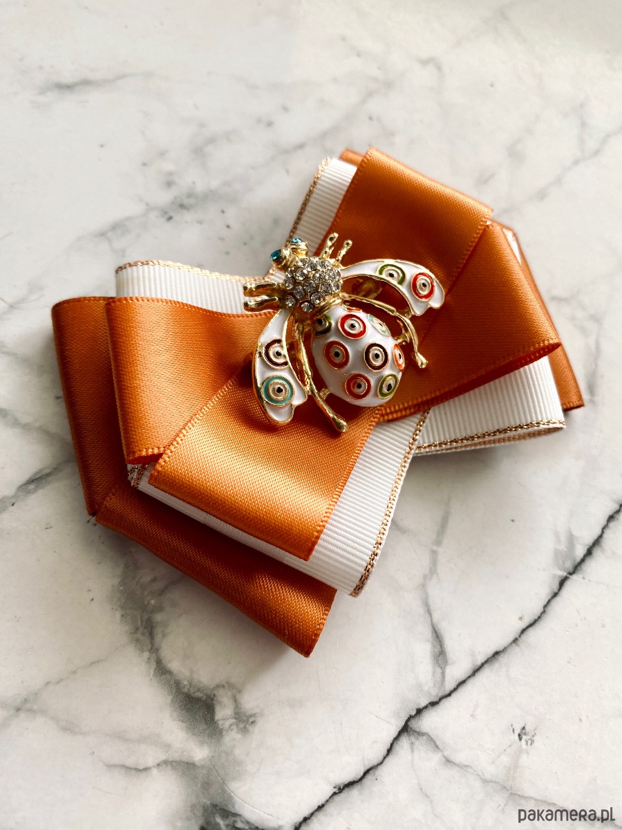 Broszka wykonana z wysokiej jakości taśm i dodatków.
