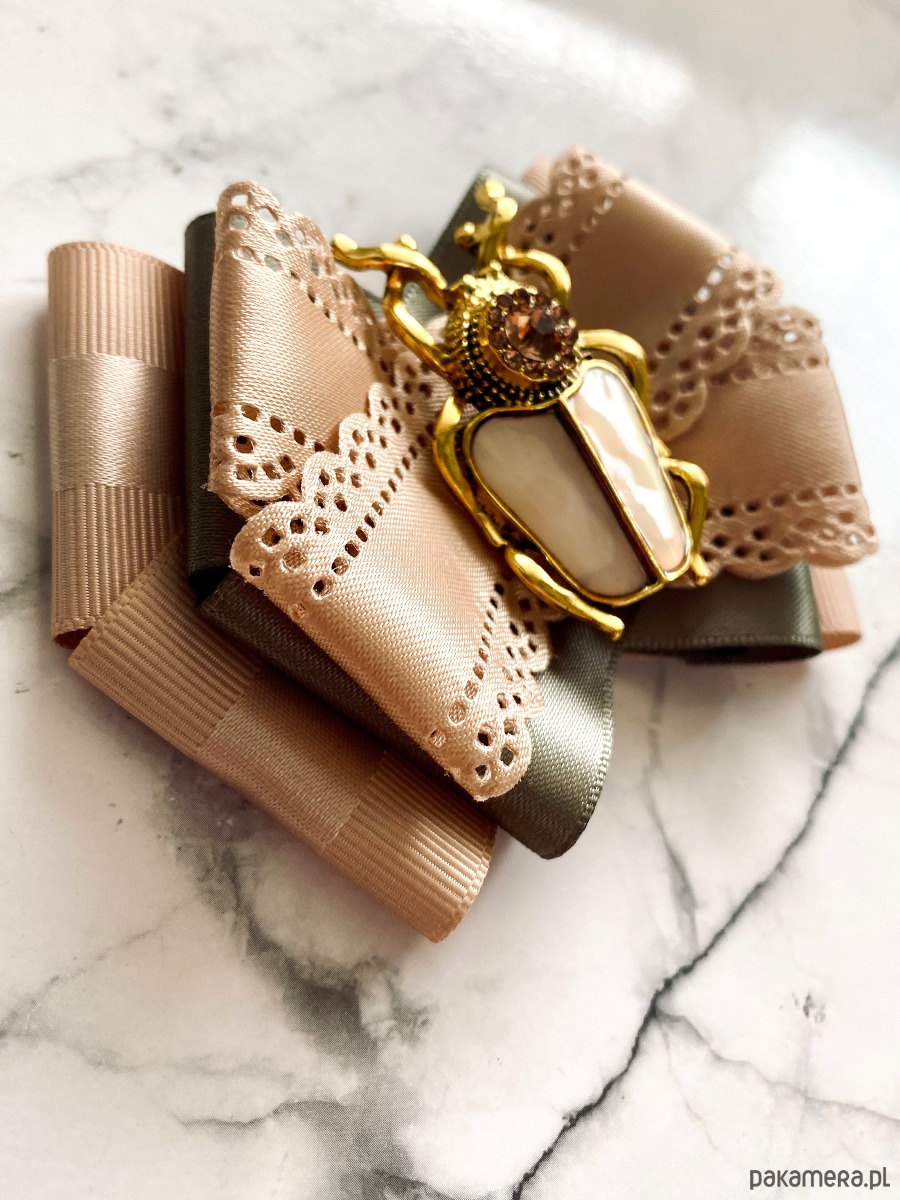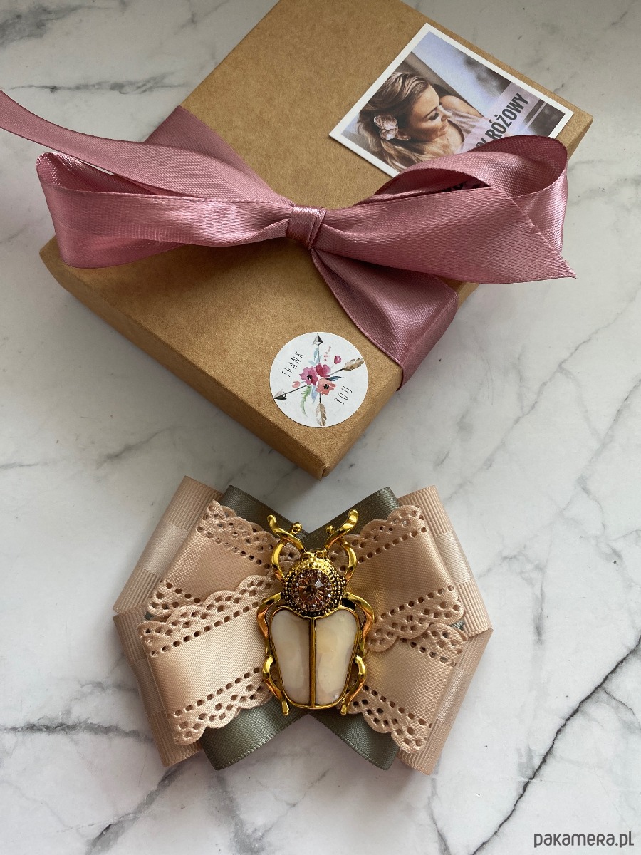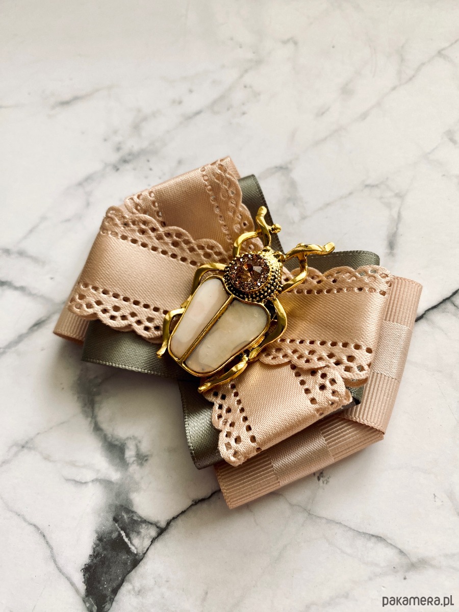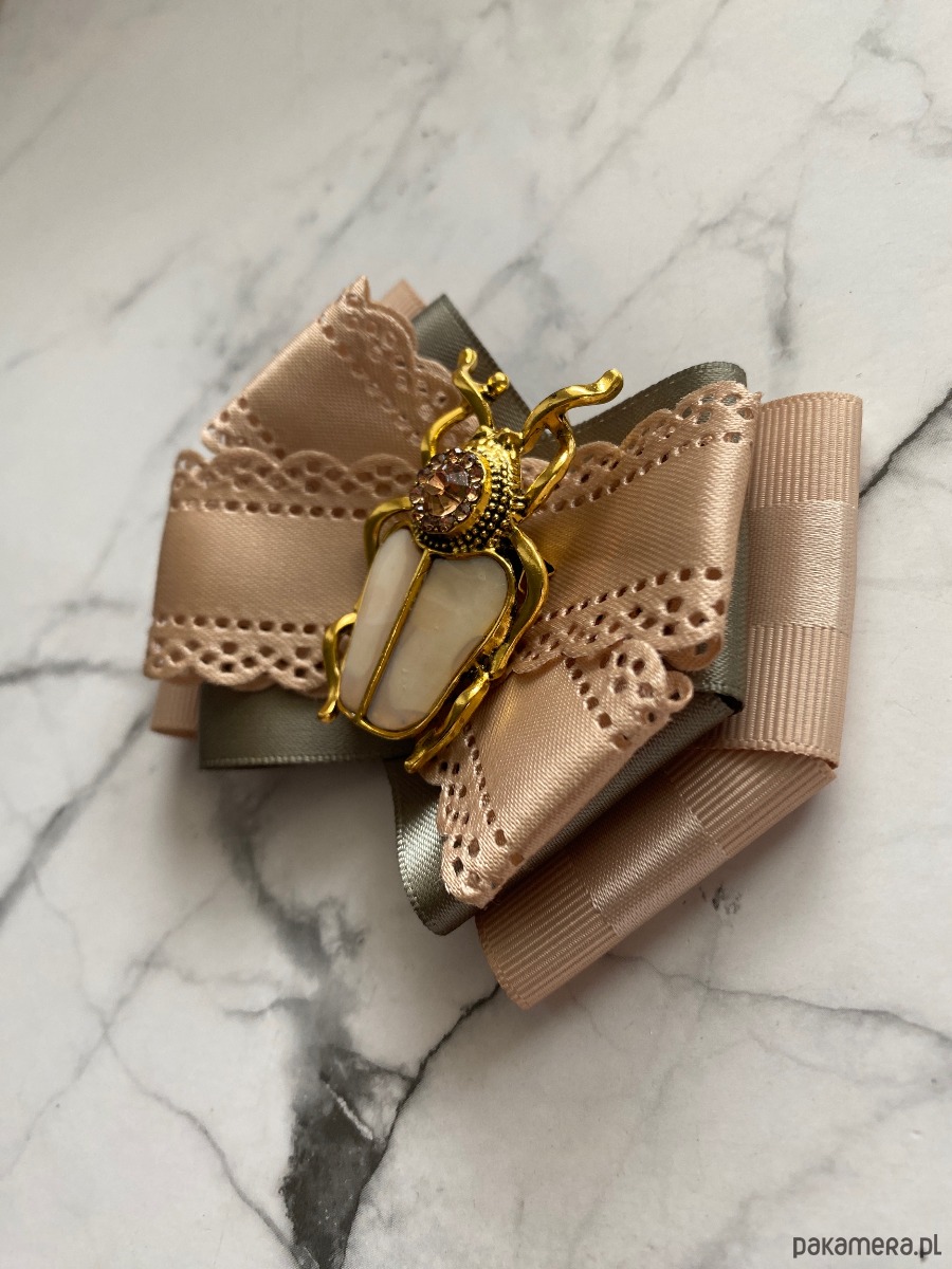 Broszka wykonana z wysokiej jakości taśm i dodatków.