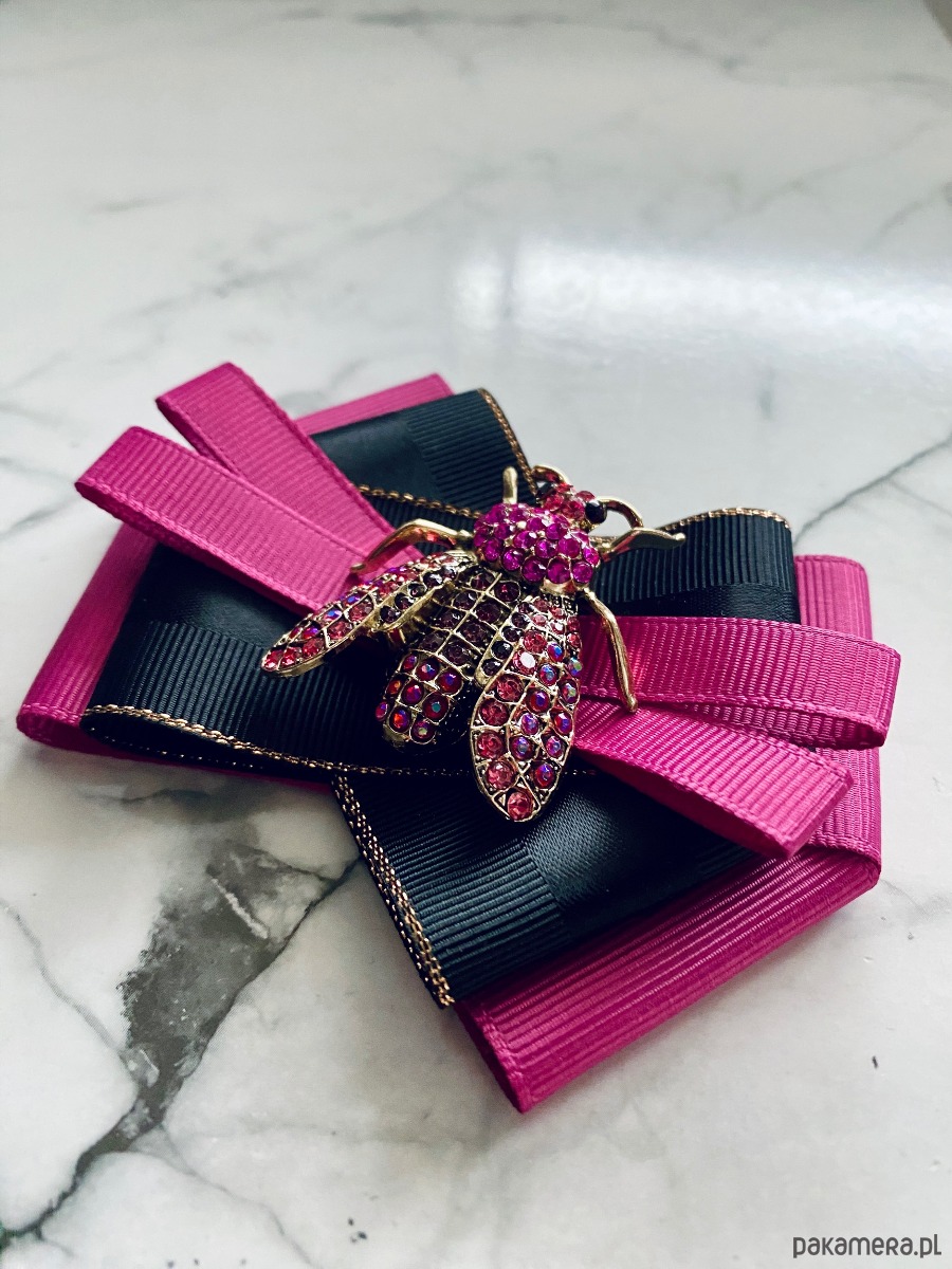 Piękna okazala ozdoba na środku, Owad wykonany z drobnych kryształków w kolorach różu.