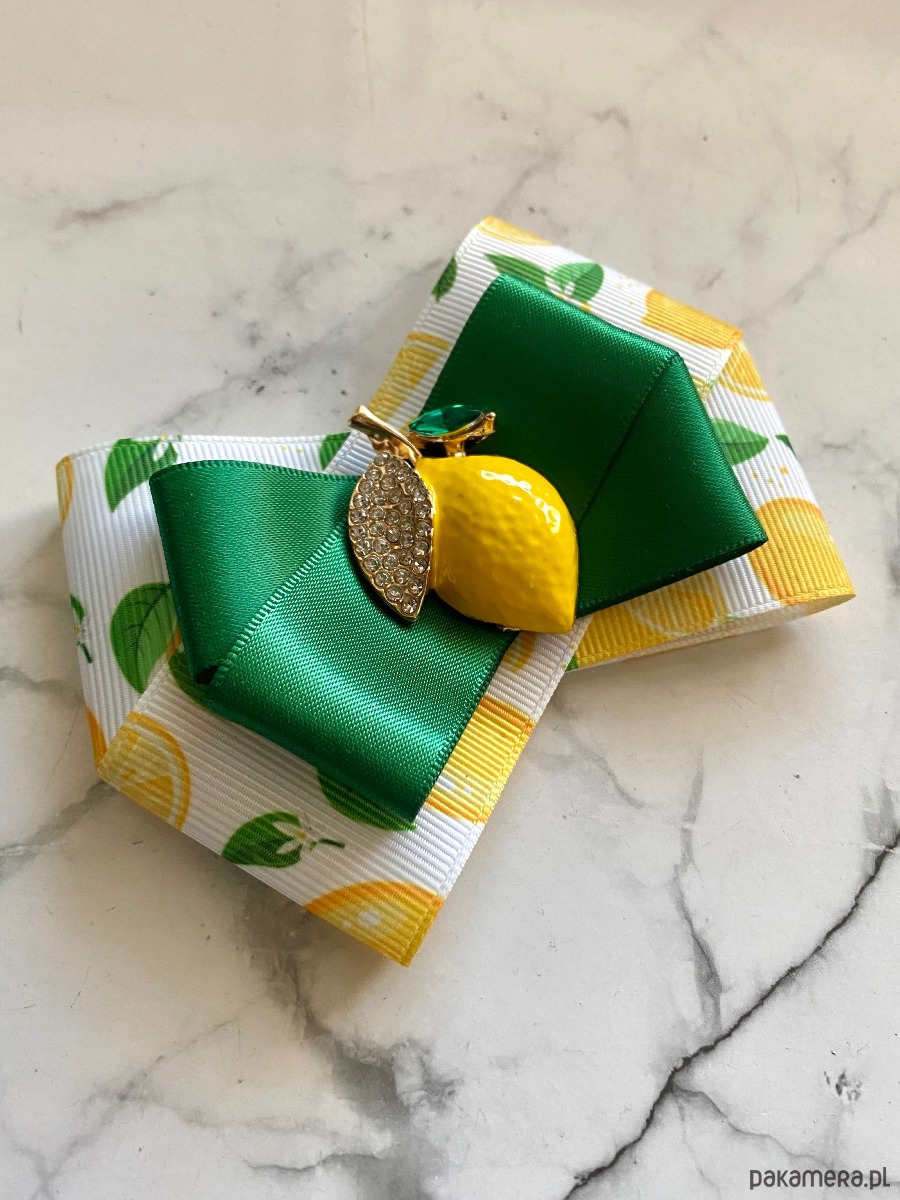 Kolory zieleni i słonecznego żółtego w połączeniu z piękną ozdobą trójwymiarową cytrynką z listkiem wysadzanym kryształkami i zielonym kryształem.