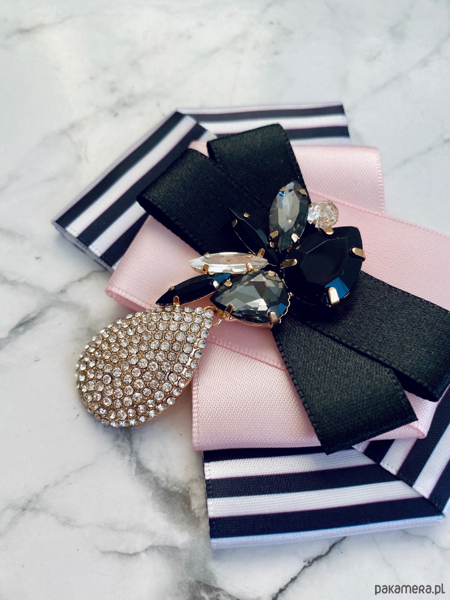 Na środku naszyta piękna ozdoba biżuteryjna. Kryształy w kolorze czarnym i szarym oraz wiszący element pokryty cyrkoniami.