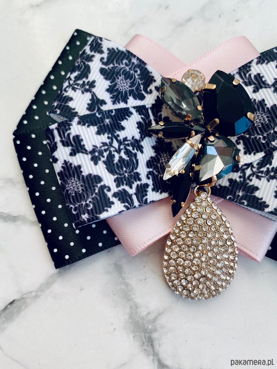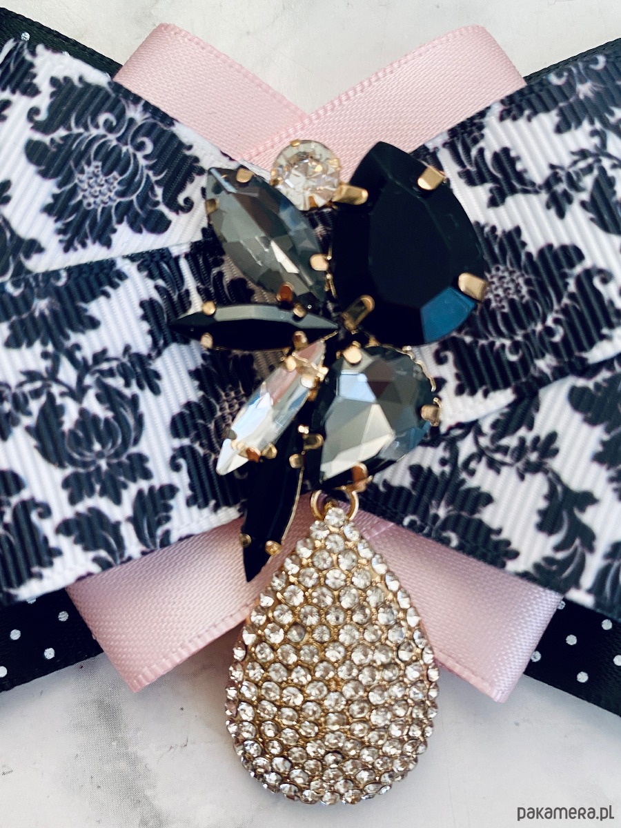 Na środku naszyta piękna ozdoba biżuteryjna. Kryształy w kolorze czarnym i szarym oraz wiszący element pokryty cyrkoniami.