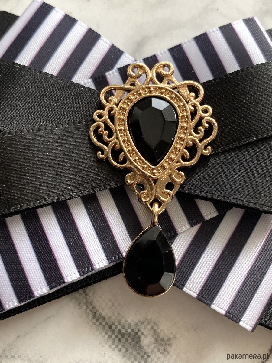 Na środku naszyta prześliczna, delikatna ozdoba biżuteryjna z kryształkiem w kolorze czarnym.