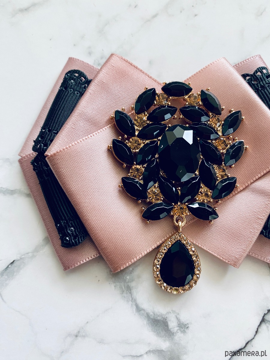 Na środku piękna i okazała ozdoba biżuteryjna , czarne kryształy w połączeniu ze złotą oprawą.