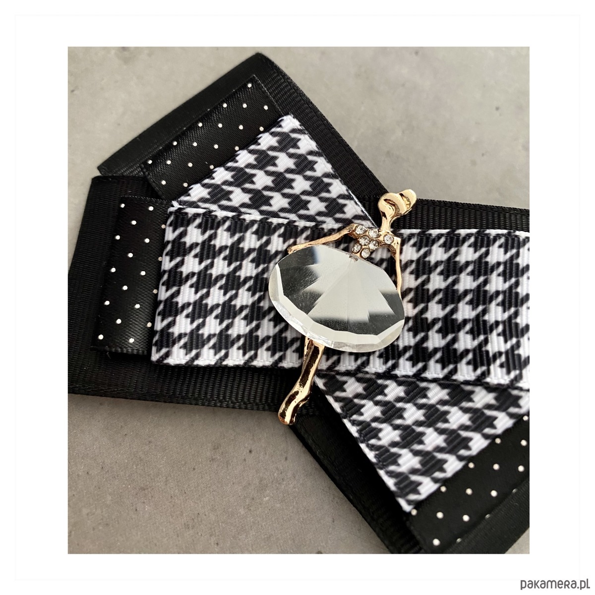 Broszka wykonana z wysokiej jakości taśm i dodatków.