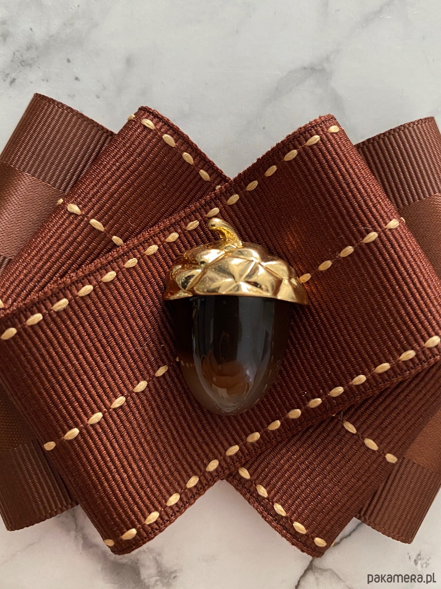 Piękna delikatna ozdoba na środku, żołądź w kolorze brązu ze złotym kapeluszem.