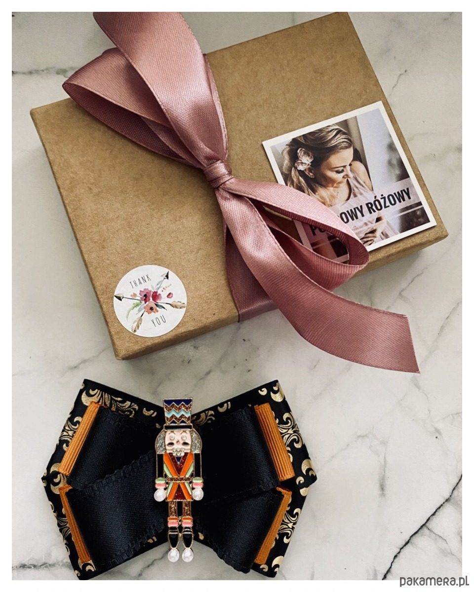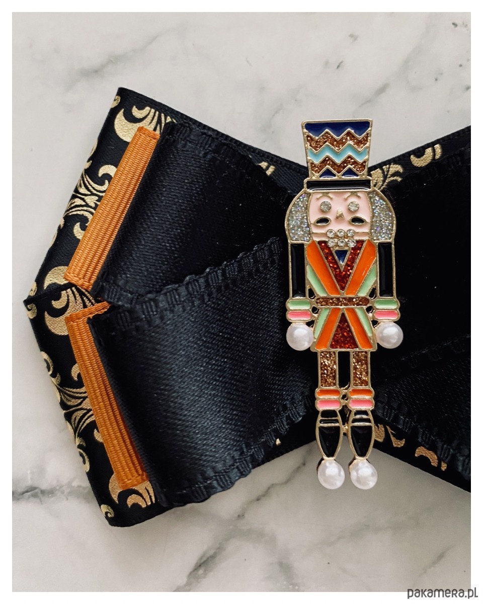 Broszka wykonana z wysokiej jakości taśm i dodatków.
