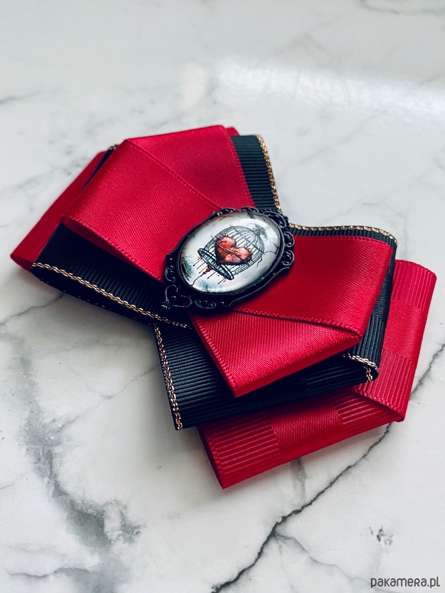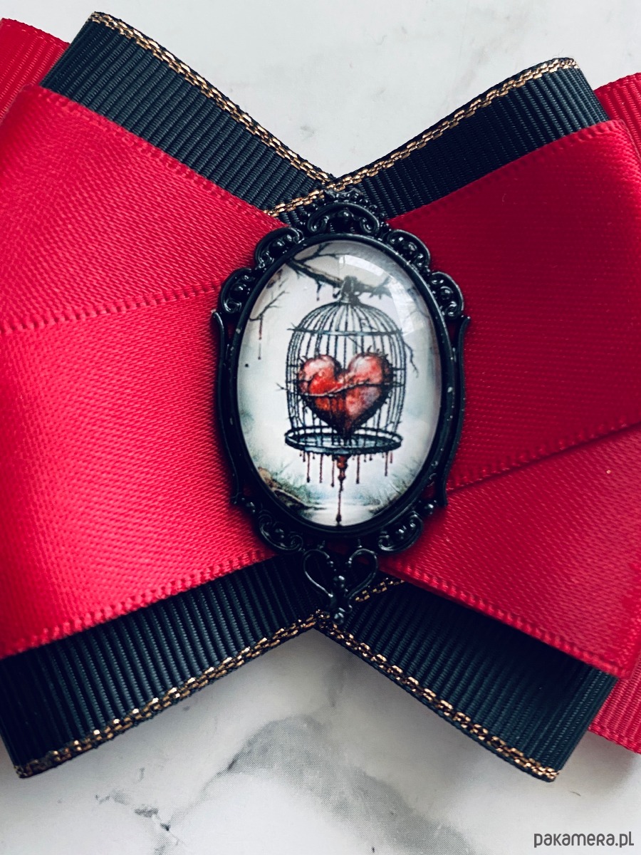 Broszka wykonana z wysokiej jakości taśm i dodatków.Delikatna grafika zamknięta pod szklanym kaboszonem oprawionym w ażurowej oprawie Wymownd serce zamknięte w klatce.