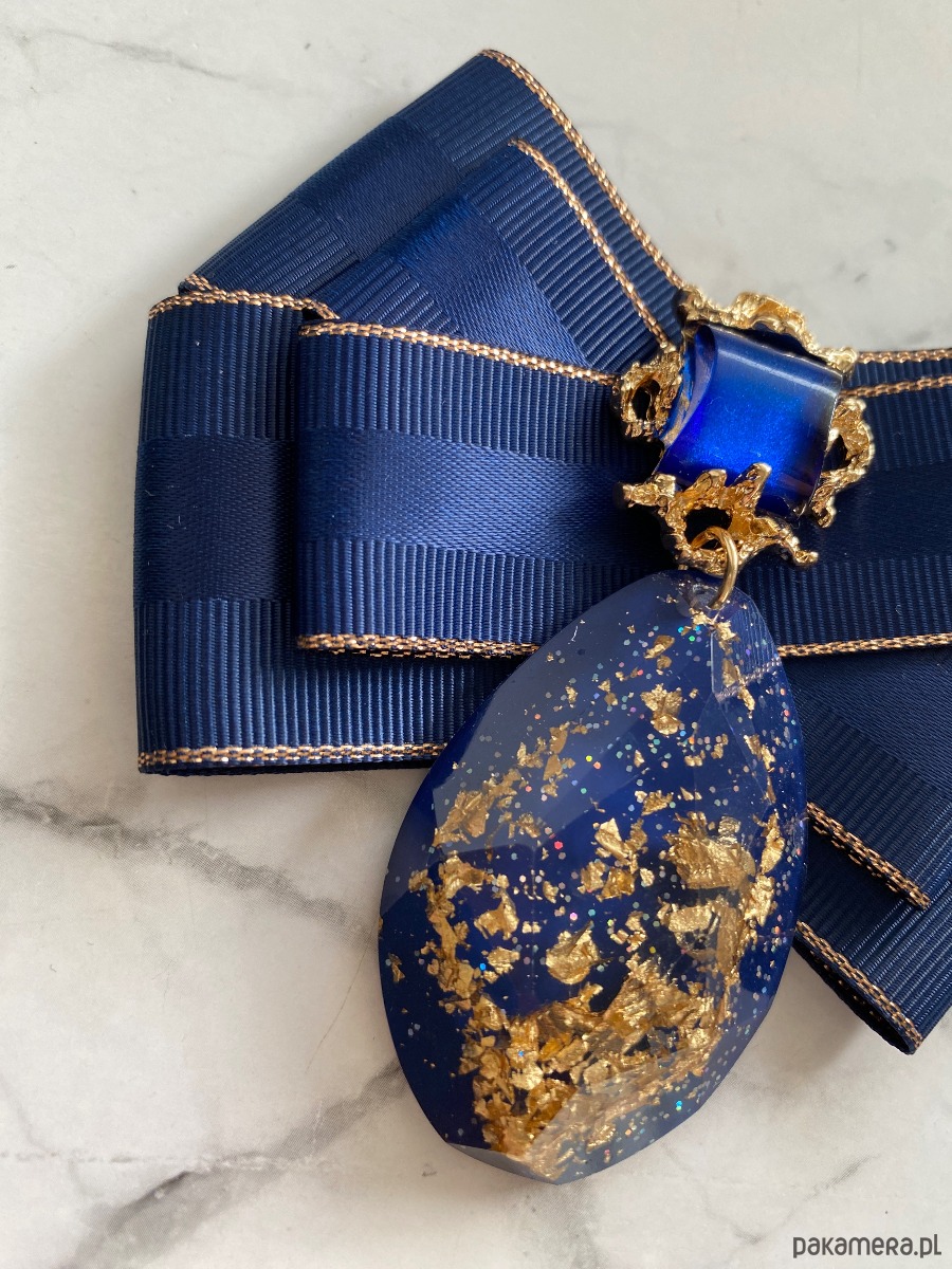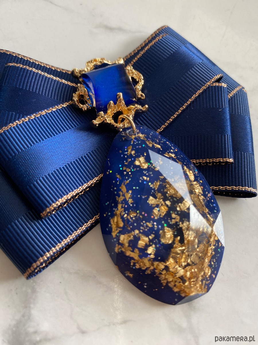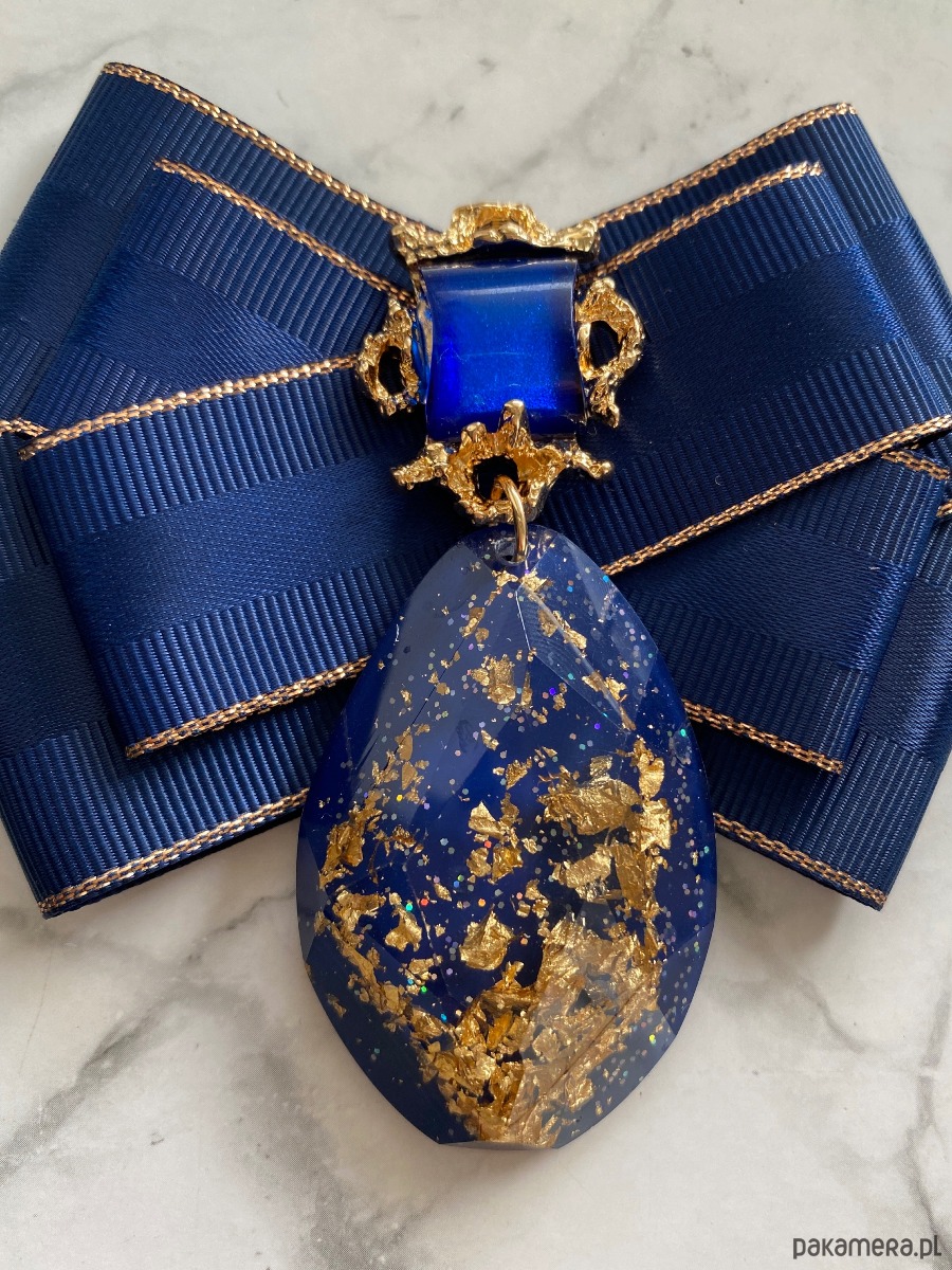 Na środku naszyta ogromna ozdoba z granatowym kamieniem, wiszący element wykonany z akrylu w którym zatopione są drobinki złota. Oprawa w kolorze złota.