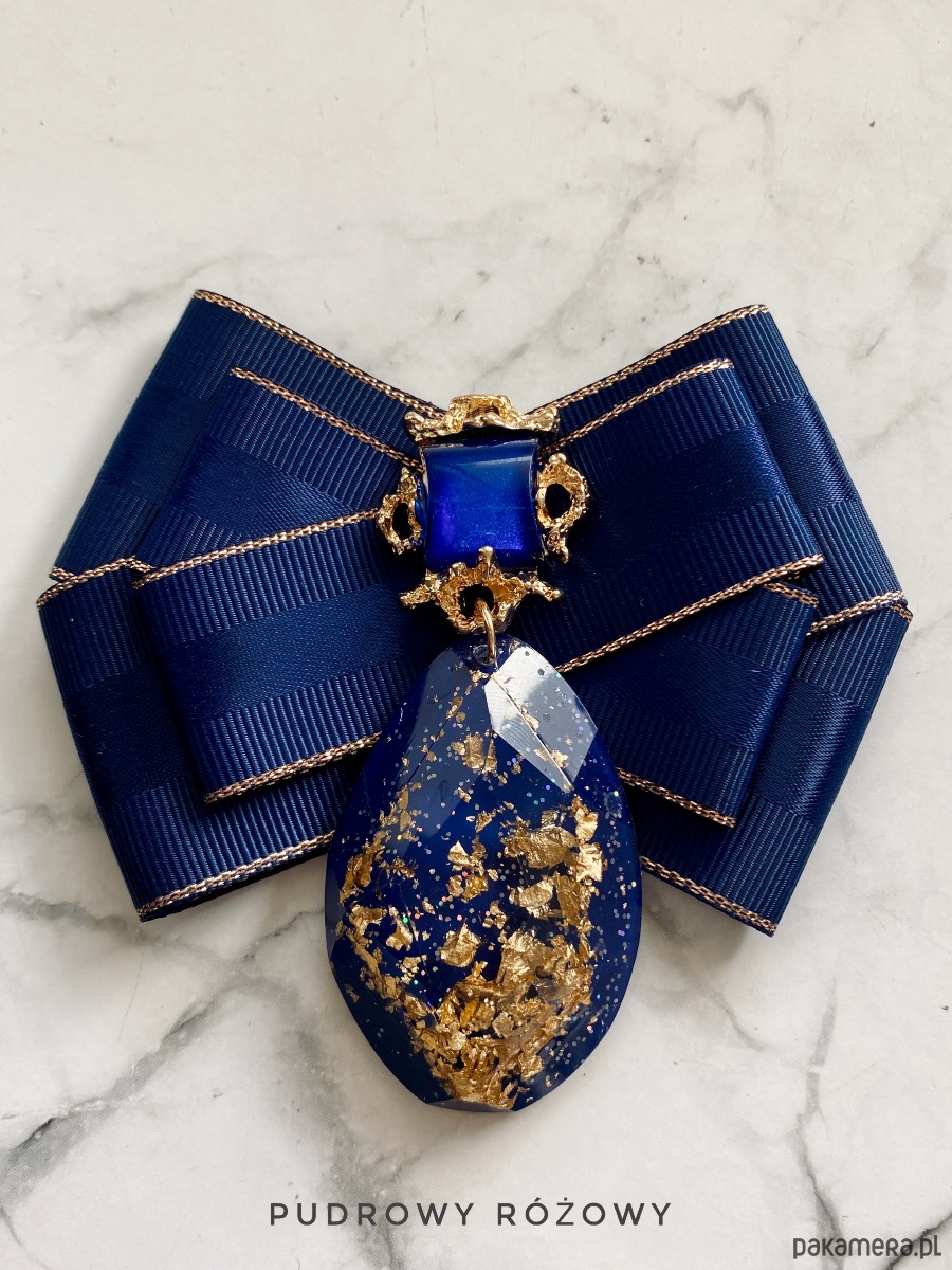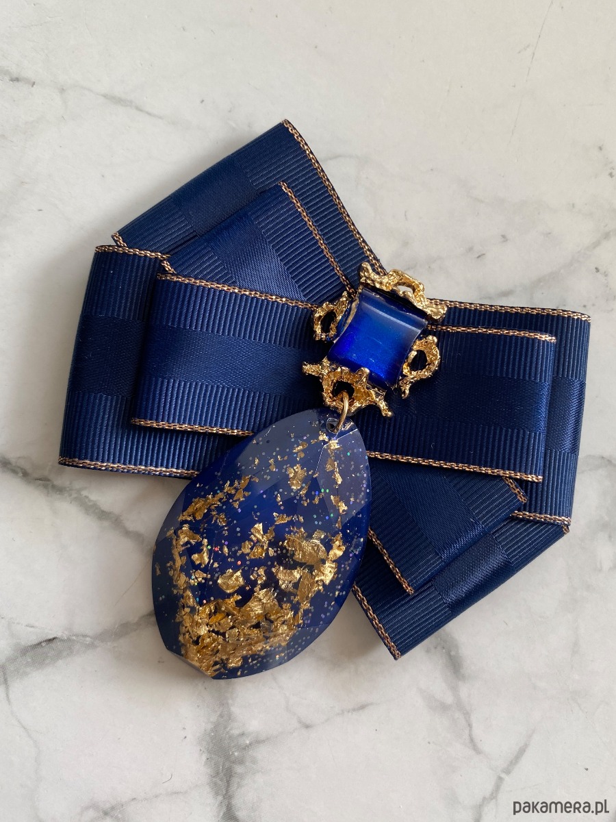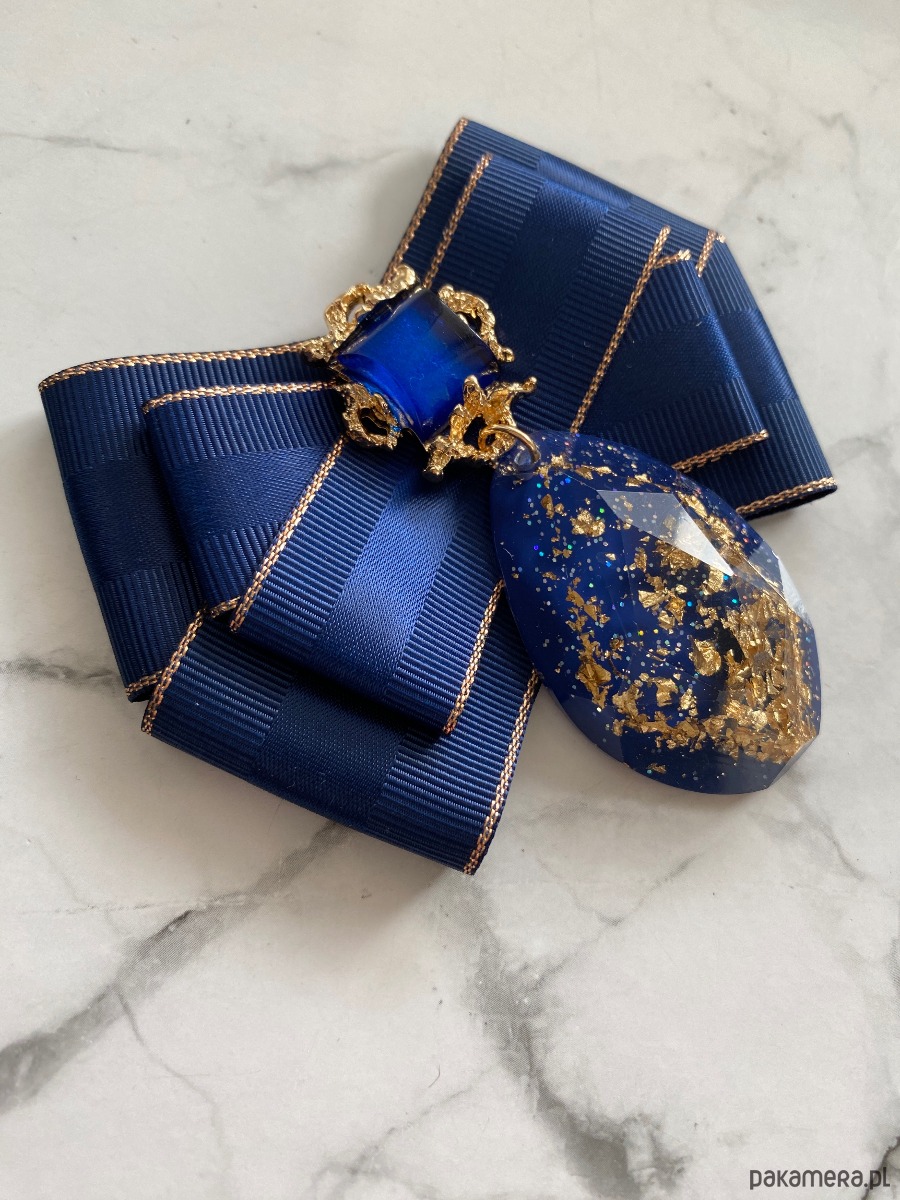 Na środku naszyta ogromna ozdoba z granatowym kamieniem, wiszący element wykonany z akrylu w którym zatopione są drobinki złota. Oprawa w kolorze złota.