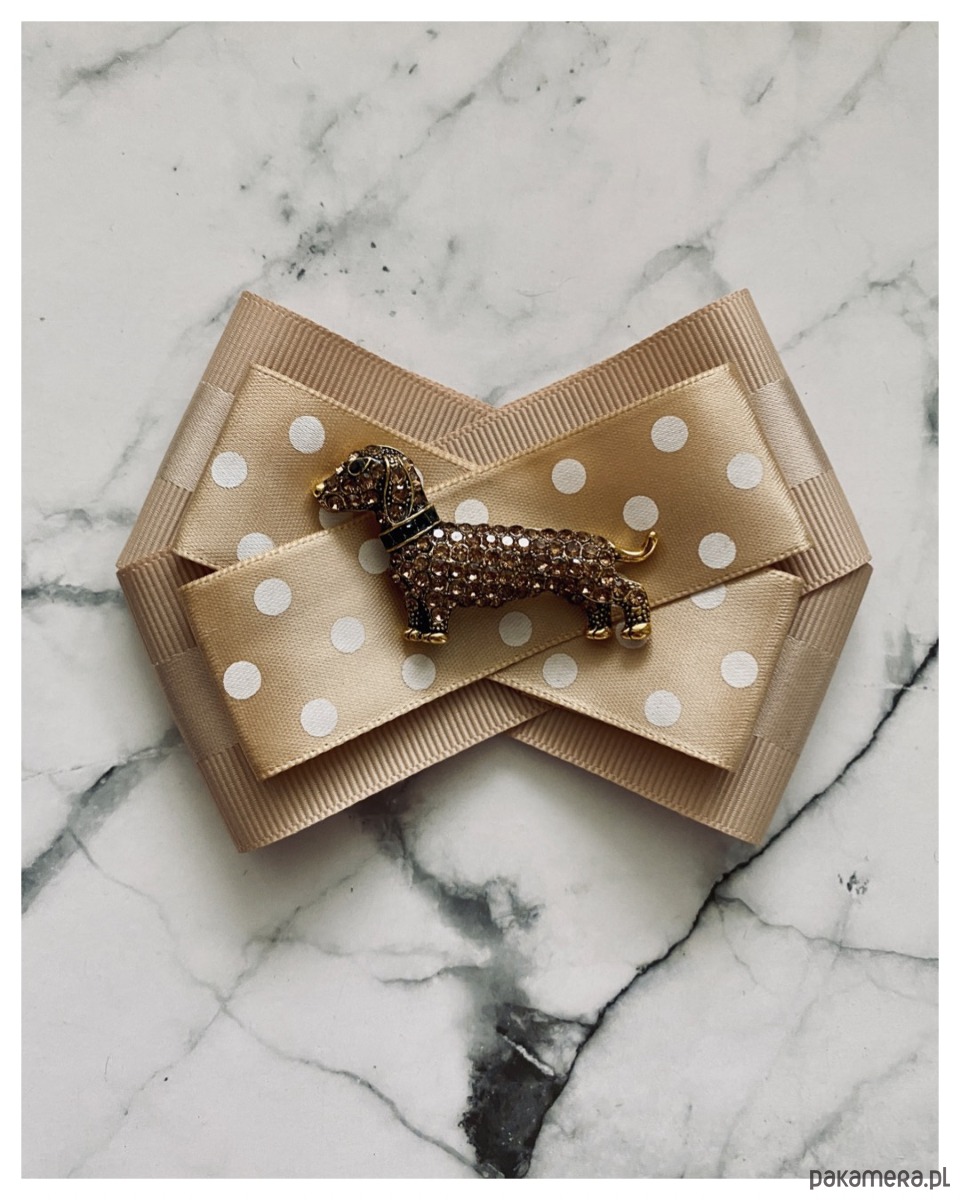Na środku naszyty prześliczny piesek jamnik wykonany z drobnych kryształków w kolorze brązowo szampańskim.