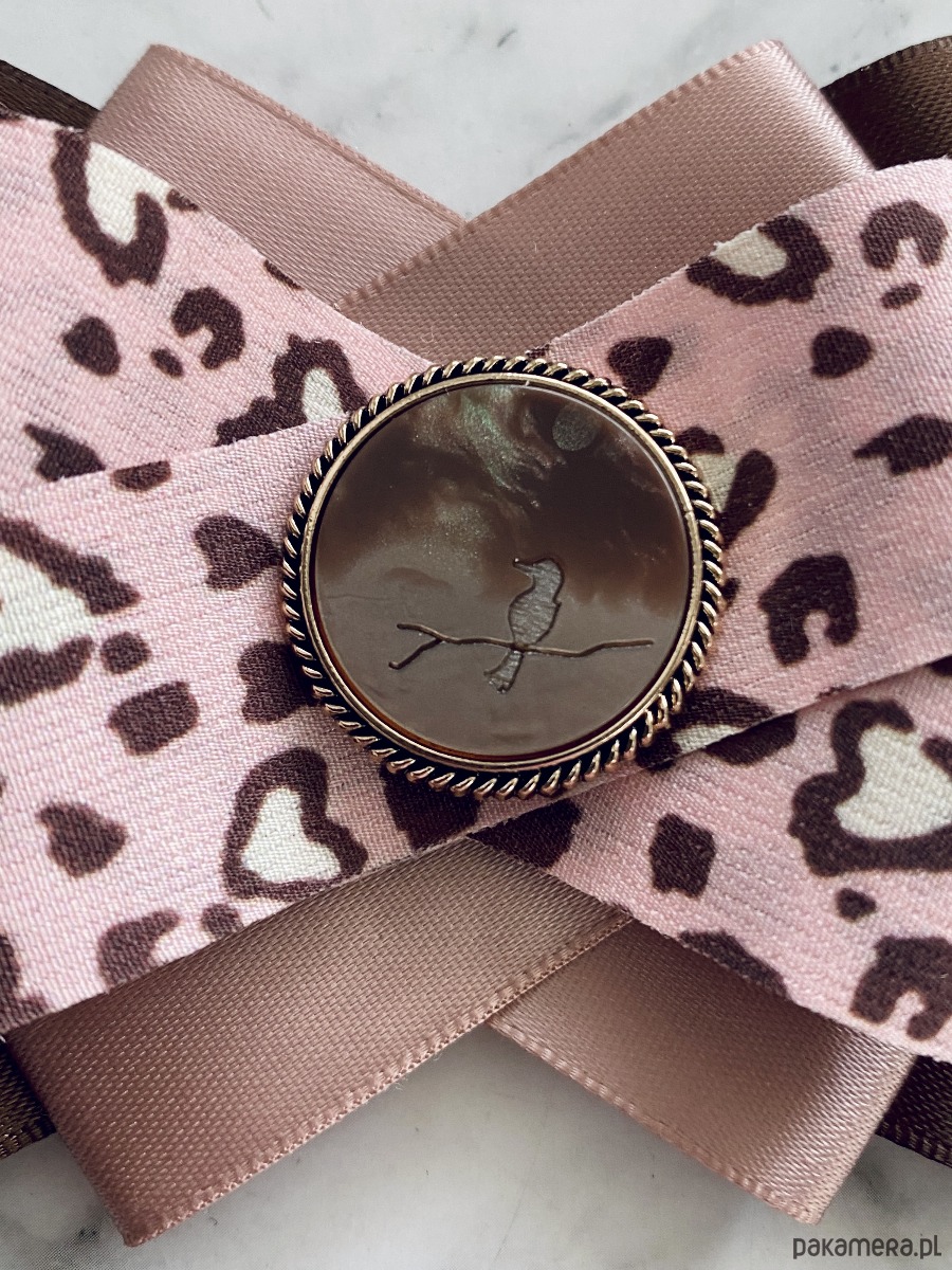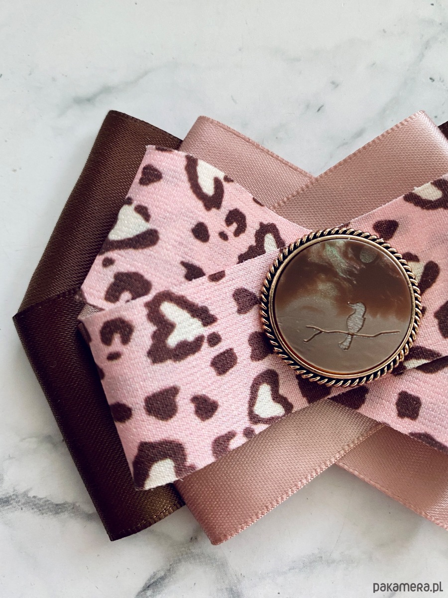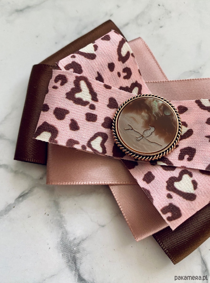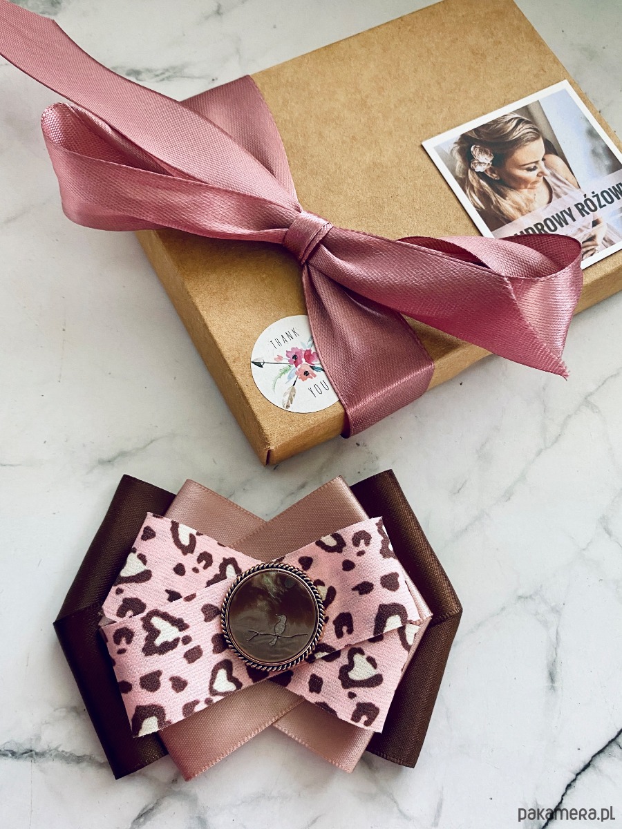 Brosza w kolorze czekoladowego brązu i pudrowego różu z dodatkiem cudnej wstążki w centki.