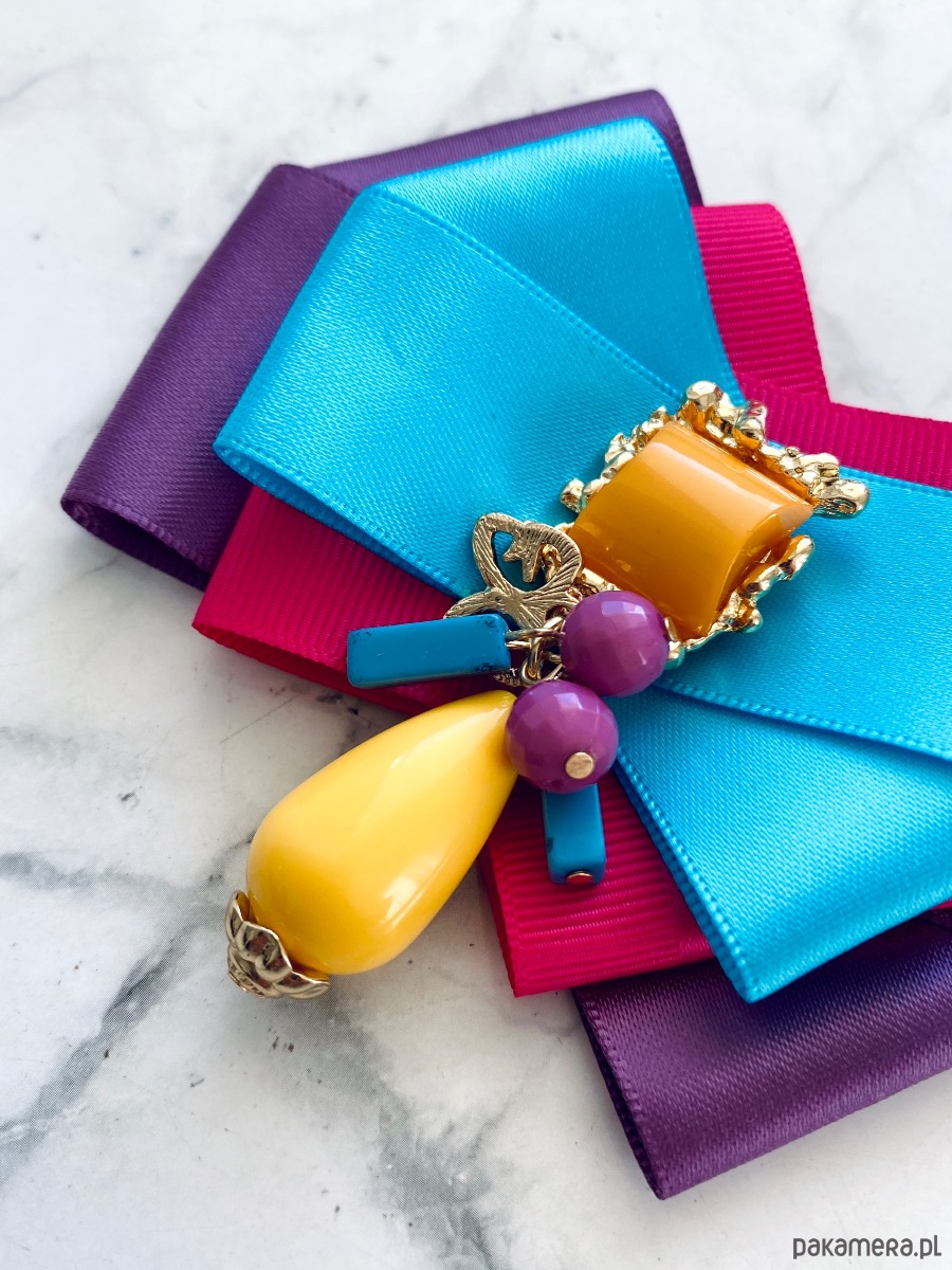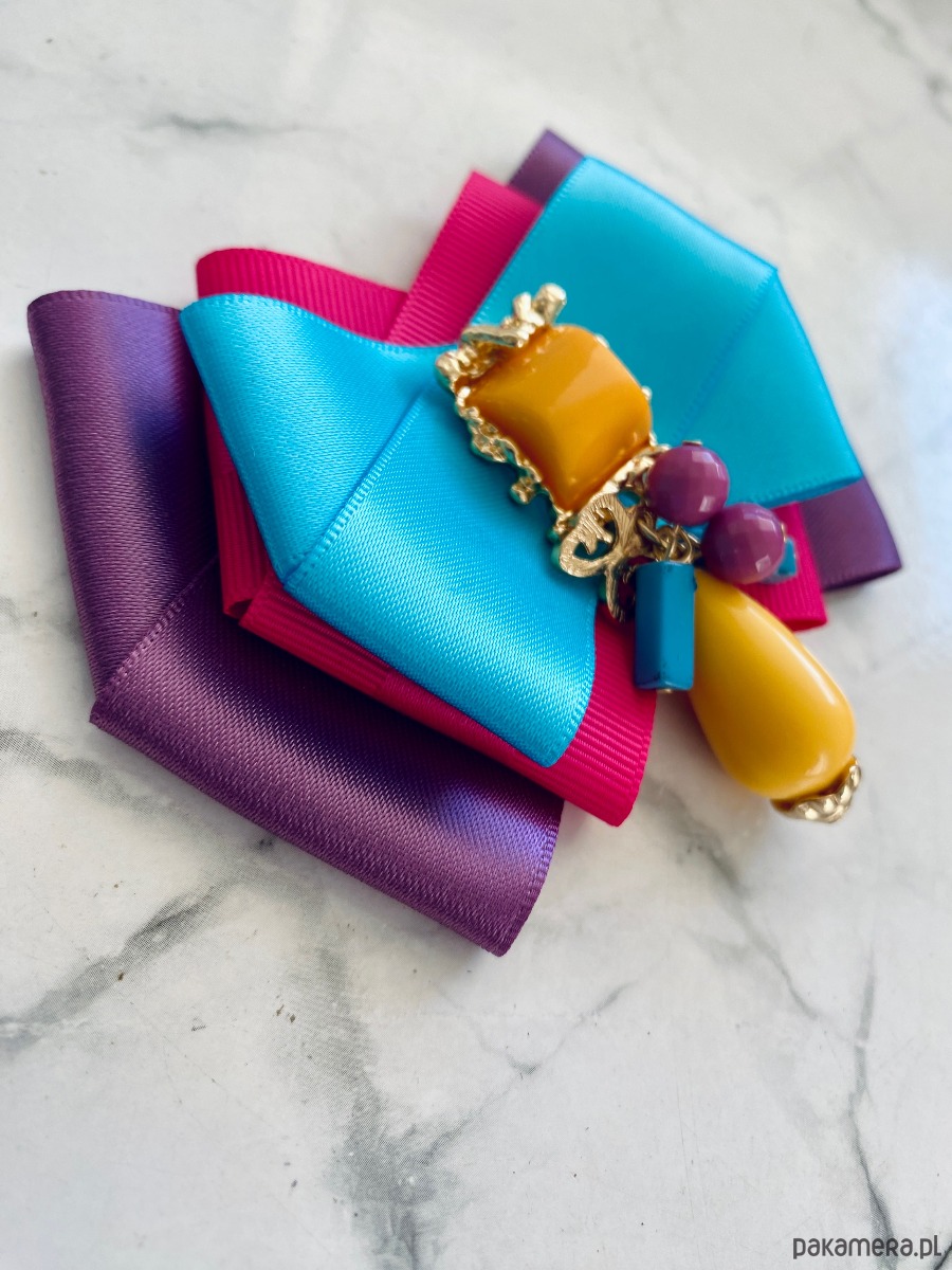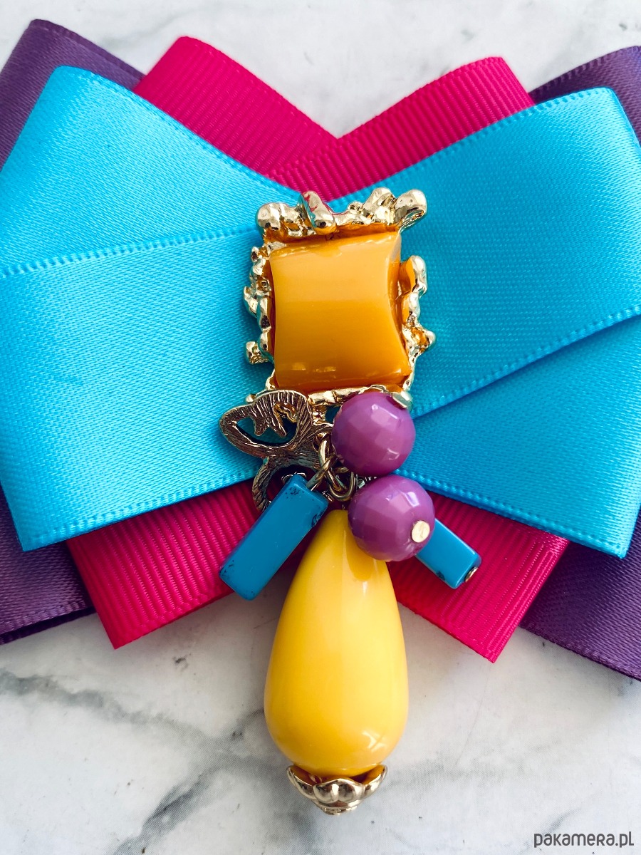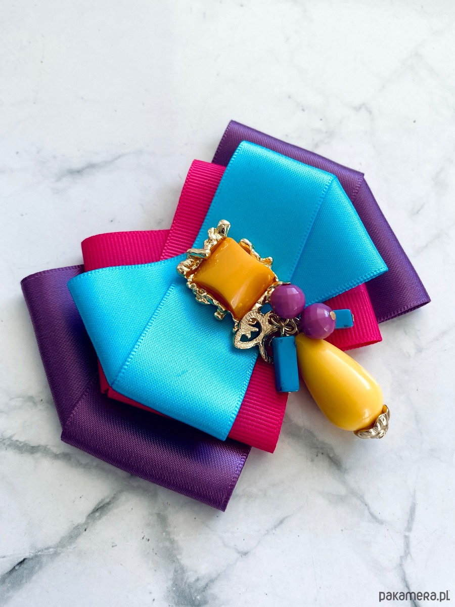Broszka wykonana z wysokiej jakości taśm i dodatków.