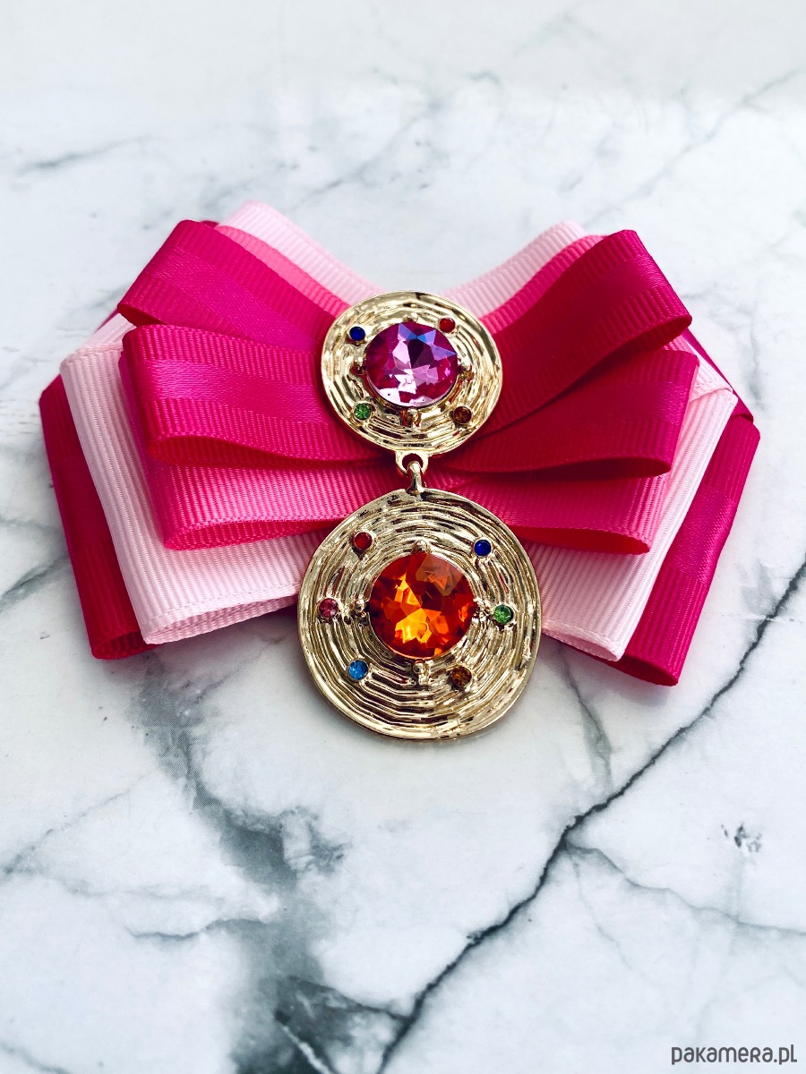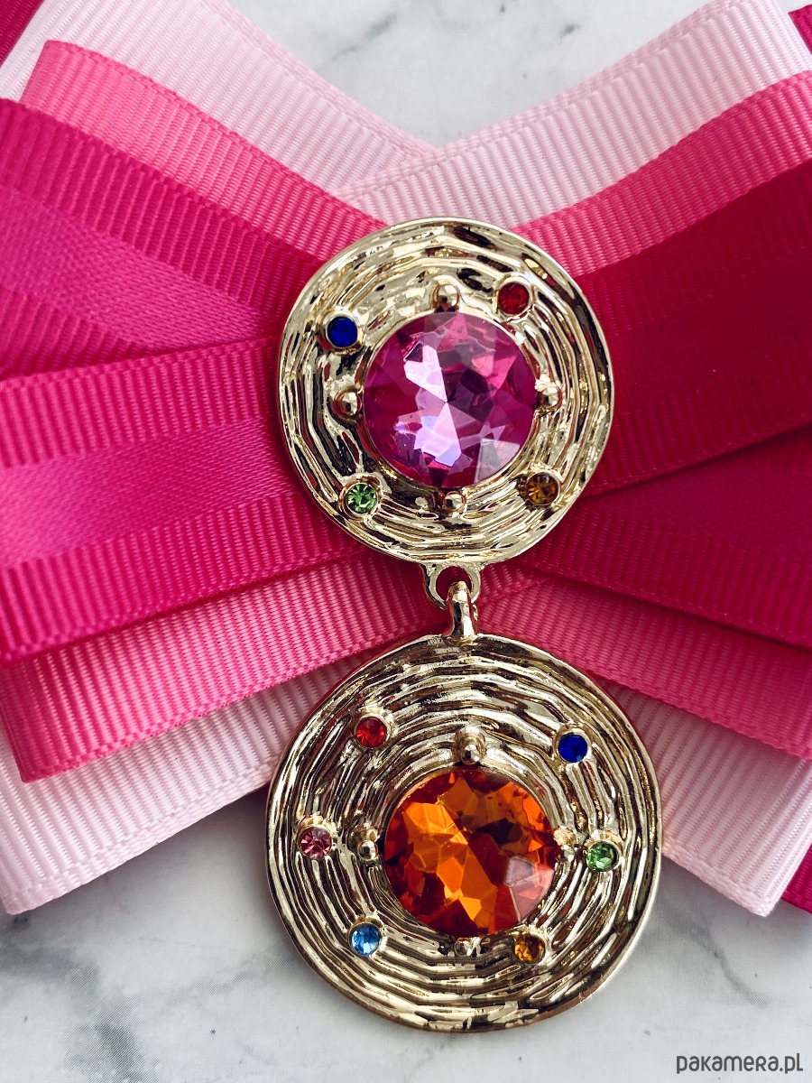 Intensywne Kolory w połączeniu z oryginalną ozdobą biżuteryjną tworzą duet niebanalny i zachwycający. Dwa złote okręgi z kryształami w kolorze fuksji i pomarańczu. Dodatkowo delikatne kolorowe drobne kryształki.
