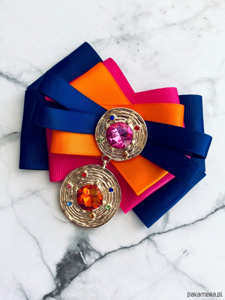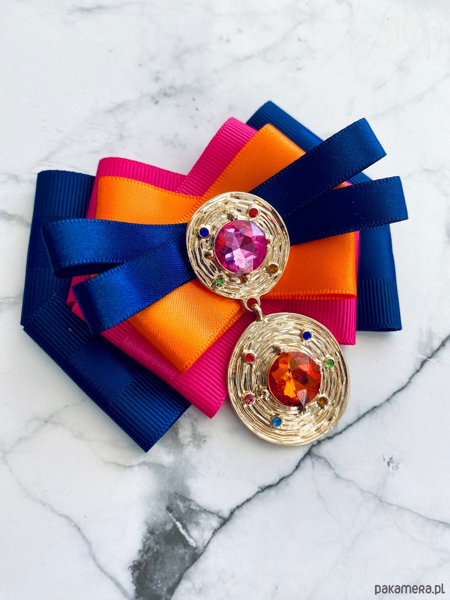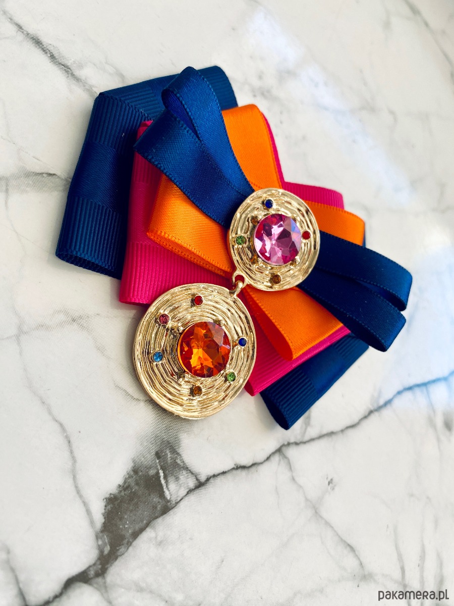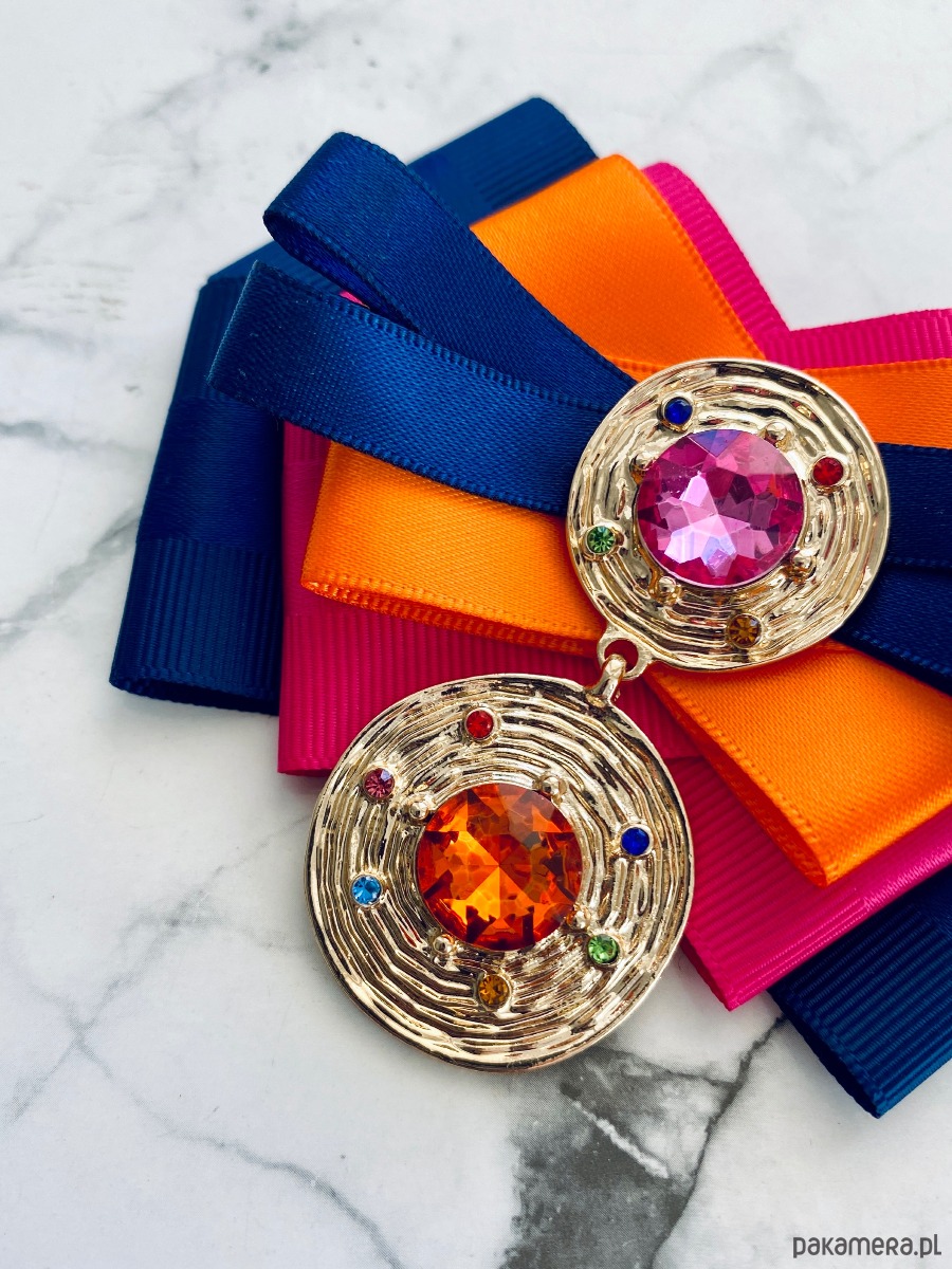 Intensywne Kolory w połączeniu z oryginalną ozdobą biżuteryjną tworzą duet niebanalny i zachwycający. Dwa złote okręgi z kryształami w kolorze fuksji i pomarańczu. Dodatkowo delikatne kolorowe drobne kryształki.