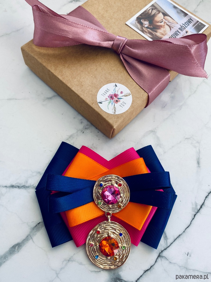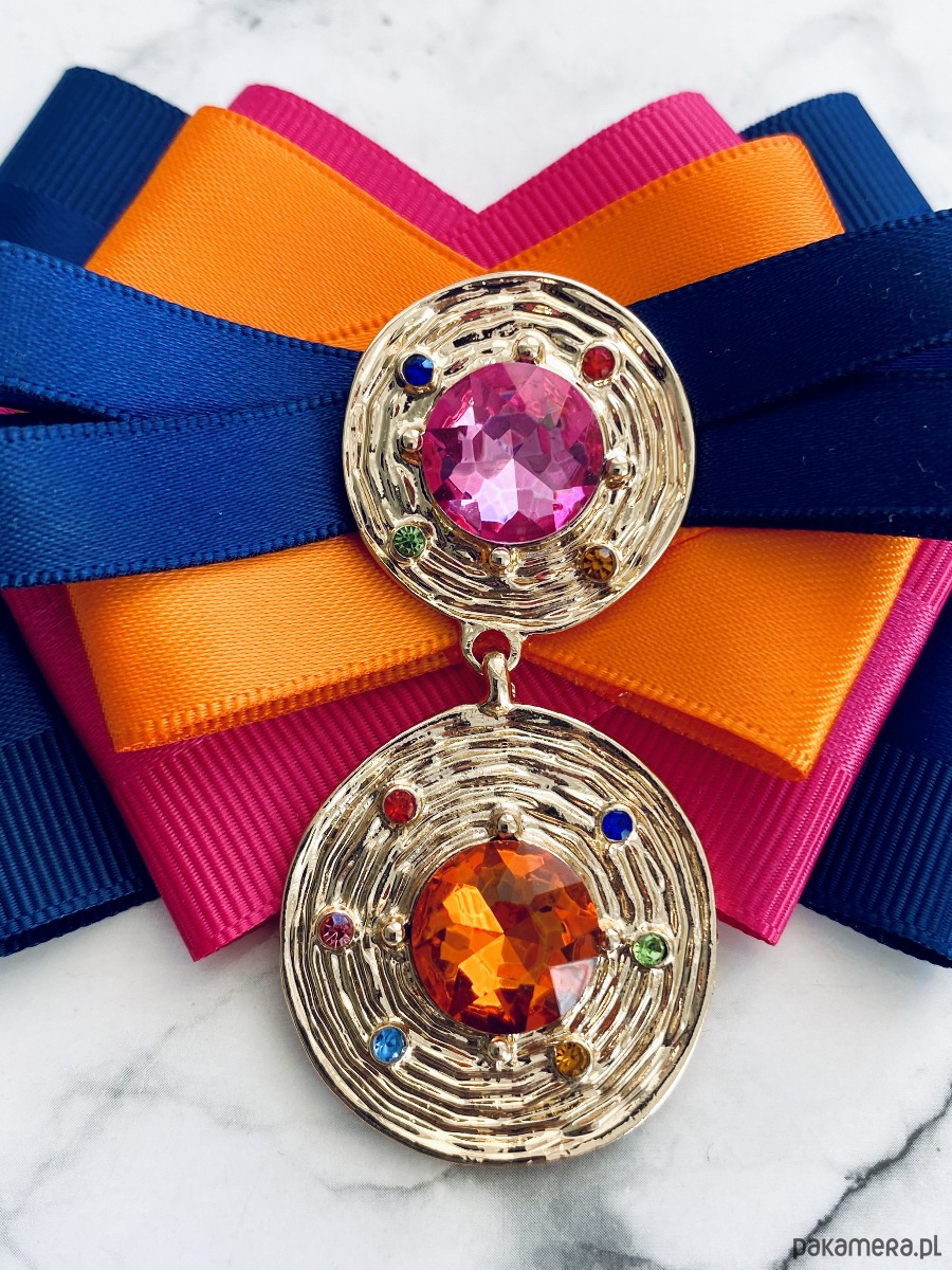 Broszka wykonana z wysokiej jakości taśm i dodatków.