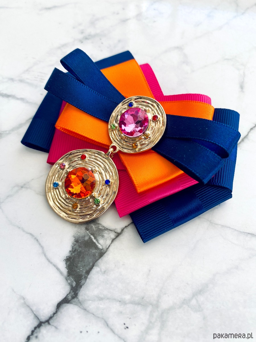 Intensywne Kolory w połączeniu z oryginalną ozdobą biżuteryjną tworzą duet niebanalny i zachwycający. Dwa złote okręgi z kryształami w kolorze fuksji i pomarańczu. Dodatkowo delikatne kolorowe drobne kryształki.