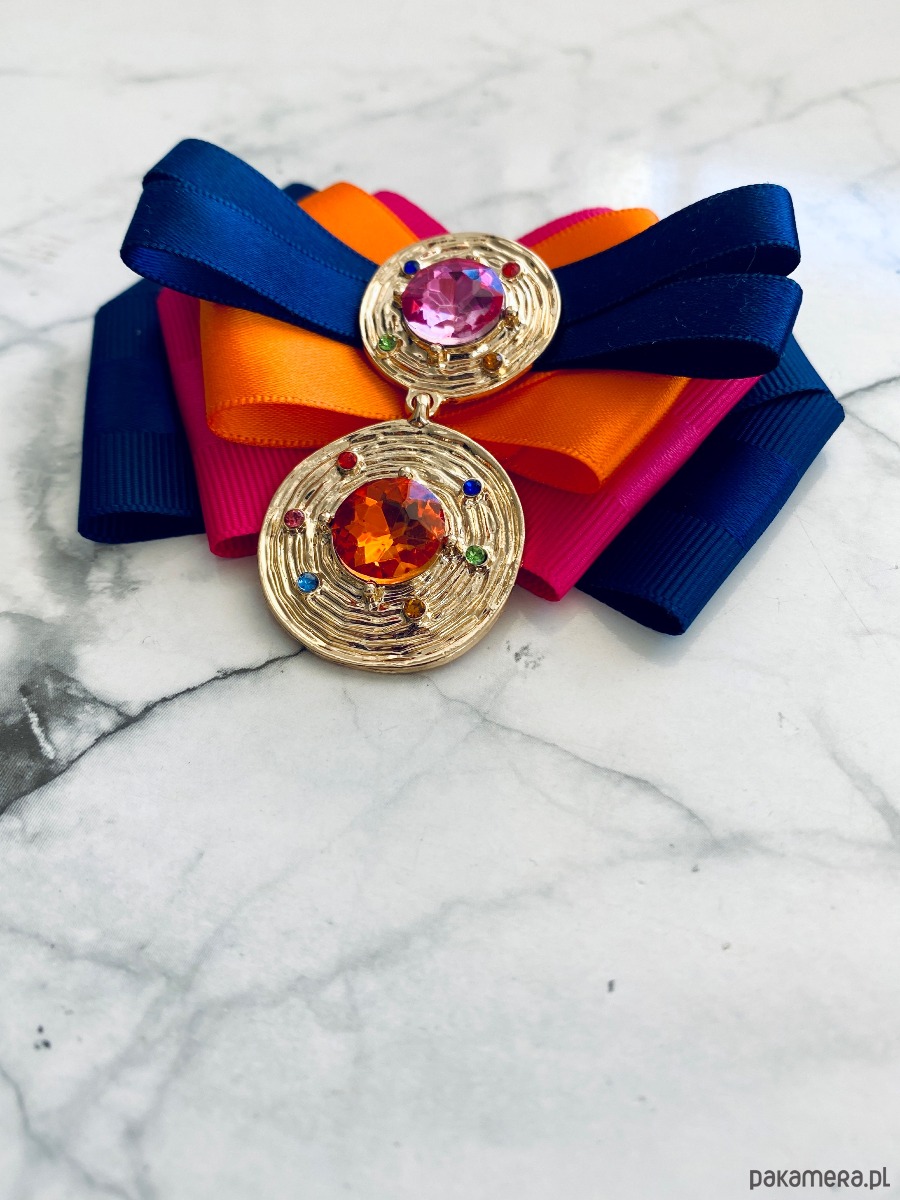 Broszka wykonana z wysokiej jakości taśm i dodatków.
