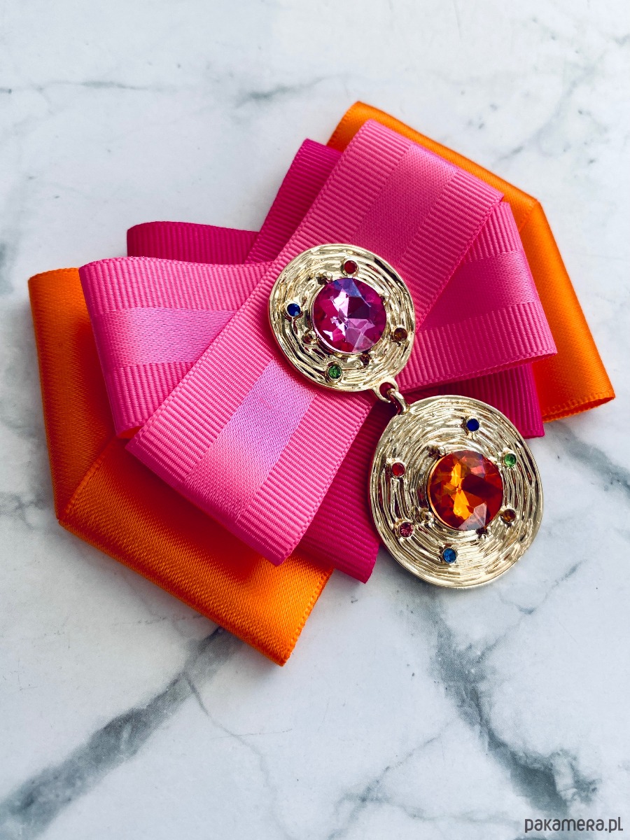 Intensywne Kolory w połączeniu z oryginalną ozdobą biżuteryjną tworzą duet niebanalny i zachwycający. Dwa złote okręgi z kryształami w kolorze fuksji i pomarańczu. Dodatkowo delikatne kolorowe drobne kryształki.