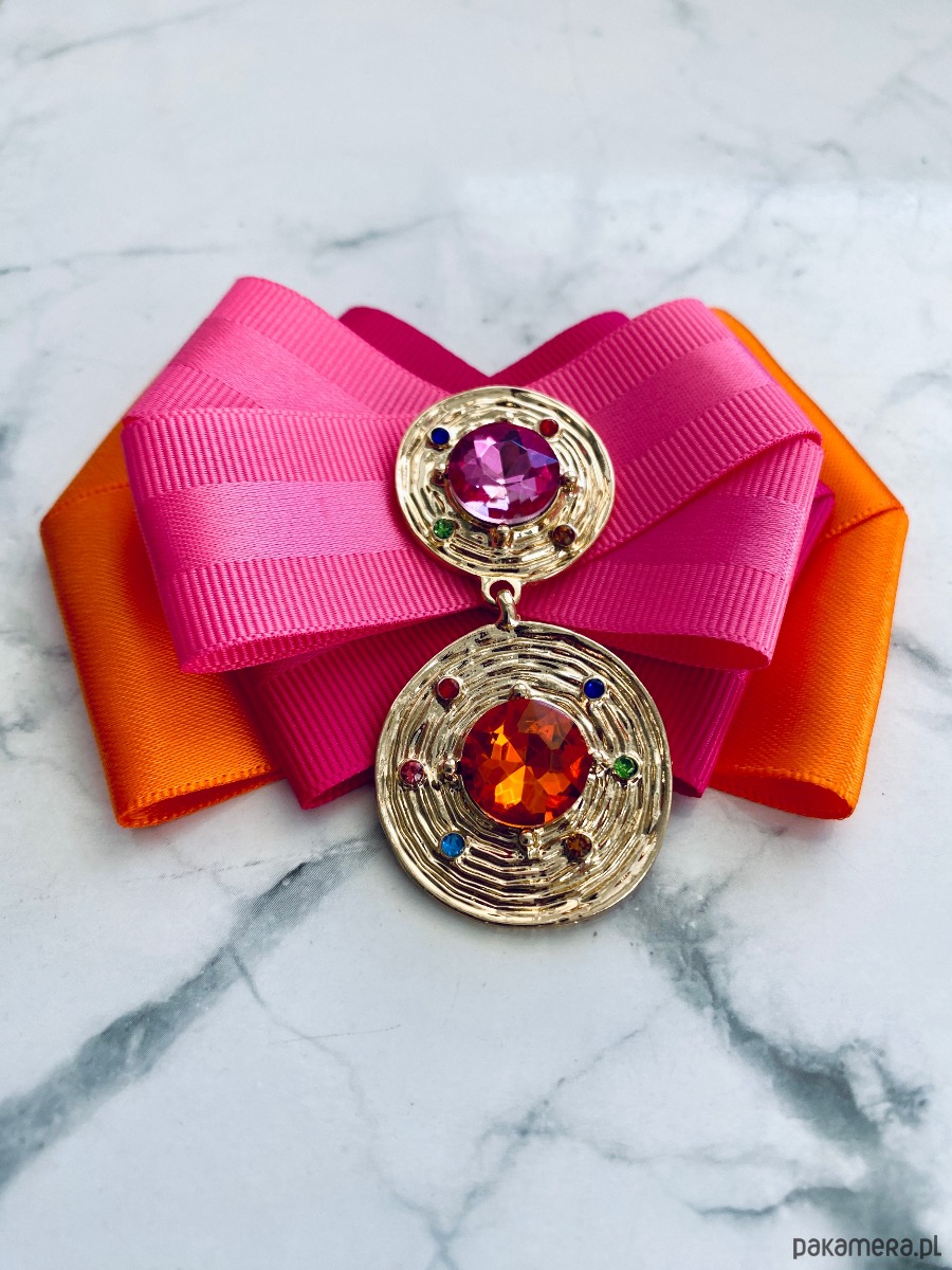 Intensywne Kolory w połączeniu z oryginalną ozdobą biżuteryjną tworzą duet niebanalny i zachwycający. Dwa złote okręgi z kryształami w kolorze fuksji i pomarańczu. Dodatkowo delikatne kolorowe drobne kryształki.