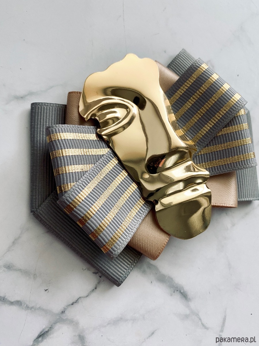 Na środku imponująca ozdoba biżuteryjna, odlew pół twarzy wykonany z metalu.