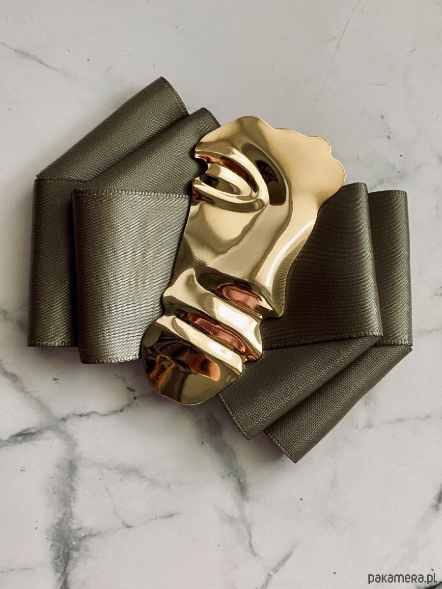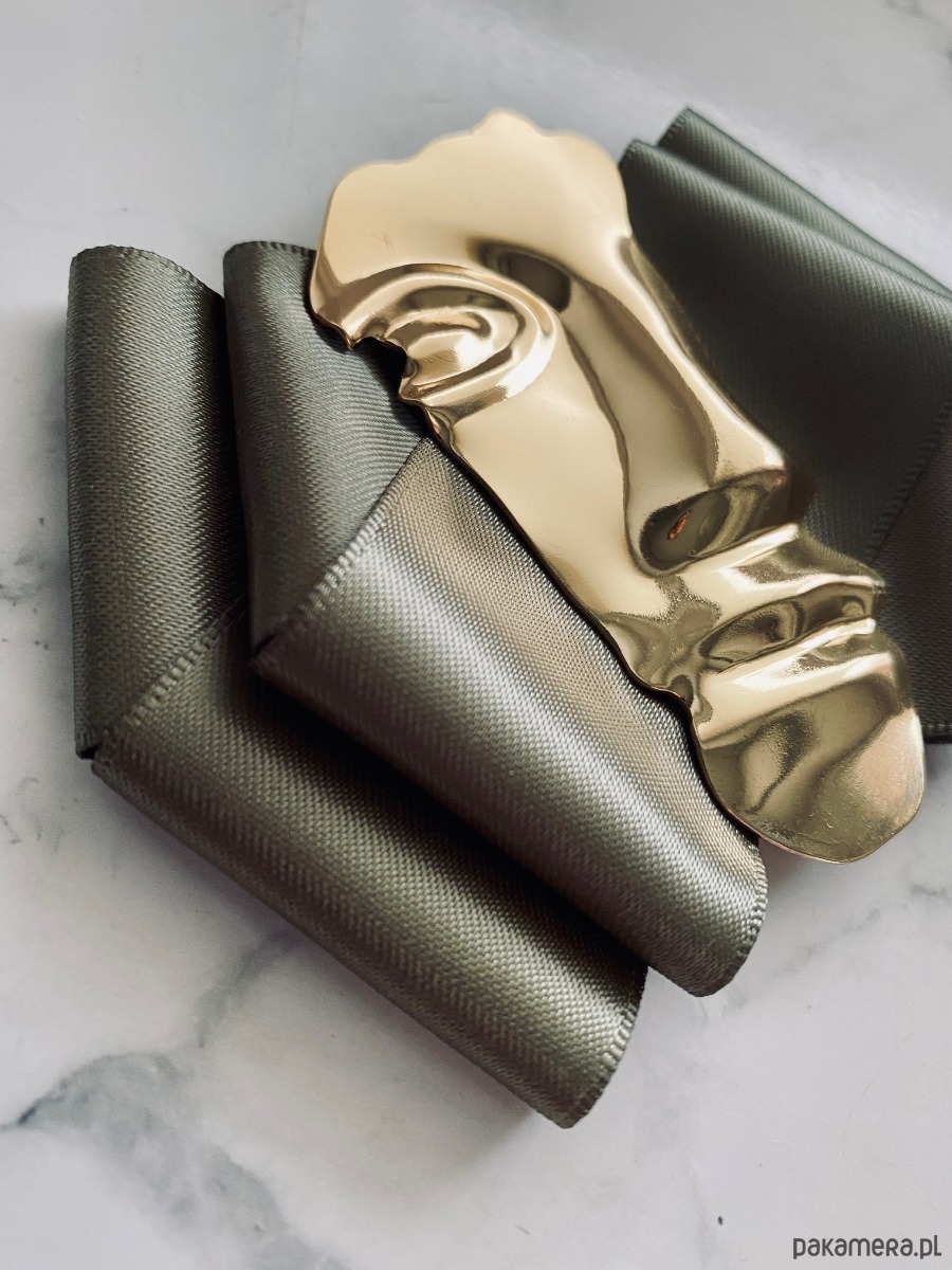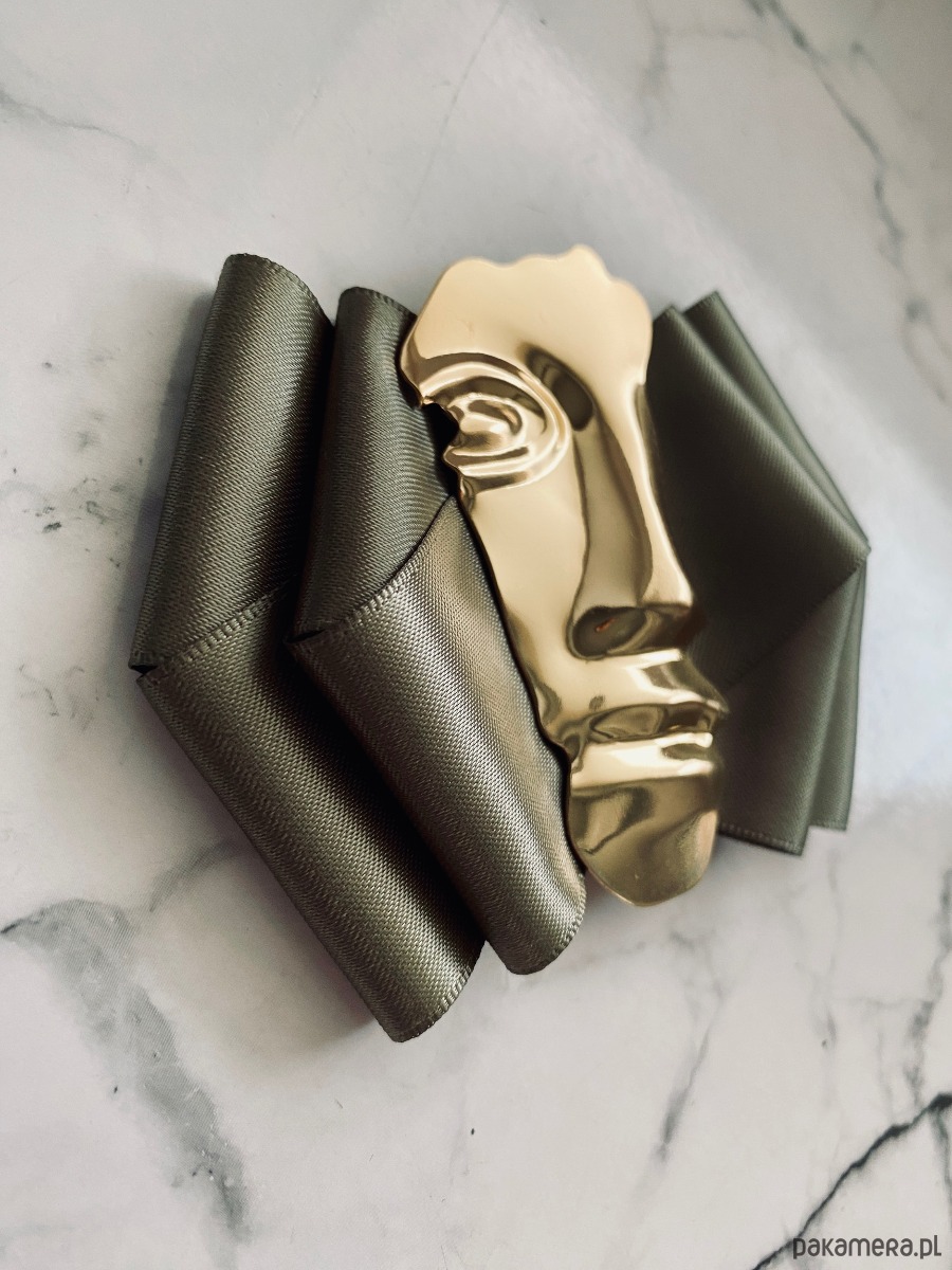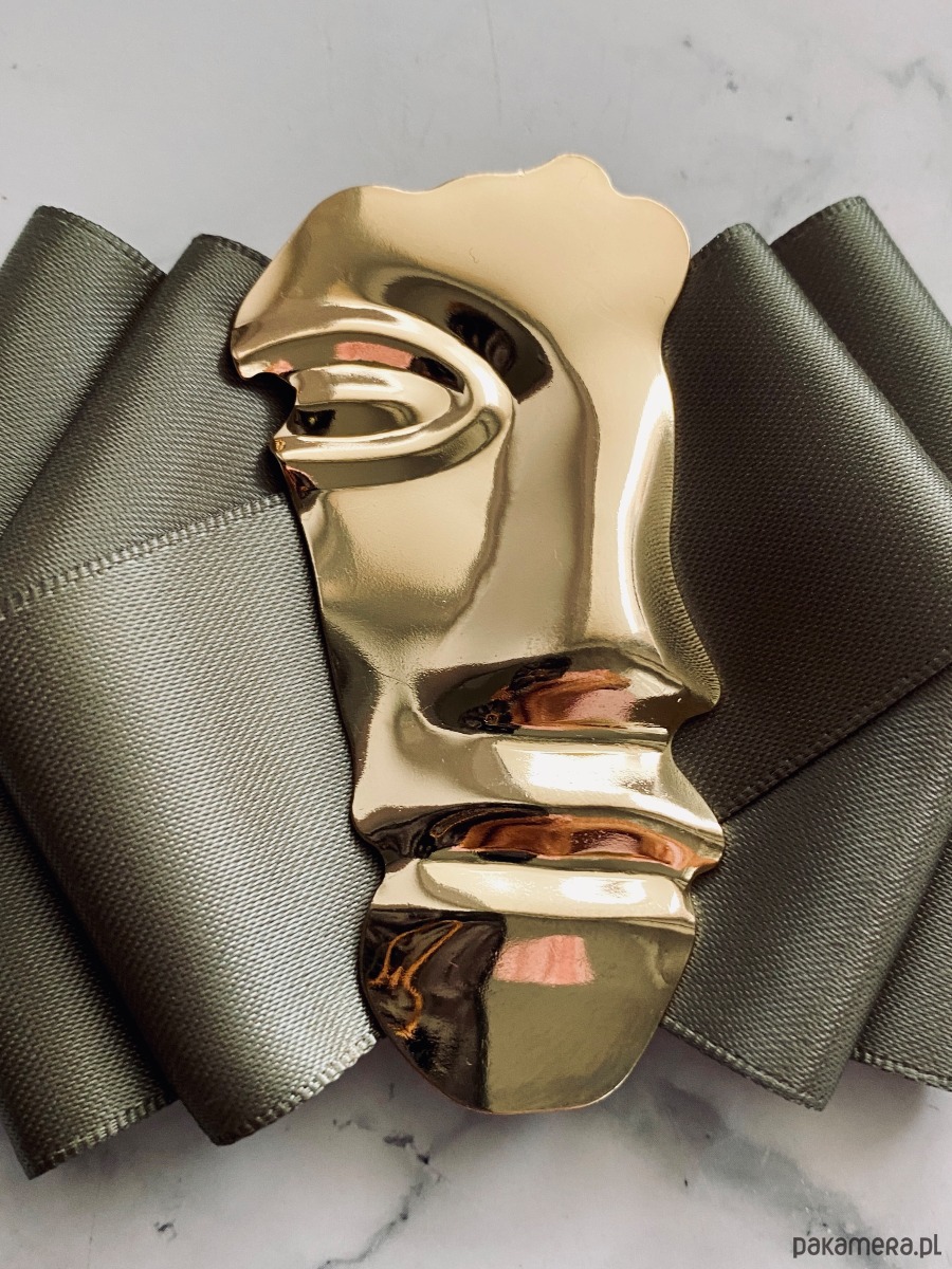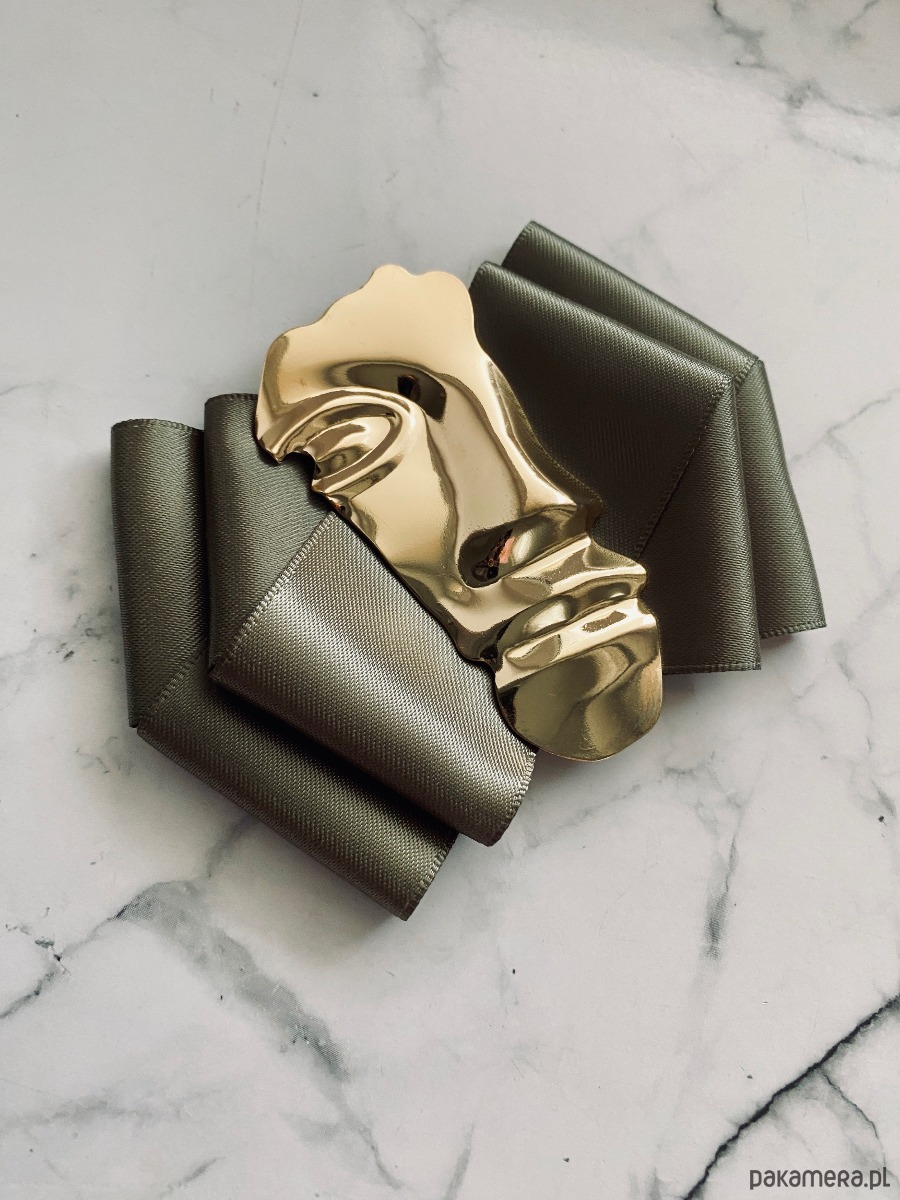 Na środku imponująca ozdoba biżuteryjna, odlew pół twarzy wykonany z metalu.