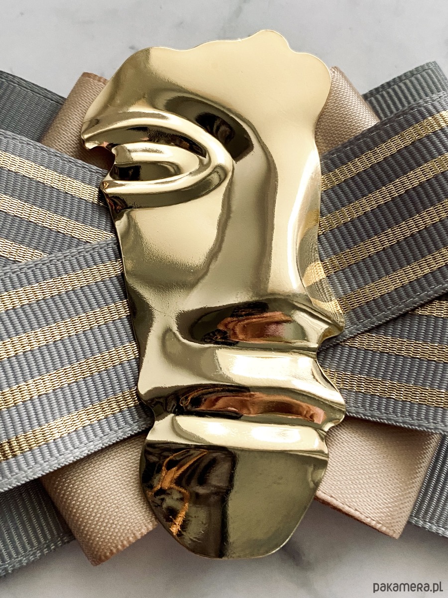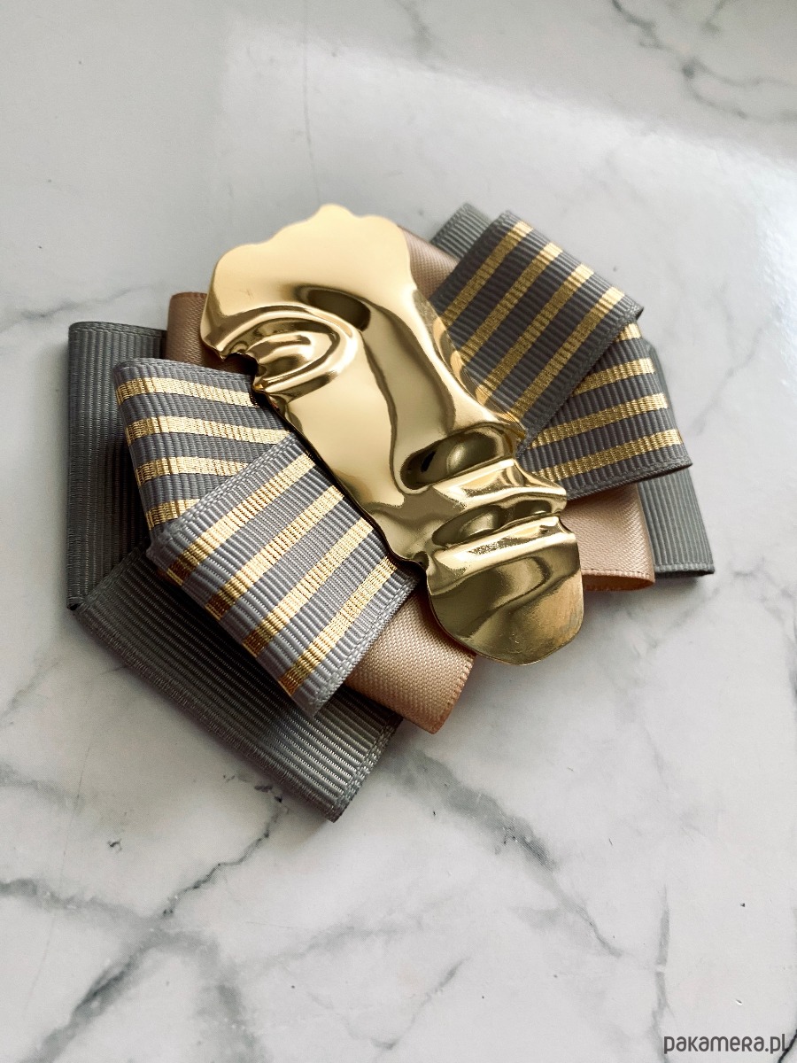 Na środku imponująca ozdoba biżuteryjna, odlew pół twarzy wykonany z metalu.