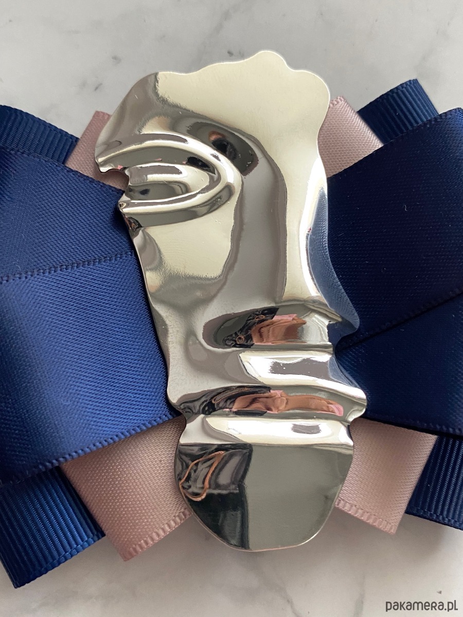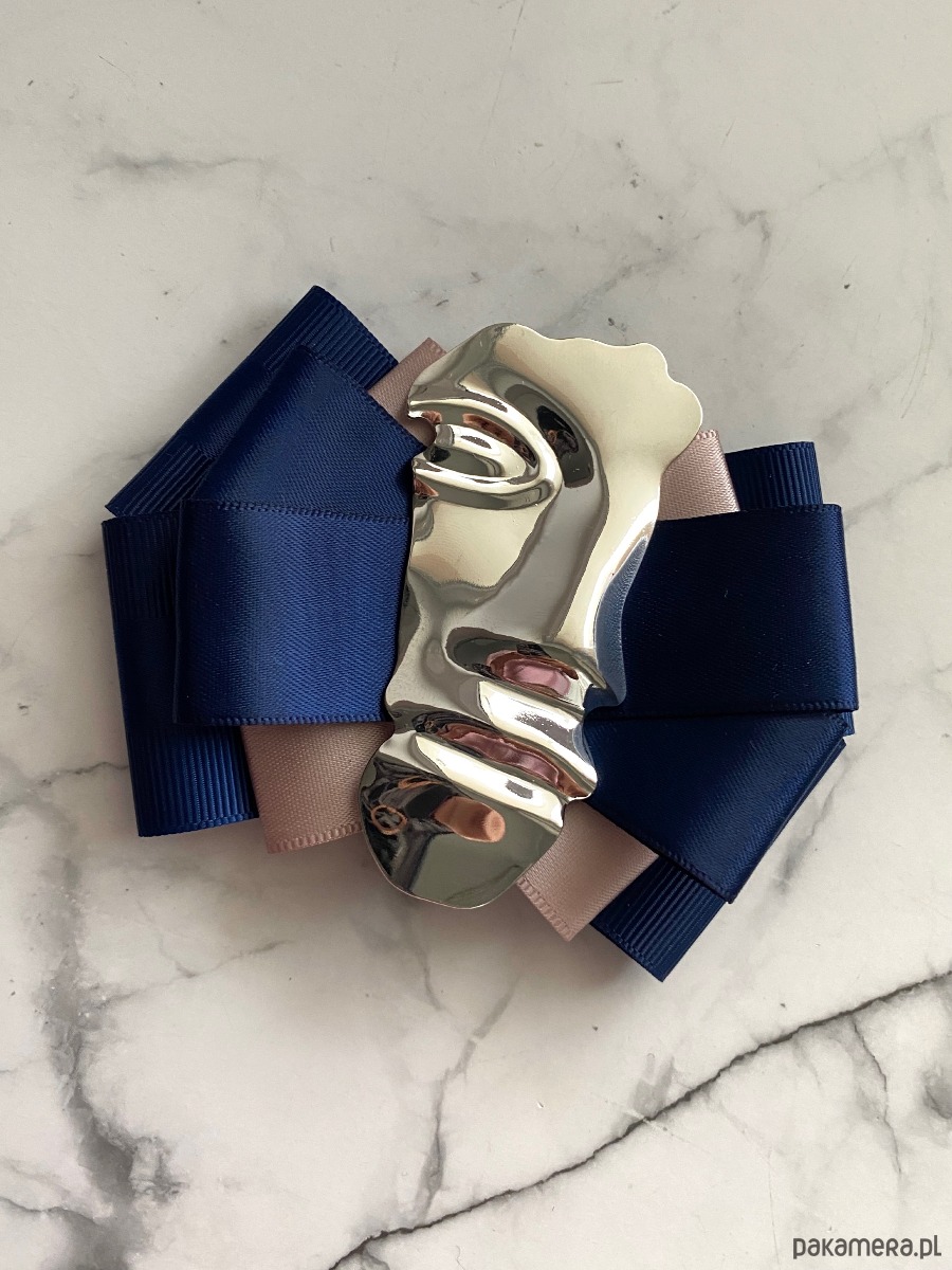 Na środku imponująca ozdoba biżuteryjna, odlew pół twarzy wykonany z metalu.