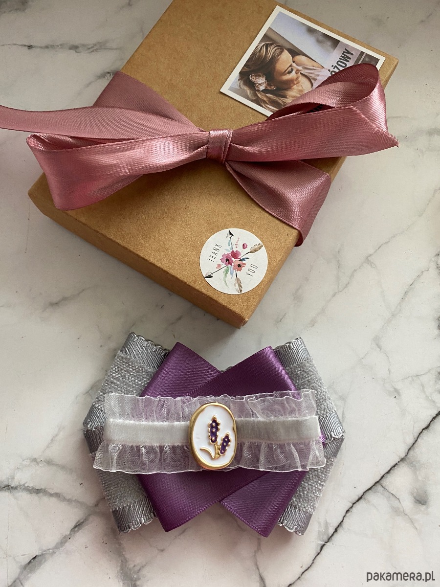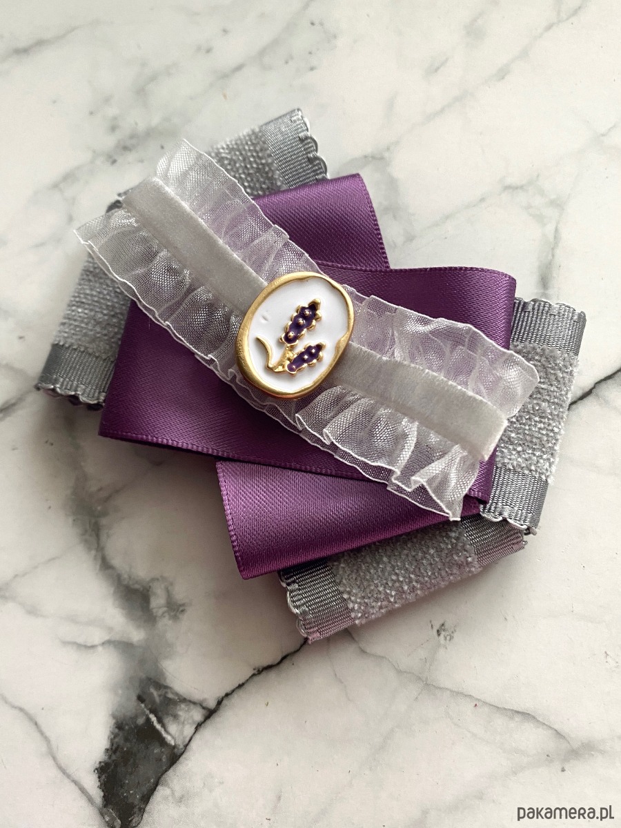 Delikatna i bardzo kobieca Brosza w odcieniach fioletu z subtelną ozdobą biżuteryjną.