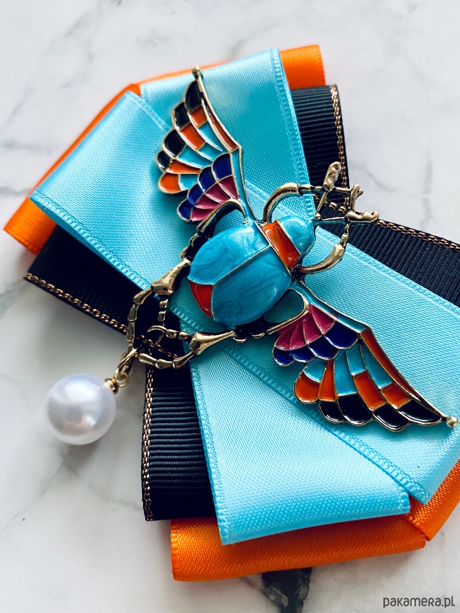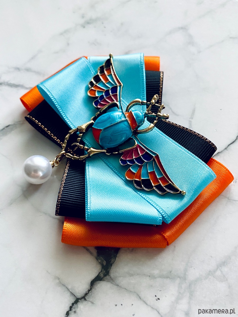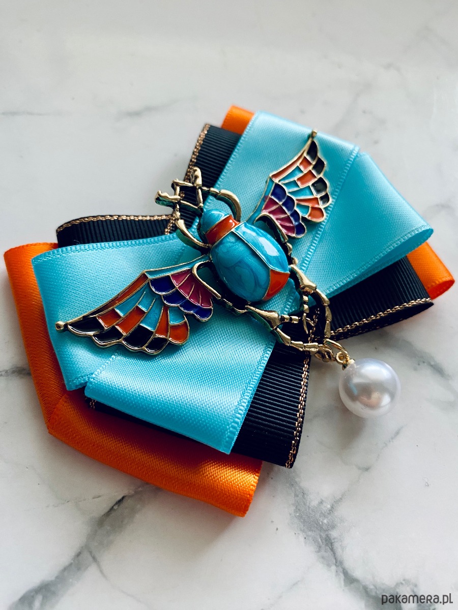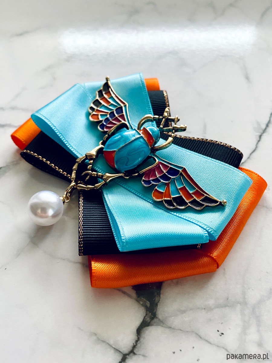 Broszka wykonana z wysokiej jakości taśm i dodatków.